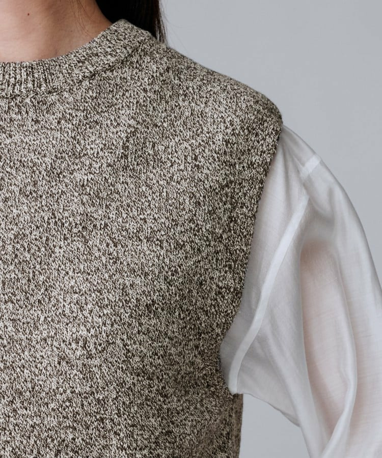 絹紡糸の生産工程で発生する短い落綿を糸にした、素朴な素材感が特徴のシルク100%の軸糸(ノイルヤーン)と、先染の1/48ウール梳毛糸2本を撚り合わせた、ツイードの様な杢調の表面感が特徴のUNTITLEDオリジナル素材。
