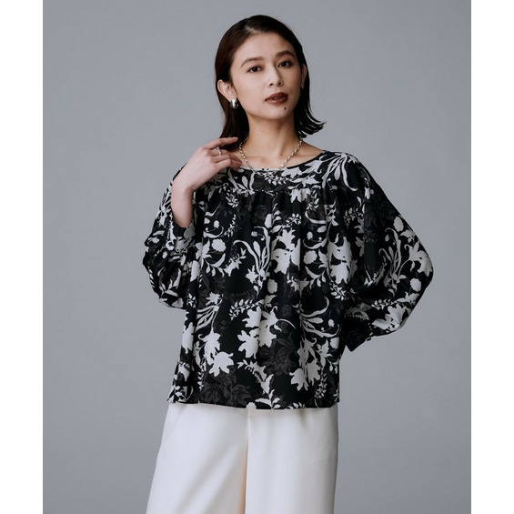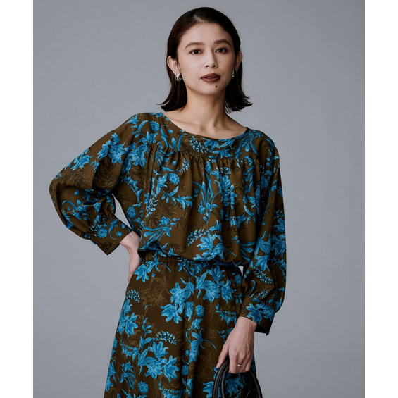 プリントは繊細なタッチや配色で表現し、身頃と袖にたっぷりギャザーを配した贅沢なブラウスです。