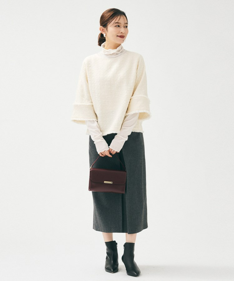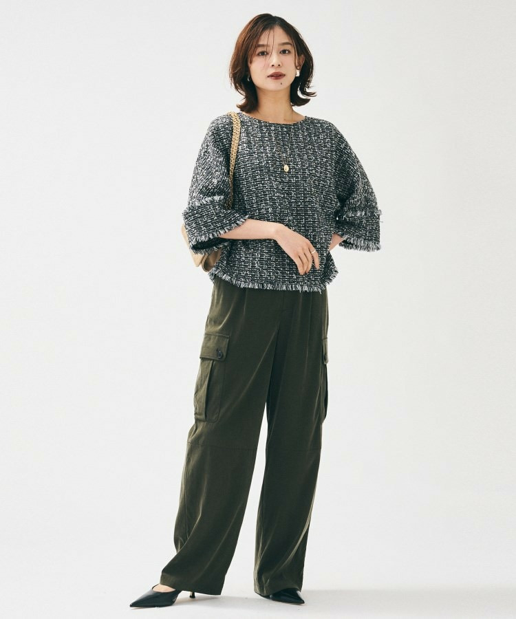 ドルマンスリーブのゆったりとしたシルエットが、体型をさりげなくカバーしながら、抜け感のあるスタイルを演出します。