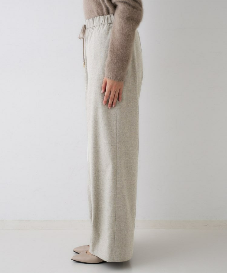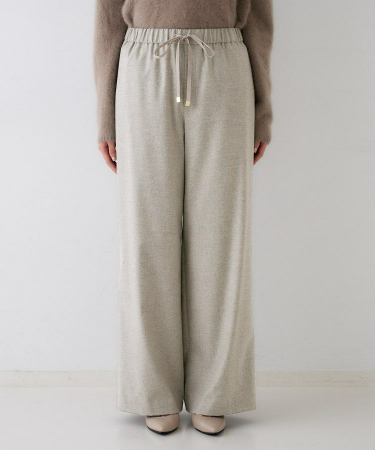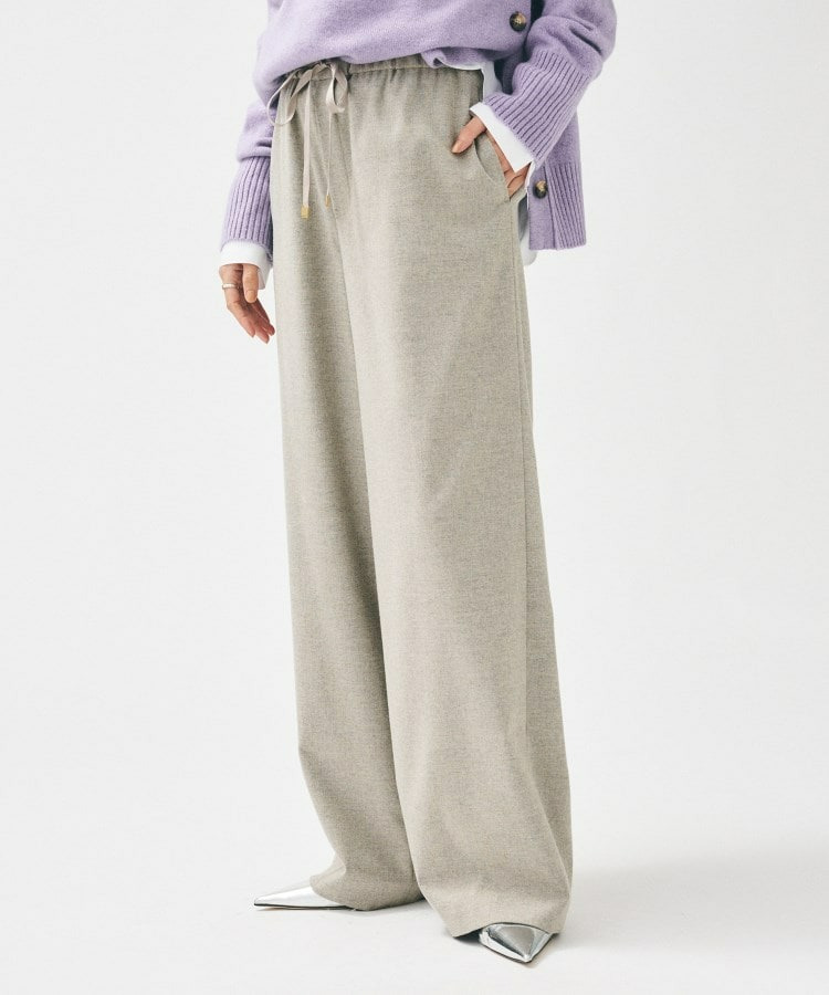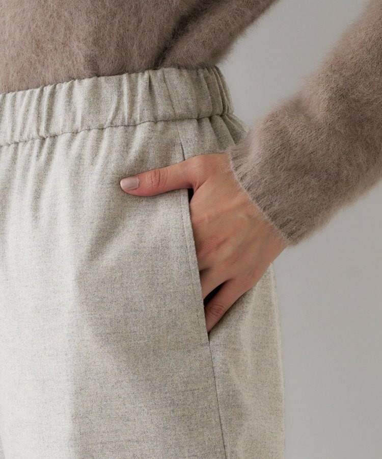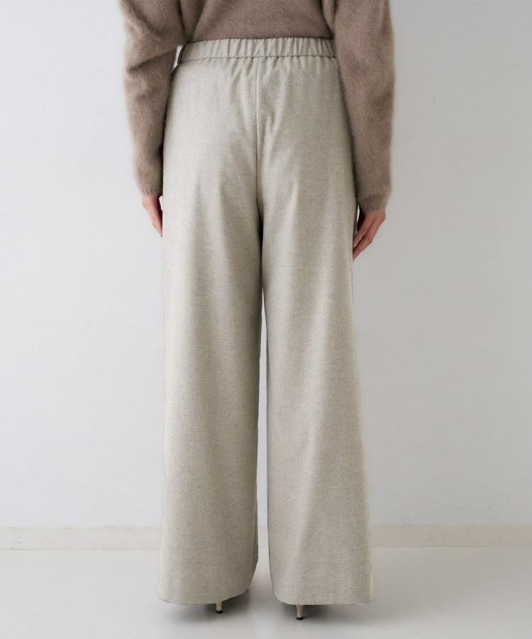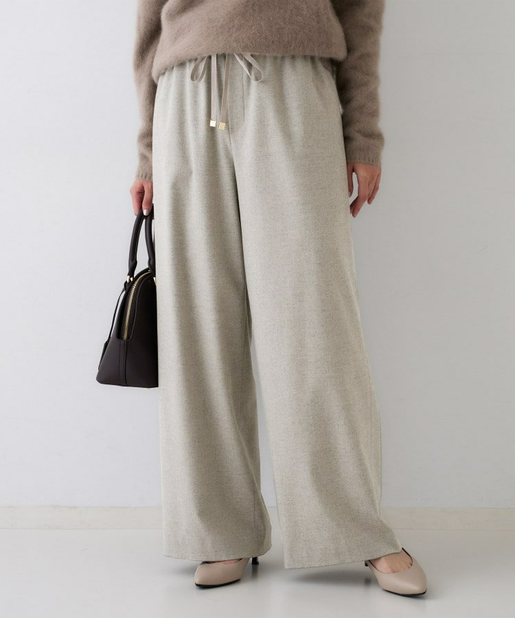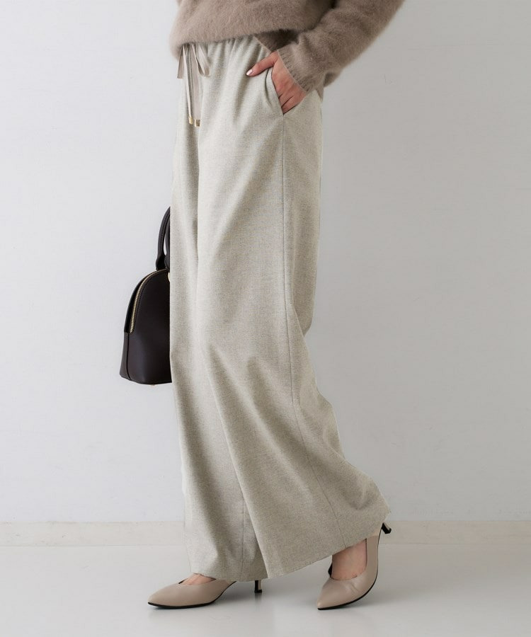 ウールサキソニーのワイドパンツは、柔らかく滑らかな手触で洗練された印象を与えます。