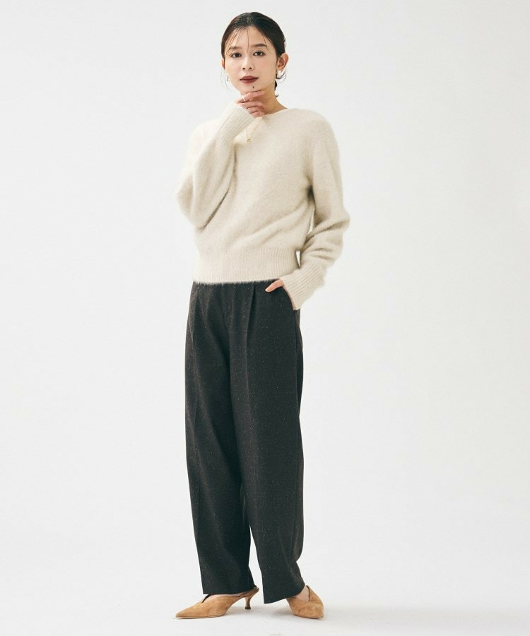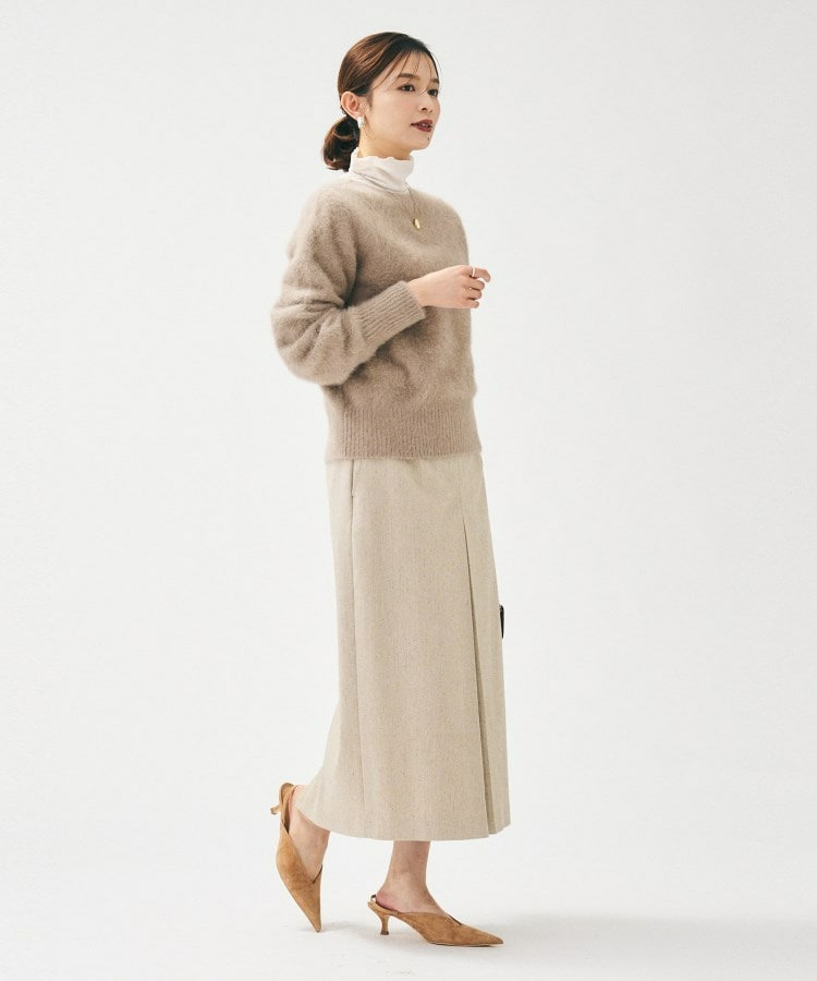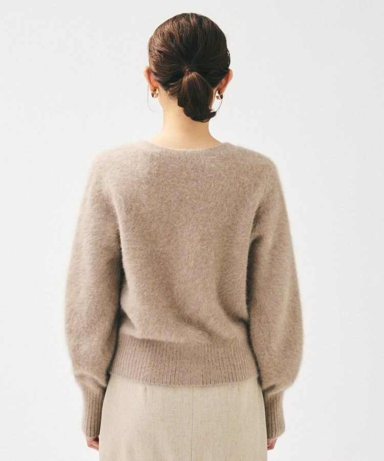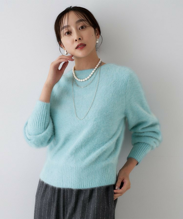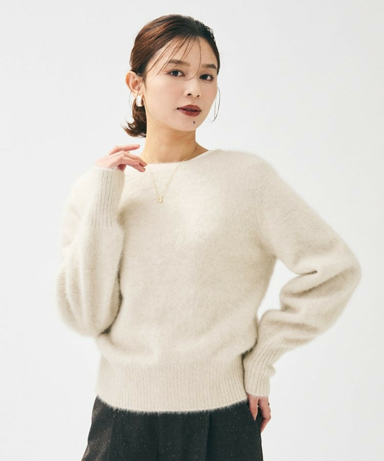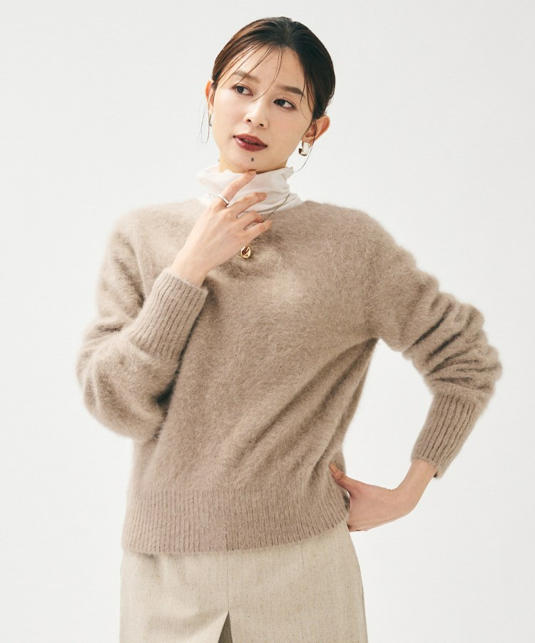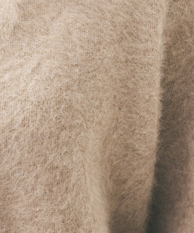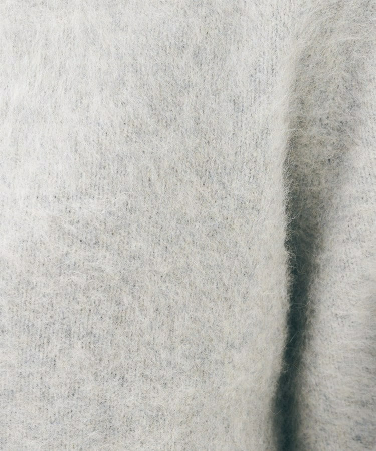 ヘアリーなフォックス高混率に、さらにカシミヤの繊維をブレンドし、しなやかでソフトな手触りや端番手の紡毛糸ならではの暖かみや軽さが特徴の素材。