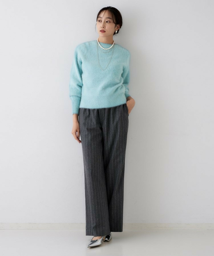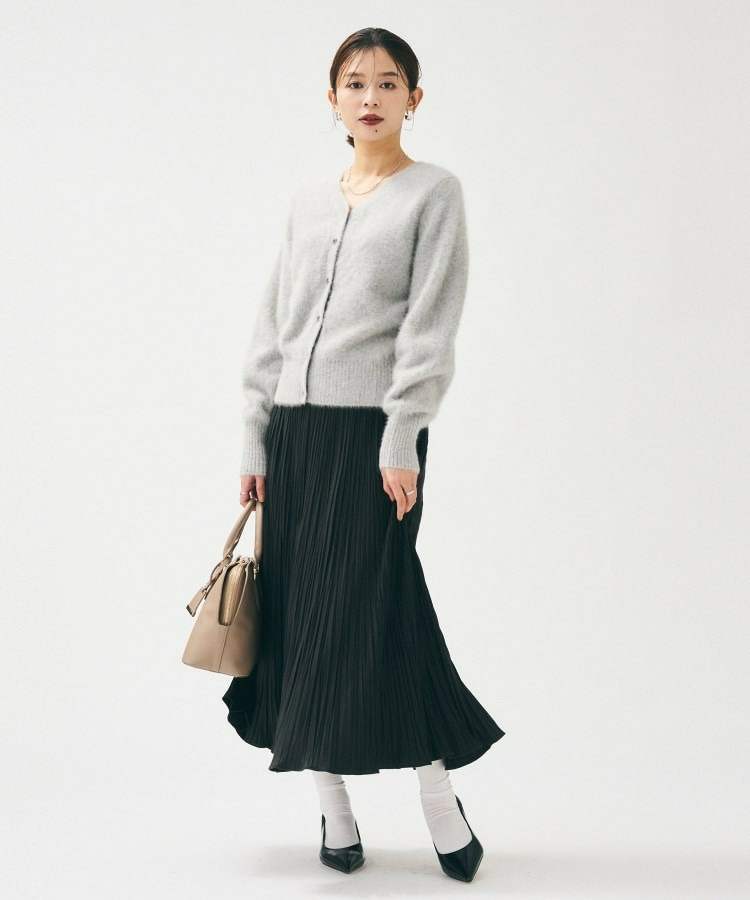 シンプルなデザインには合わせるボトムにはツヤ感やふくらみのあるボリューム系のボトムとも好相性です。