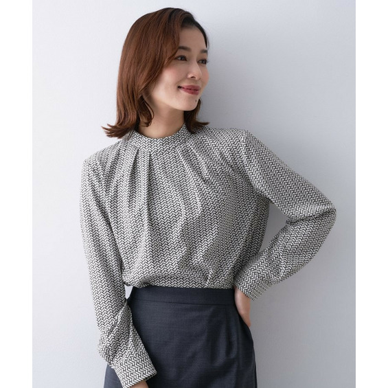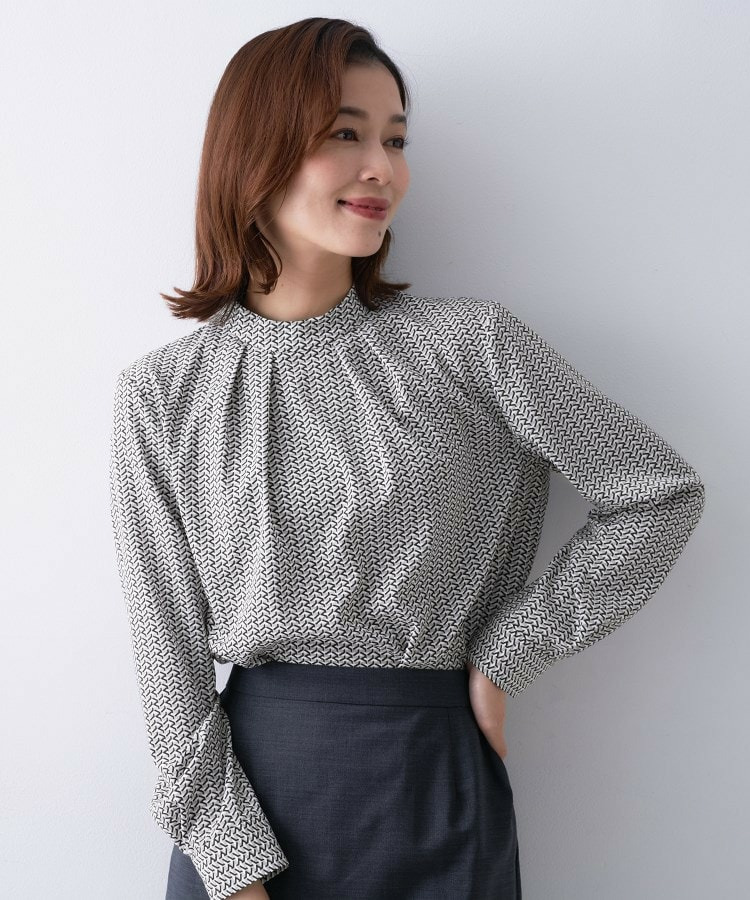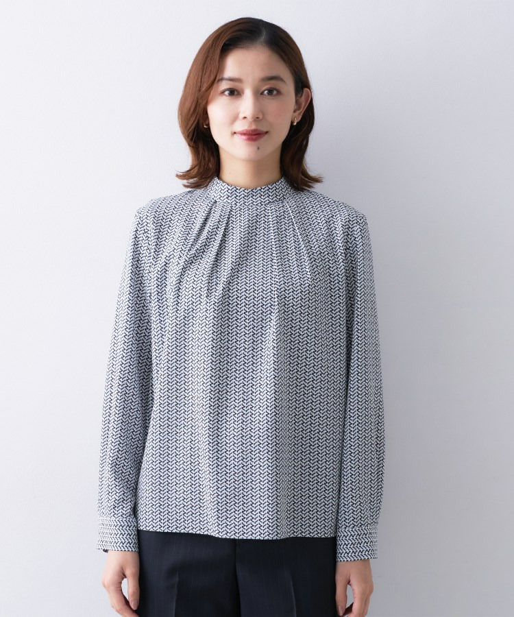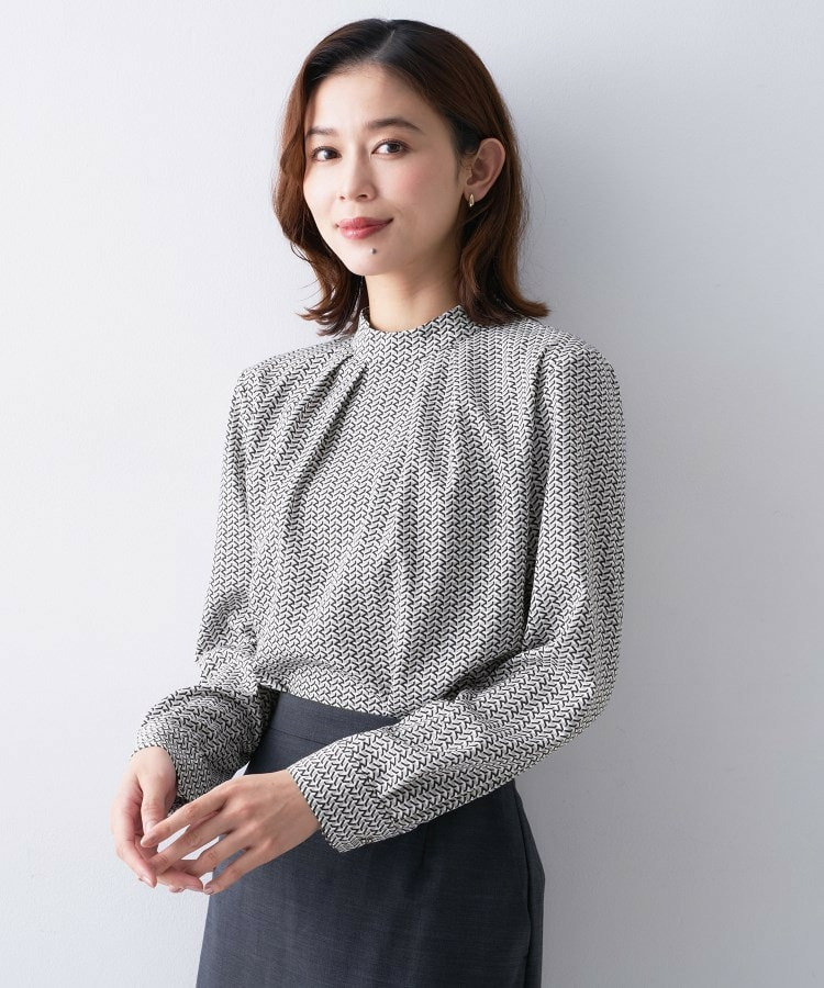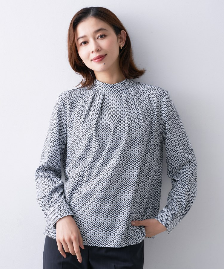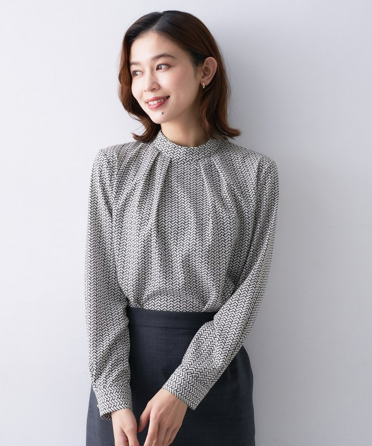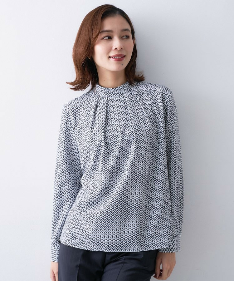 ハイネックデザインでスーツのインナーに着た時のおさまりもよく、フロントタックがちらりと覗くのがポイントです。