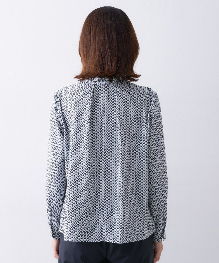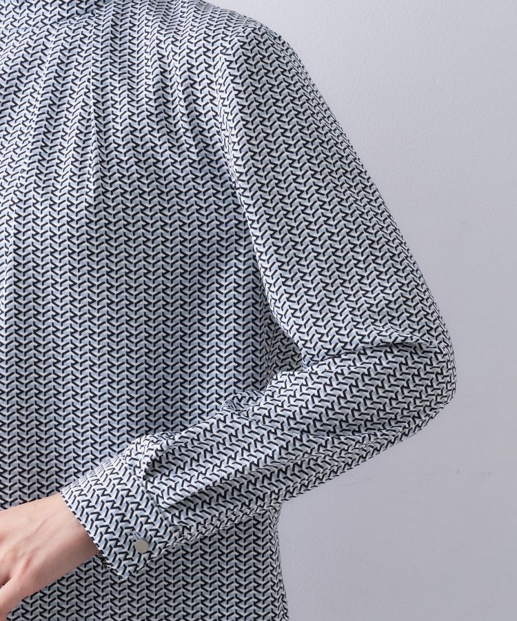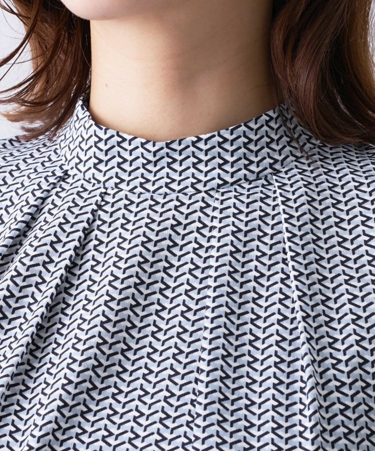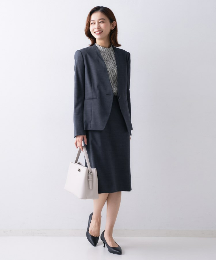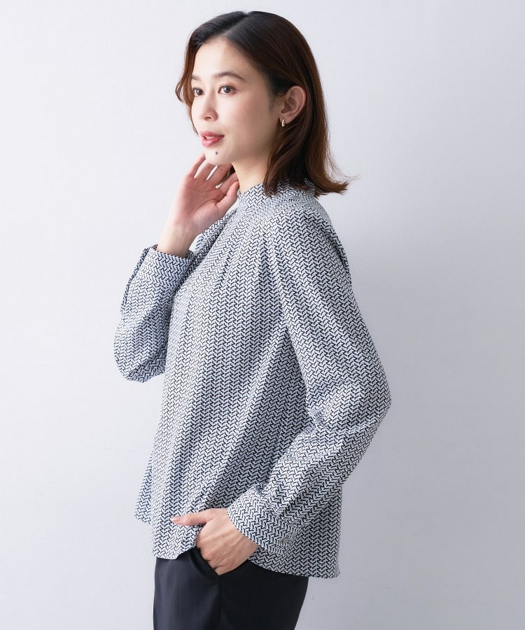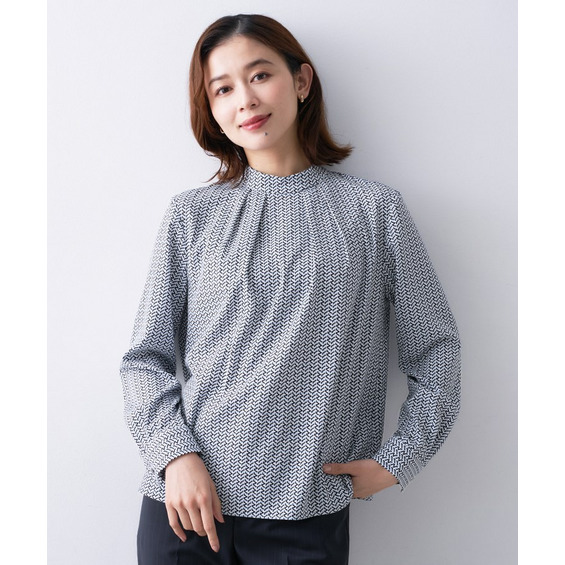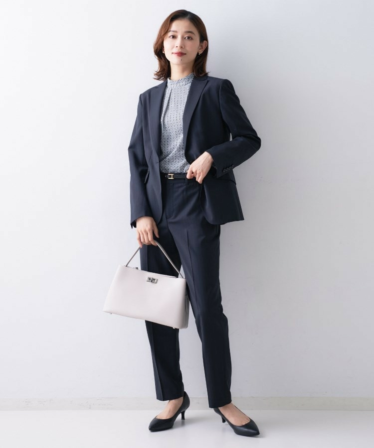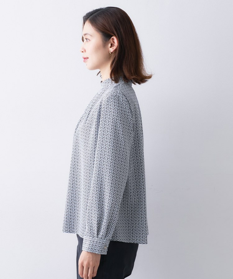 ハイネックデザインでスーツのインナーに着た時のおさまりもよく、フロントタックがちらりと覗くのがポイントです。