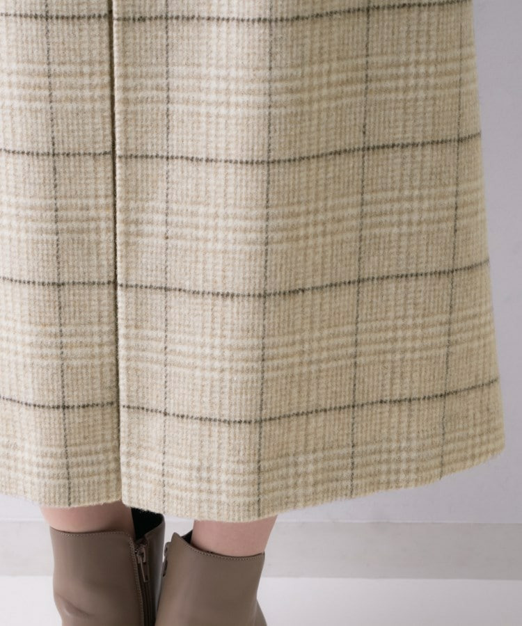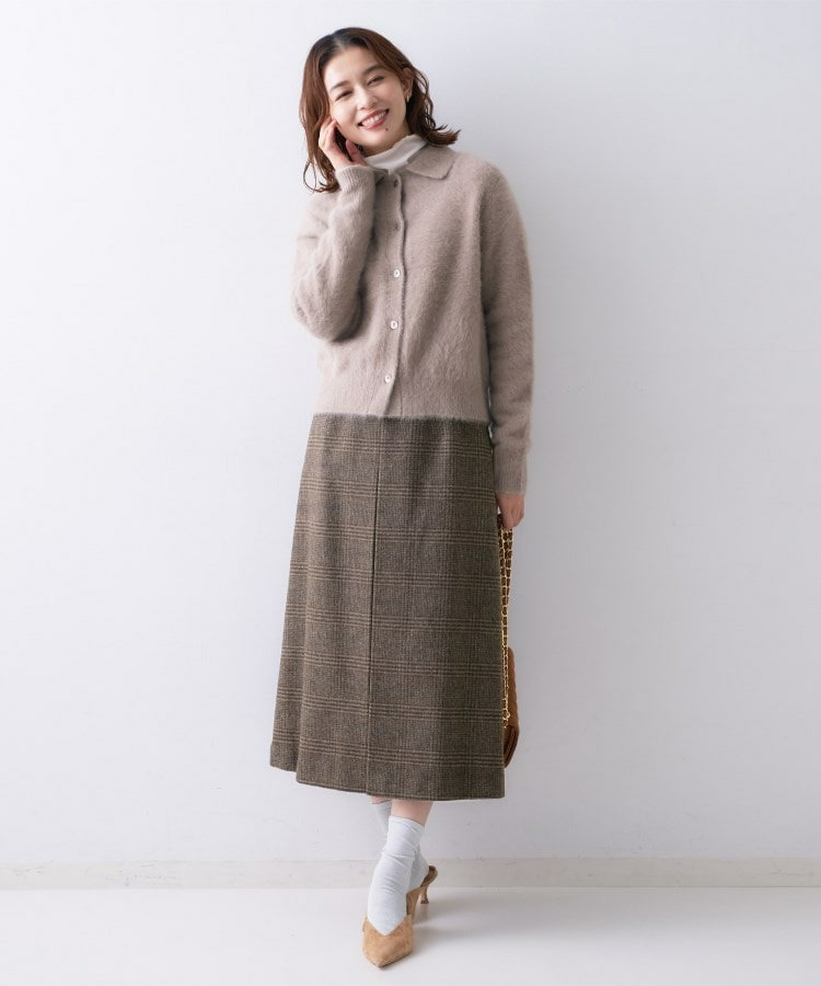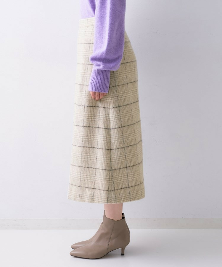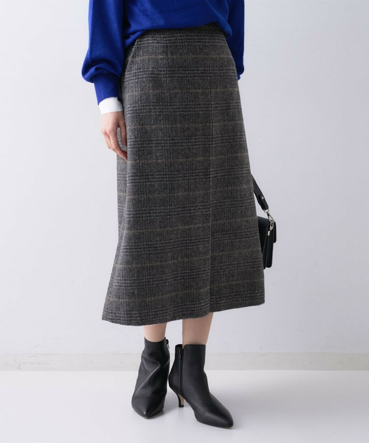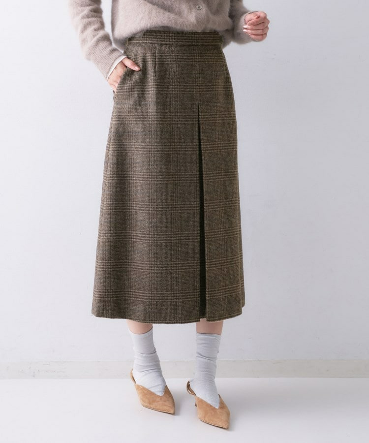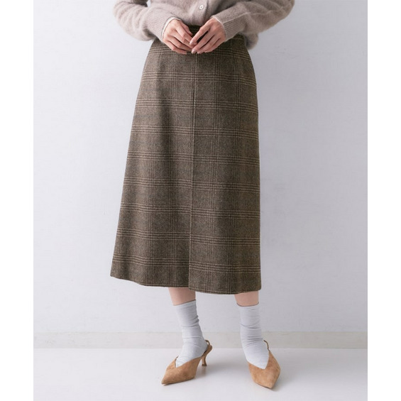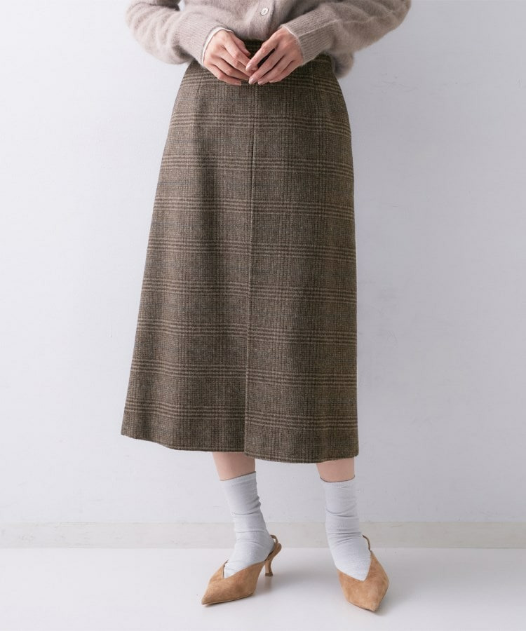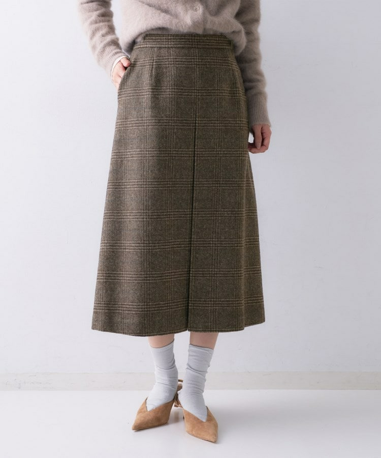 トラディショナルなブリティッシュチェック柄と、ふんわりとしたモッサ仕上げのあたたかみある素材感が魅力のひざ下丈スカート。