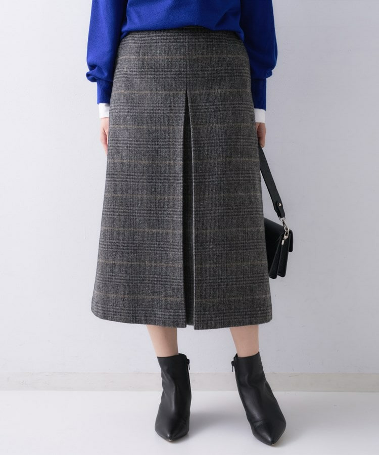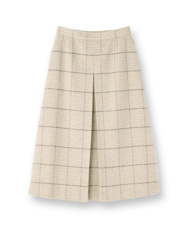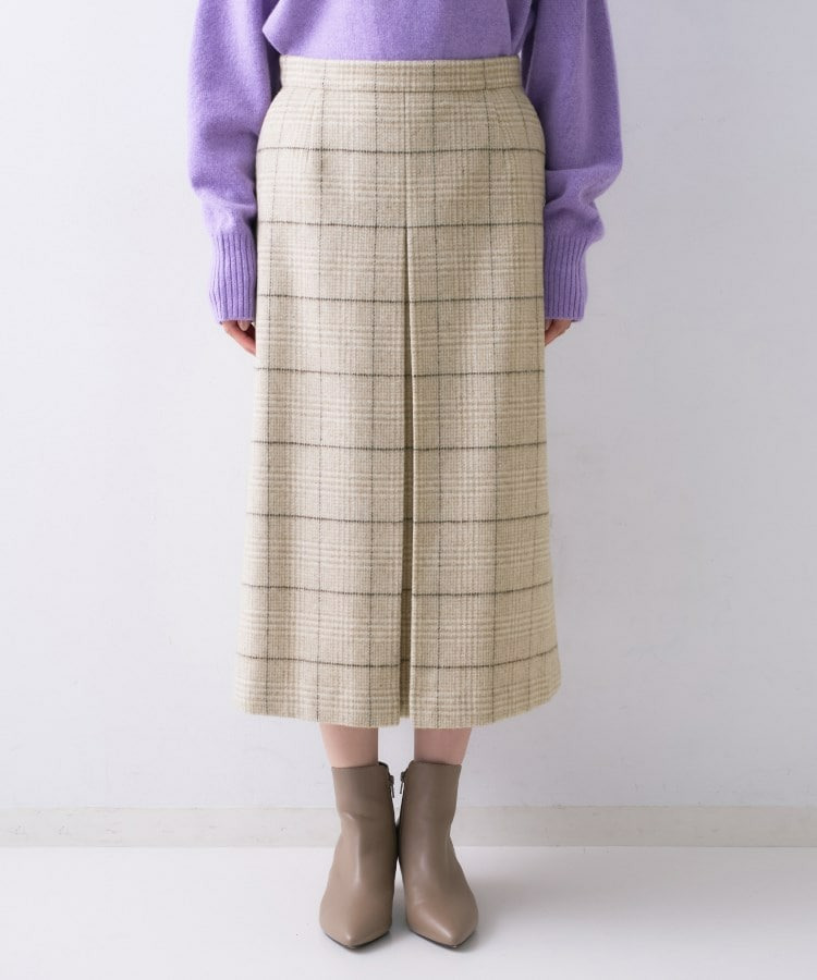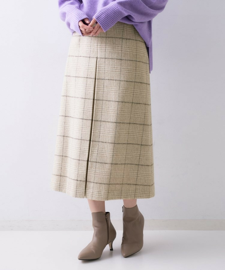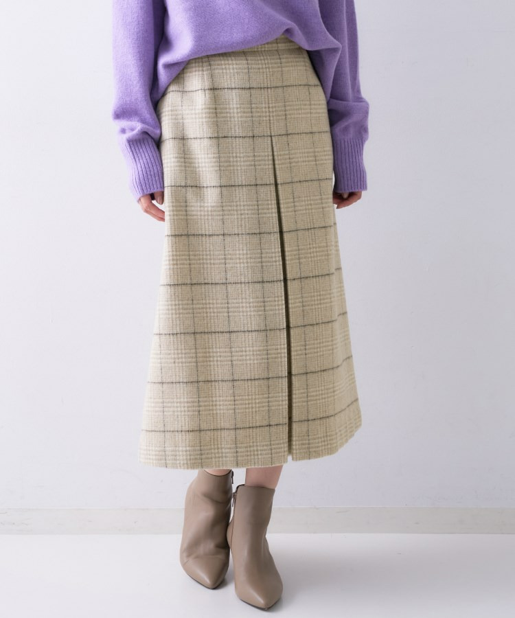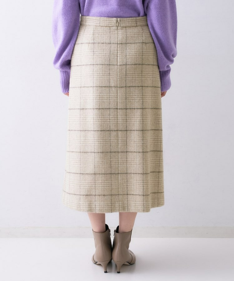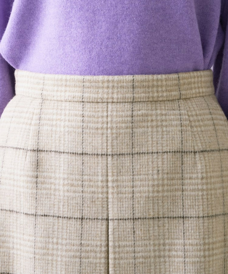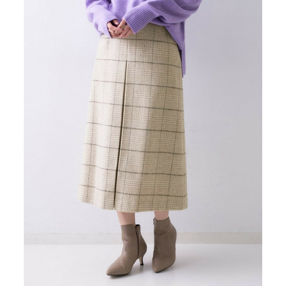 トラディショナルなブリティッシュチェック柄と、ふんわりとしたモッサ仕上げのあたたかみある素材感が魅力のひざ下丈スカート。