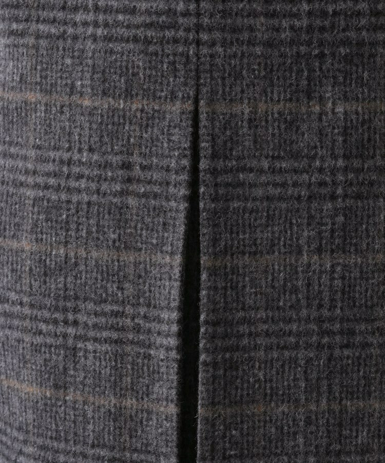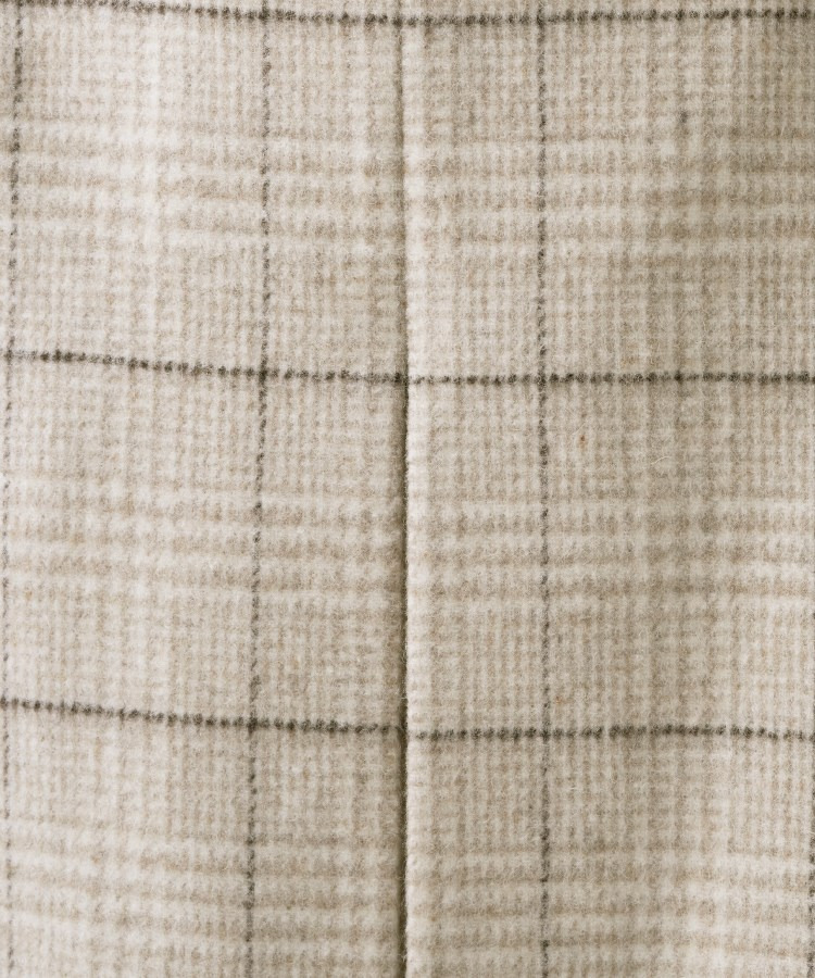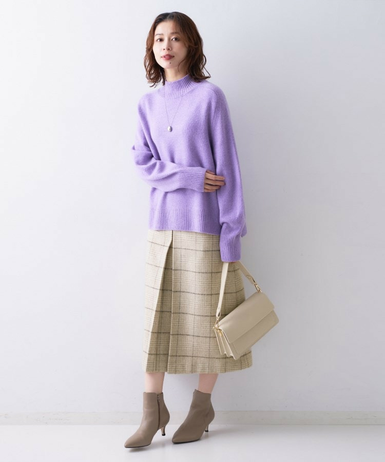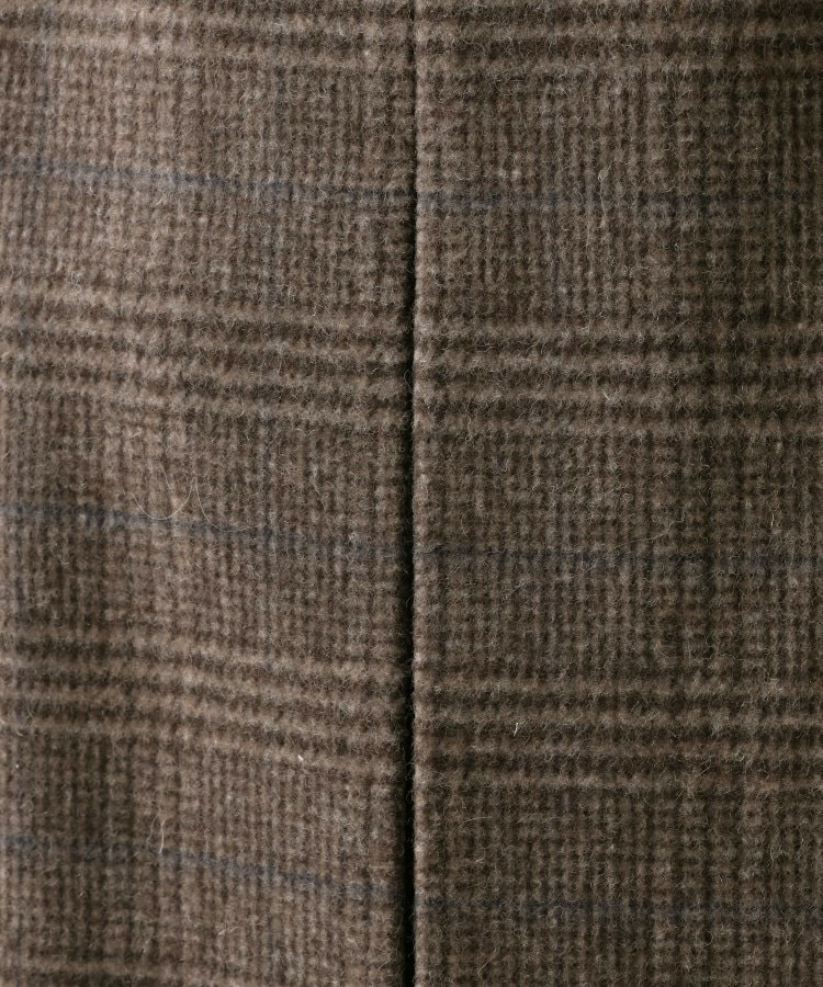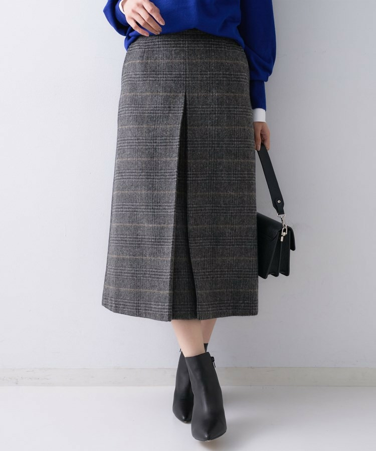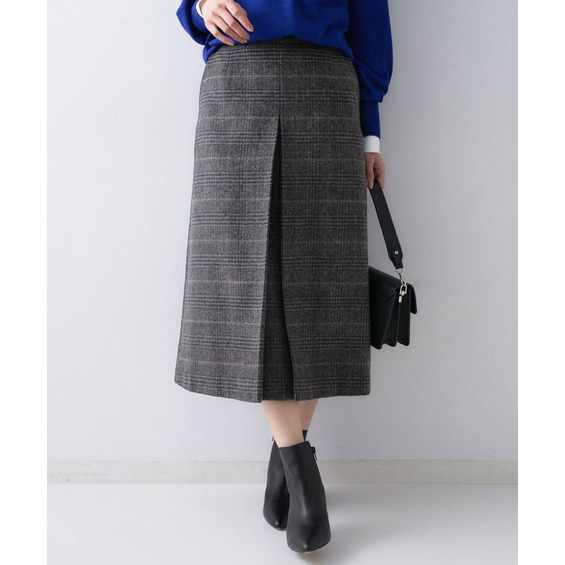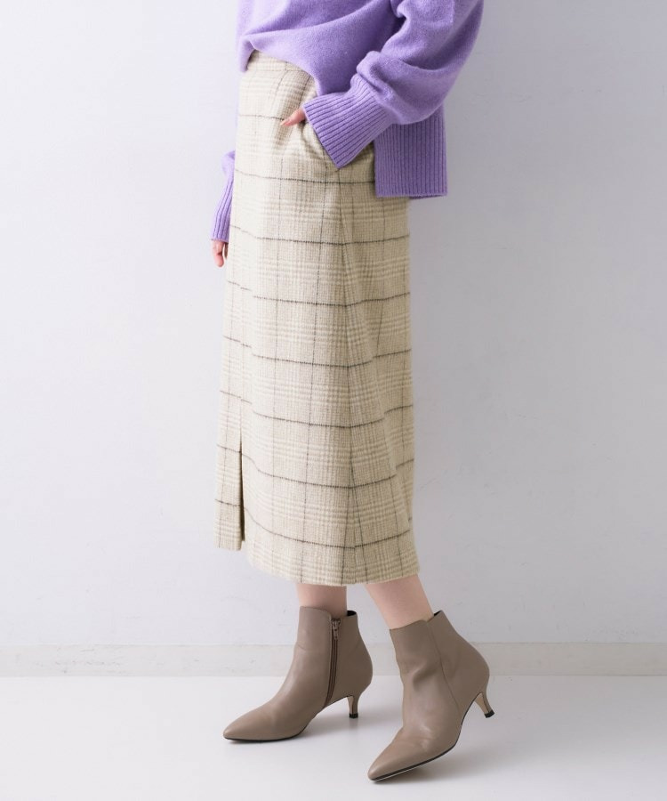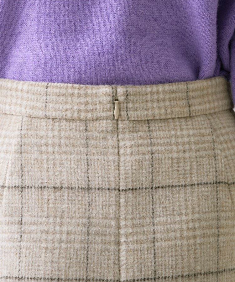 トラディショナルなブリティッシュチェック柄と、ふんわりとしたモッサ仕上げのあたたかみある素材感が魅力のひざ下丈スカート。