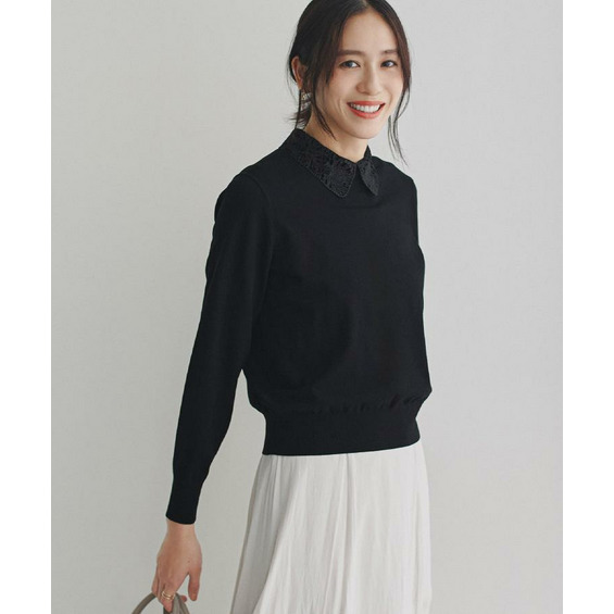 繊細なレース衿が華やぎを添えるニットプルオーバー。