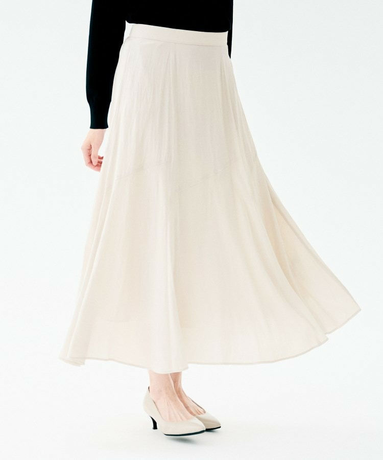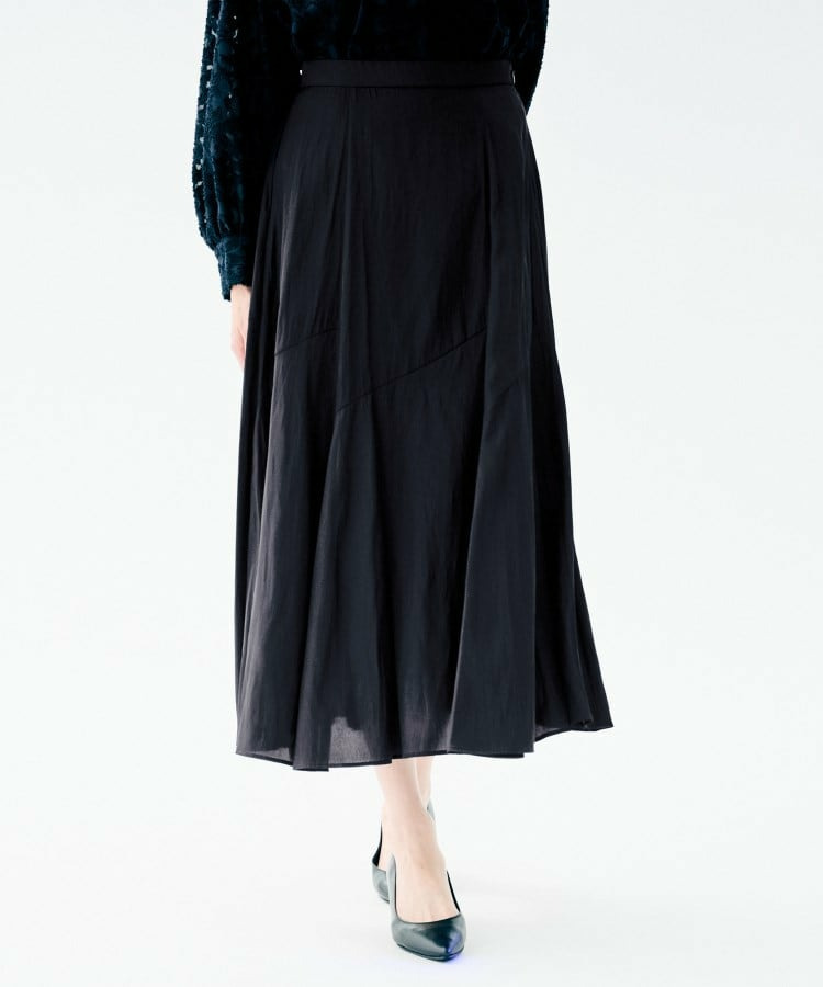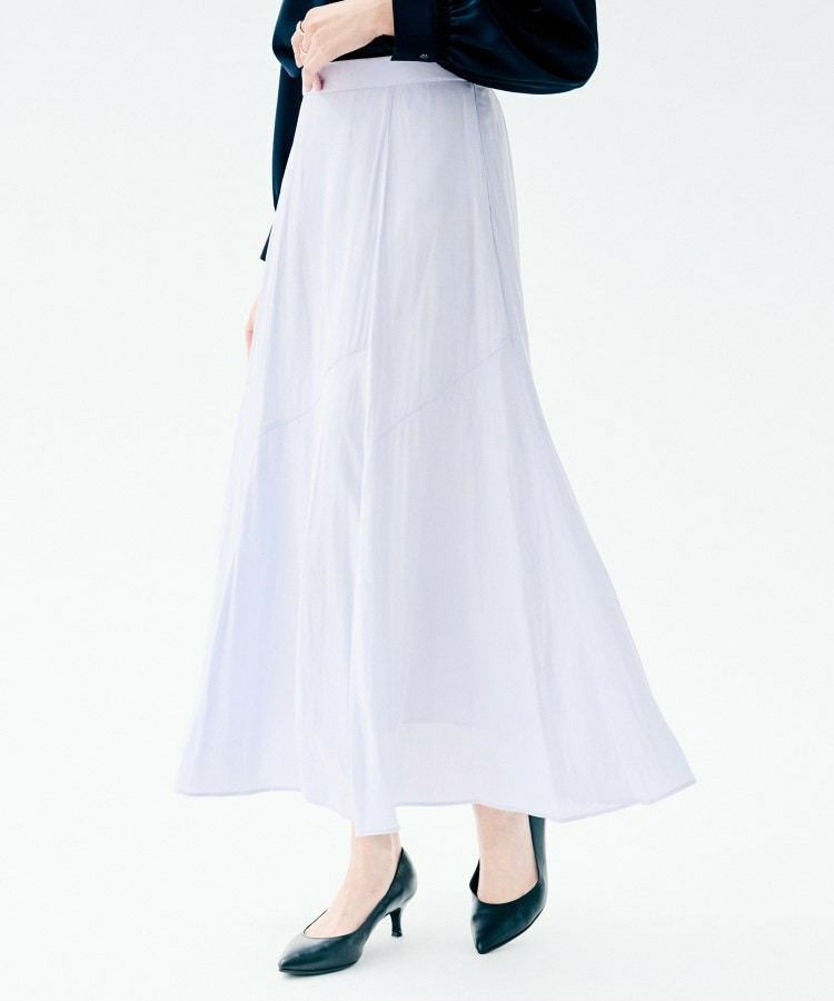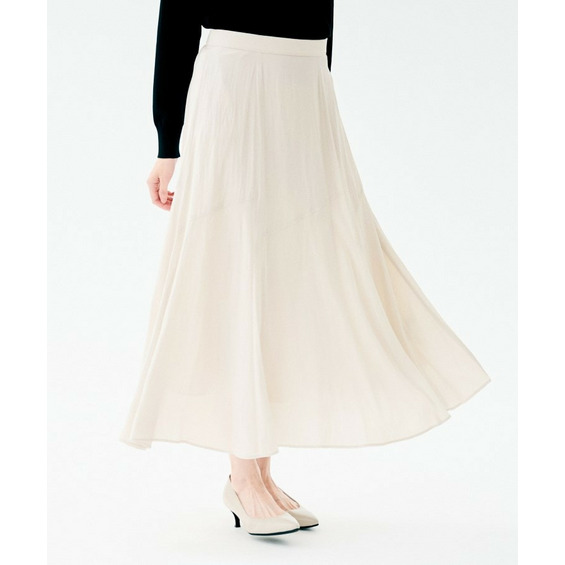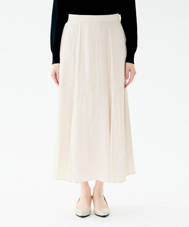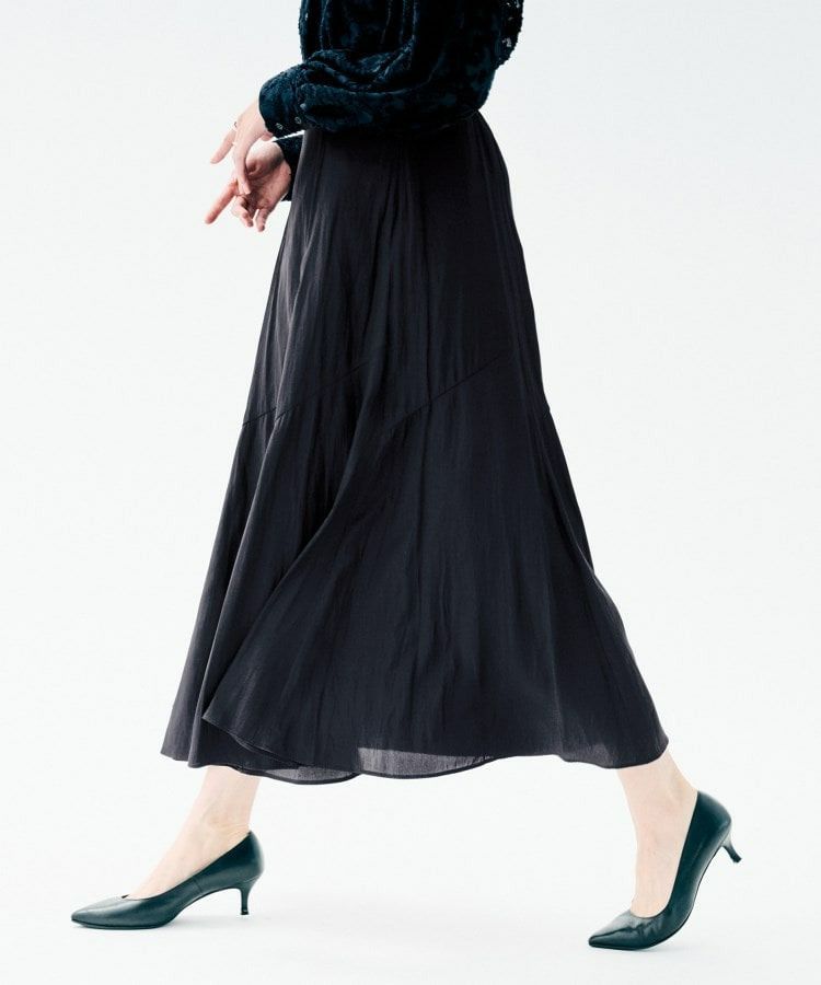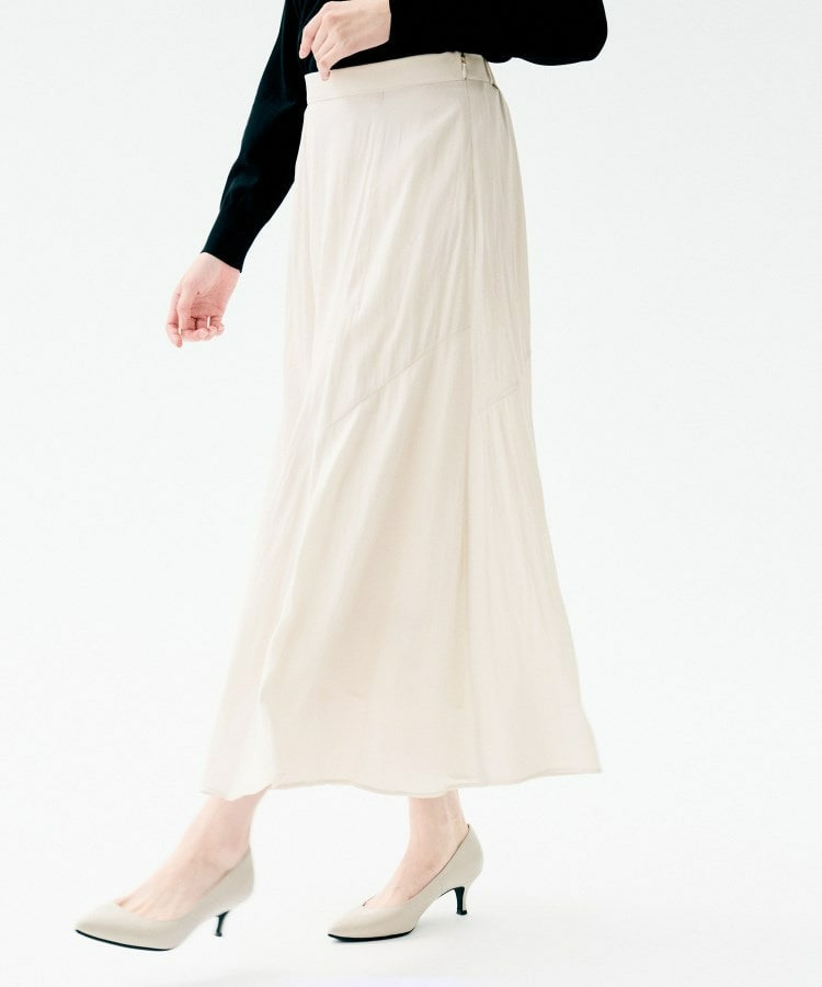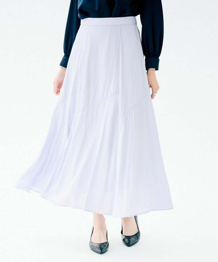 ななめに切り替えラインを施したデザインが特徴のスカートは歩くたびに美しいドレープが生まれ、軽やかな印象に。