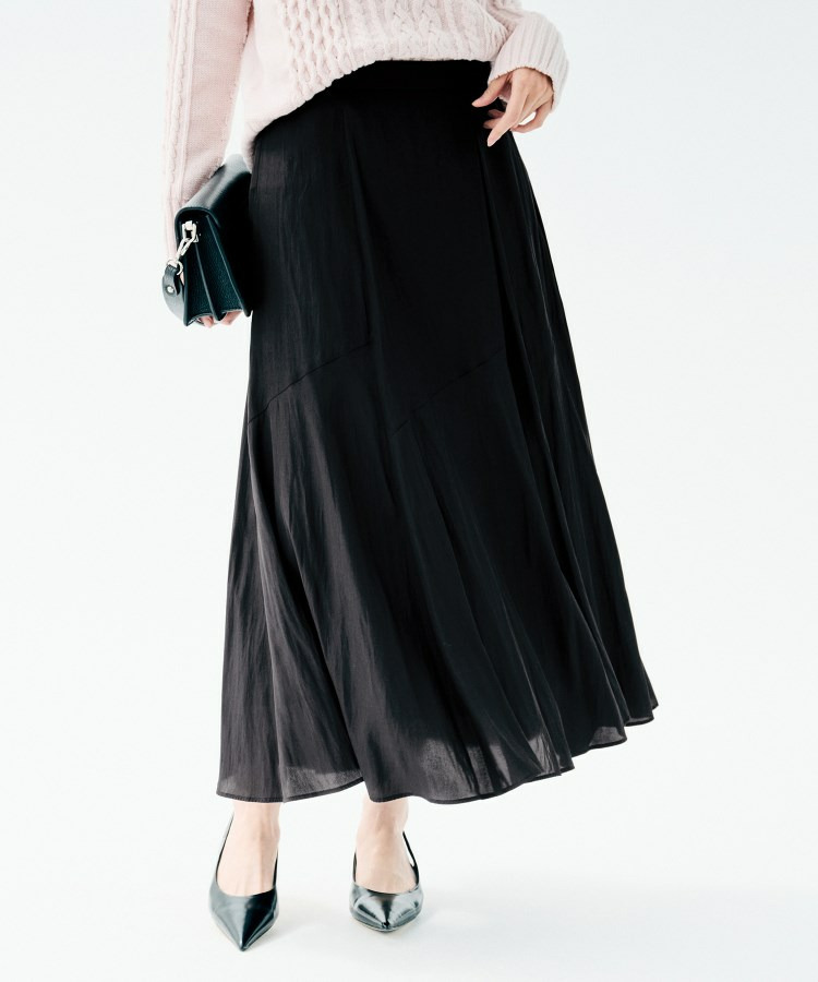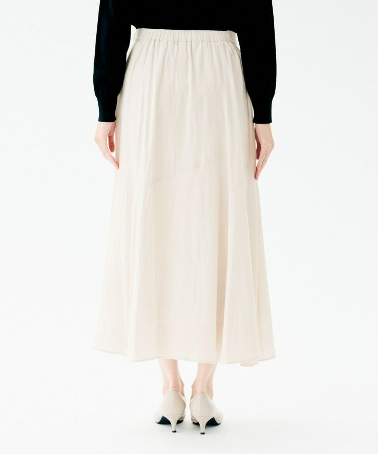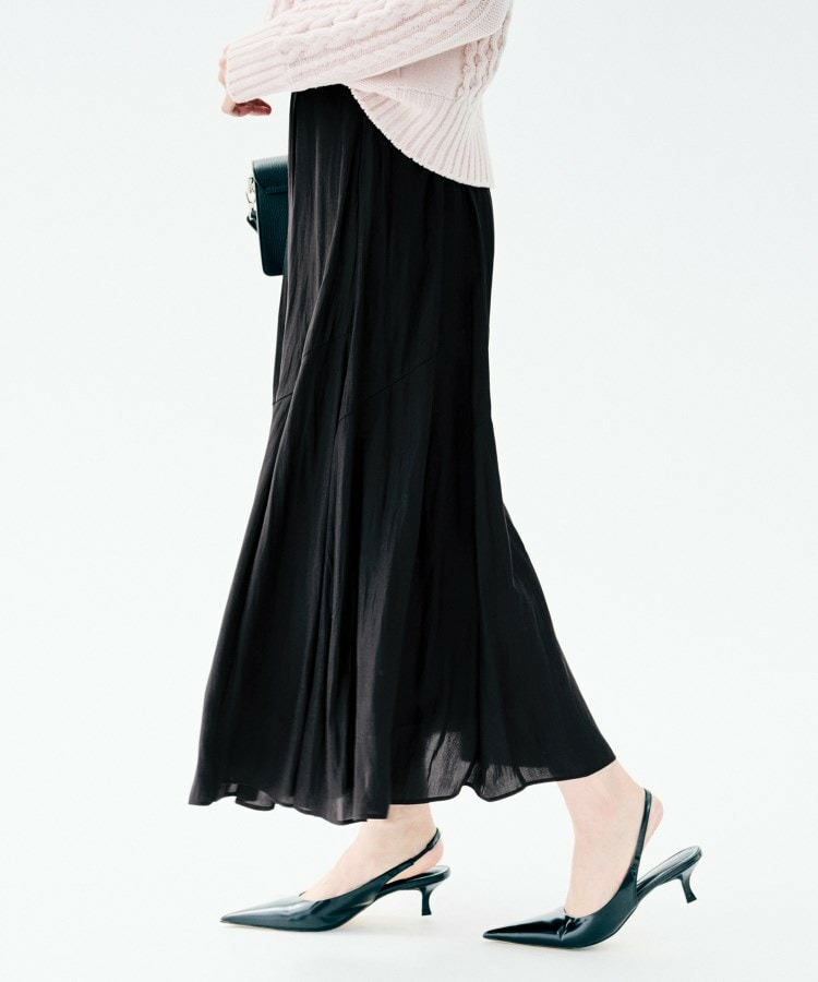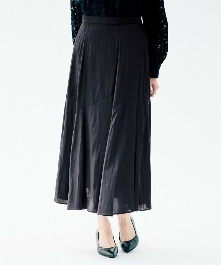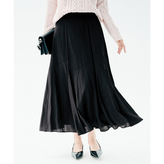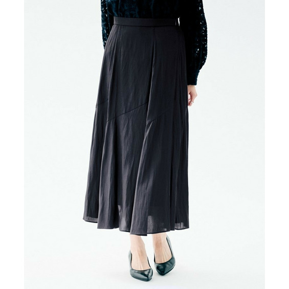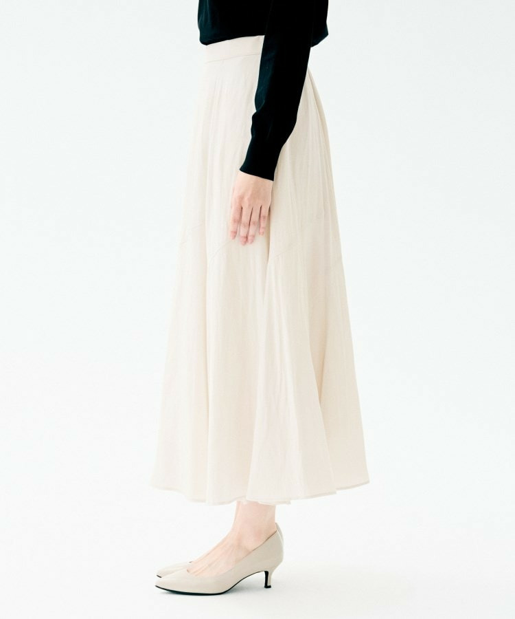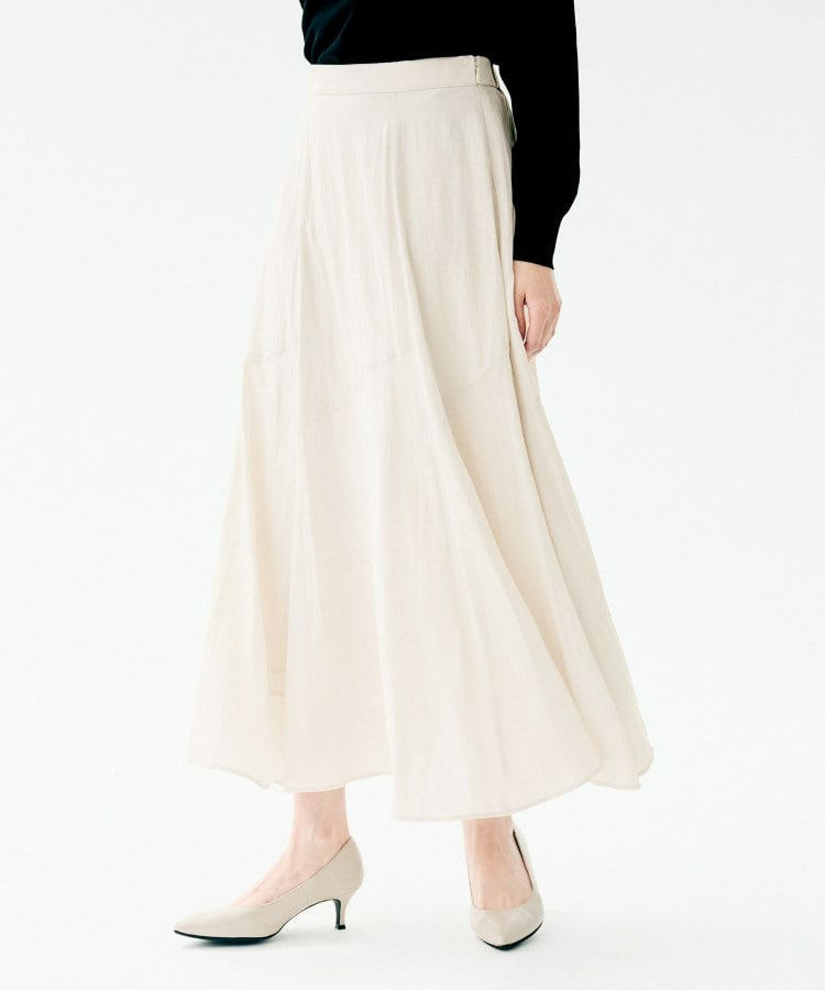 ななめに切り替えラインを施したデザインが特徴のスカートは歩くたびに美しいドレープが生まれ、軽やかな印象に。