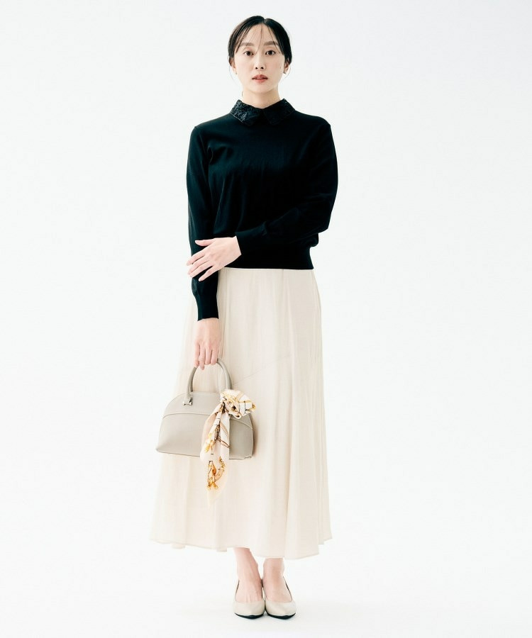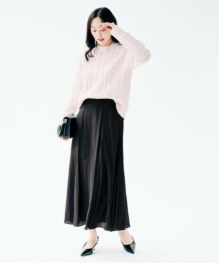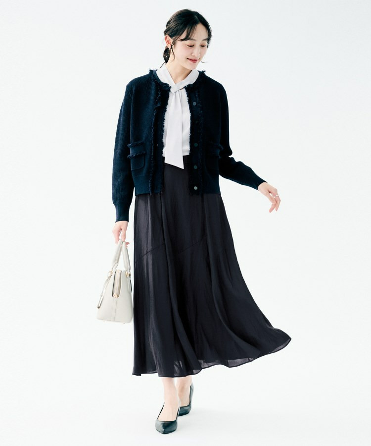 シーズンレスに活躍してくれるスカートはツイード風ニットジャケット(商品番号:153-35256)と合わせてきちんとした印象にも、カジュアルなニットと合わせてオフの日にも。