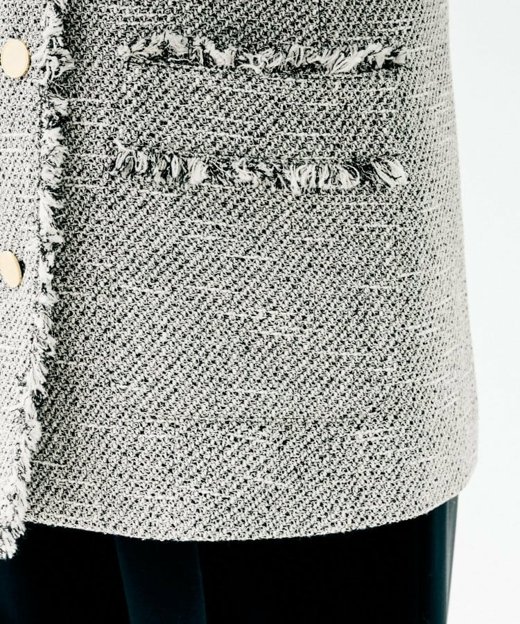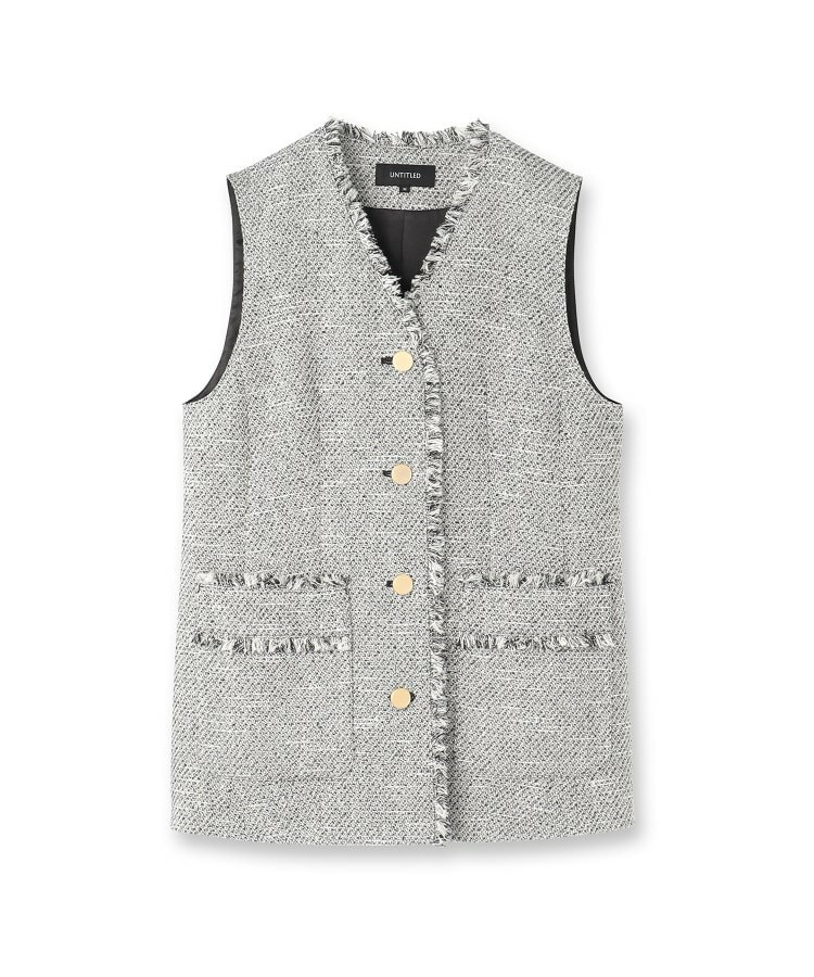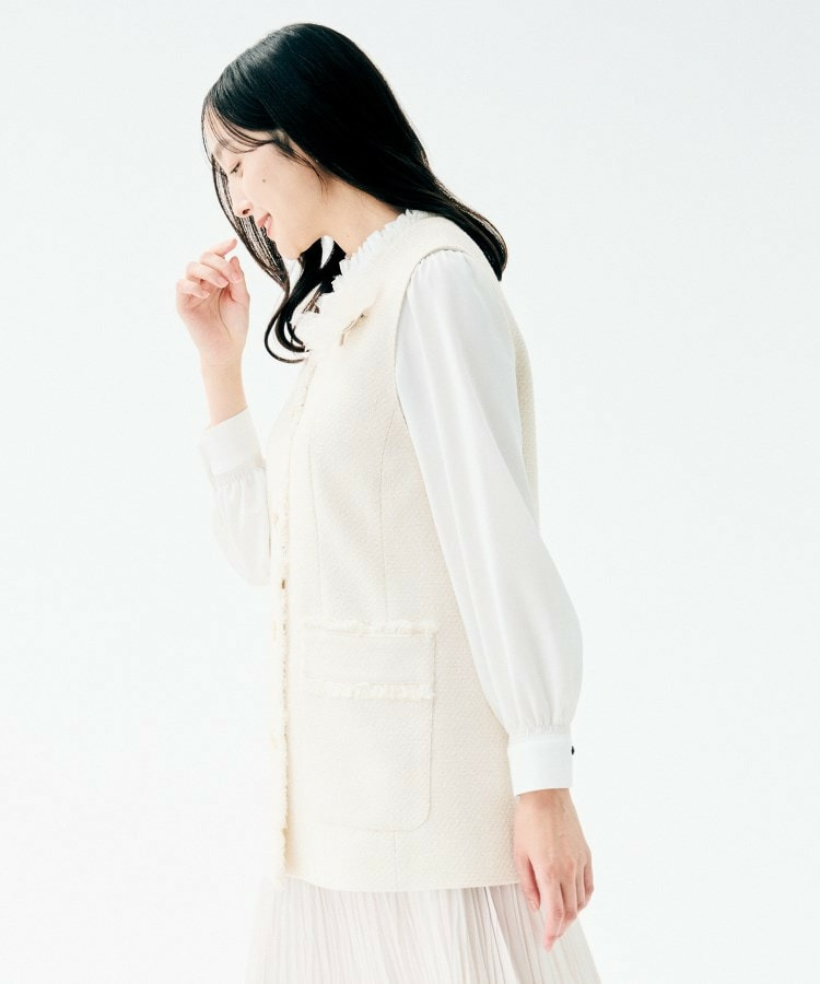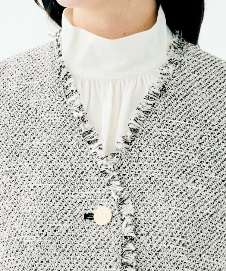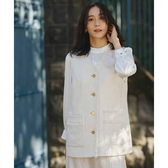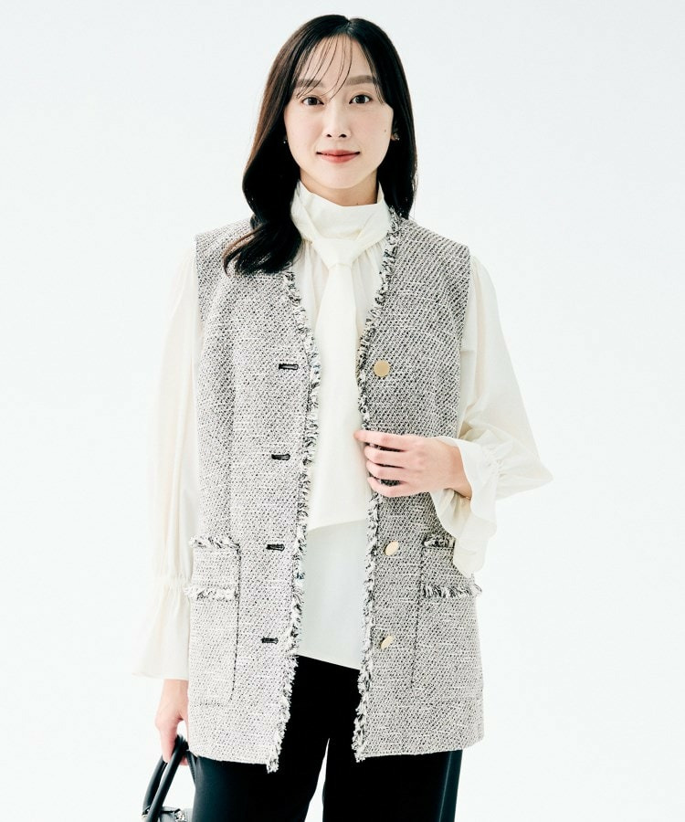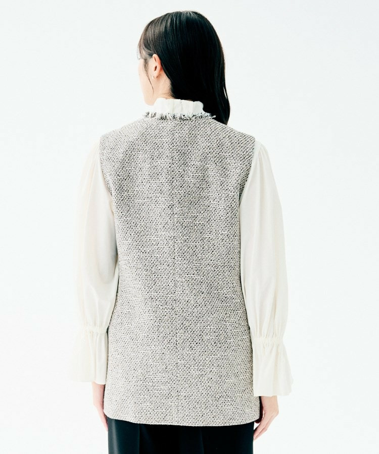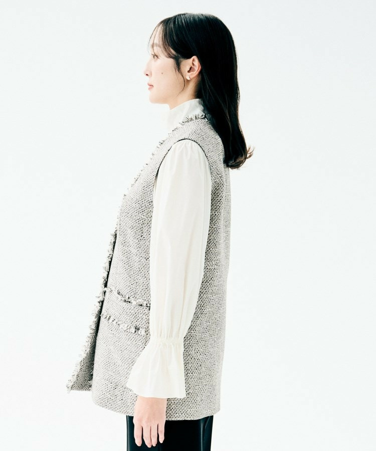 軽やかなスラブツイード素材を用いたミディ丈のジレは首元をシャープに見せるカラーレスデザイン。