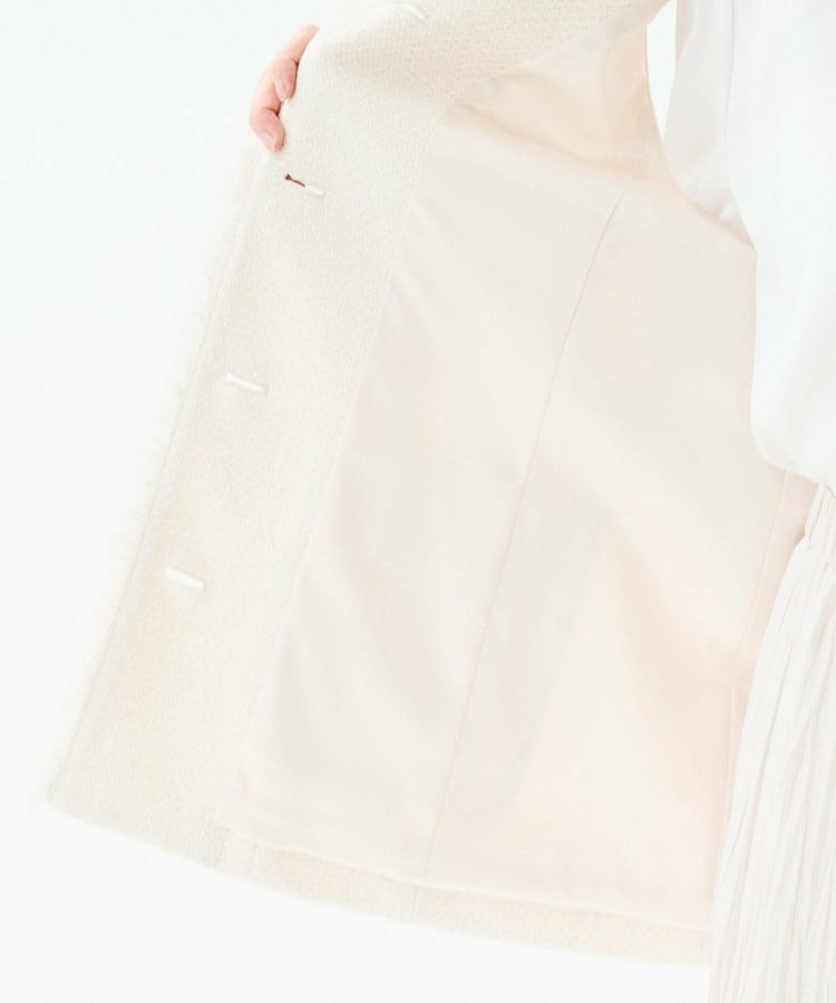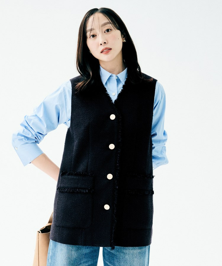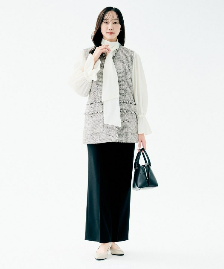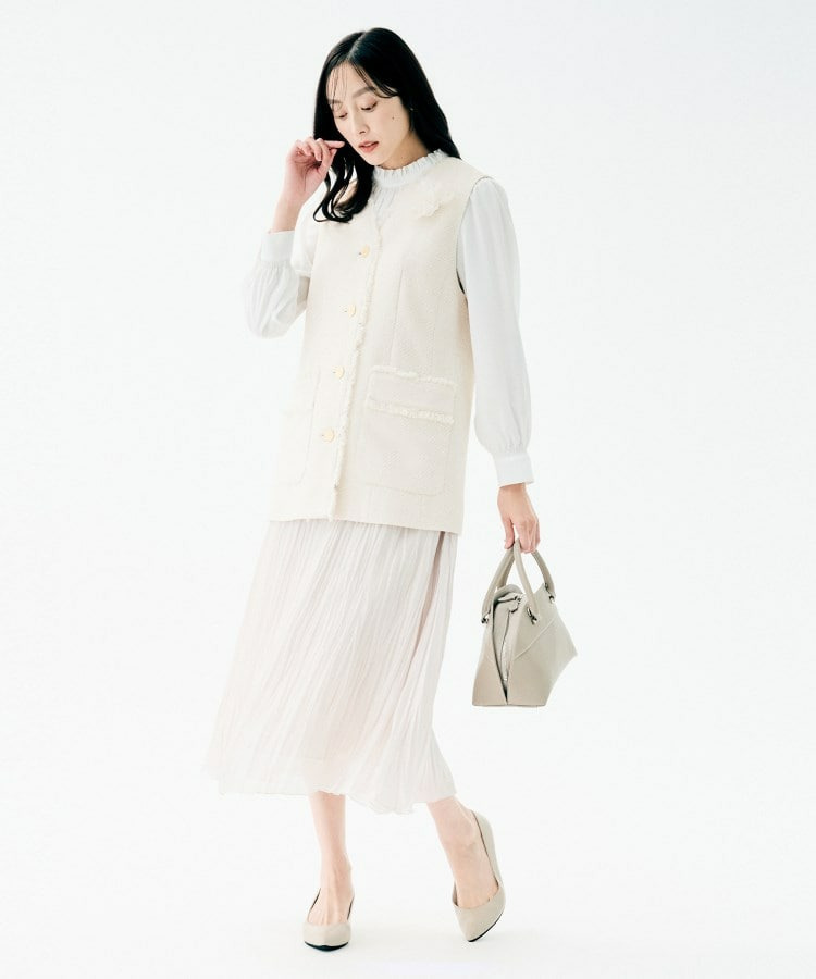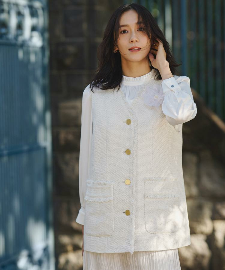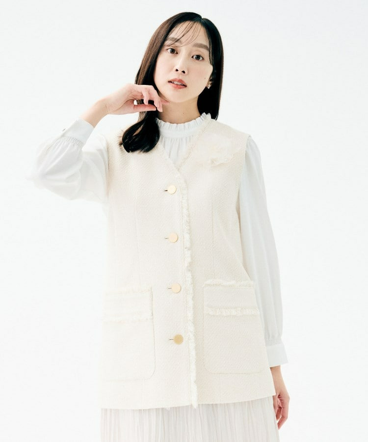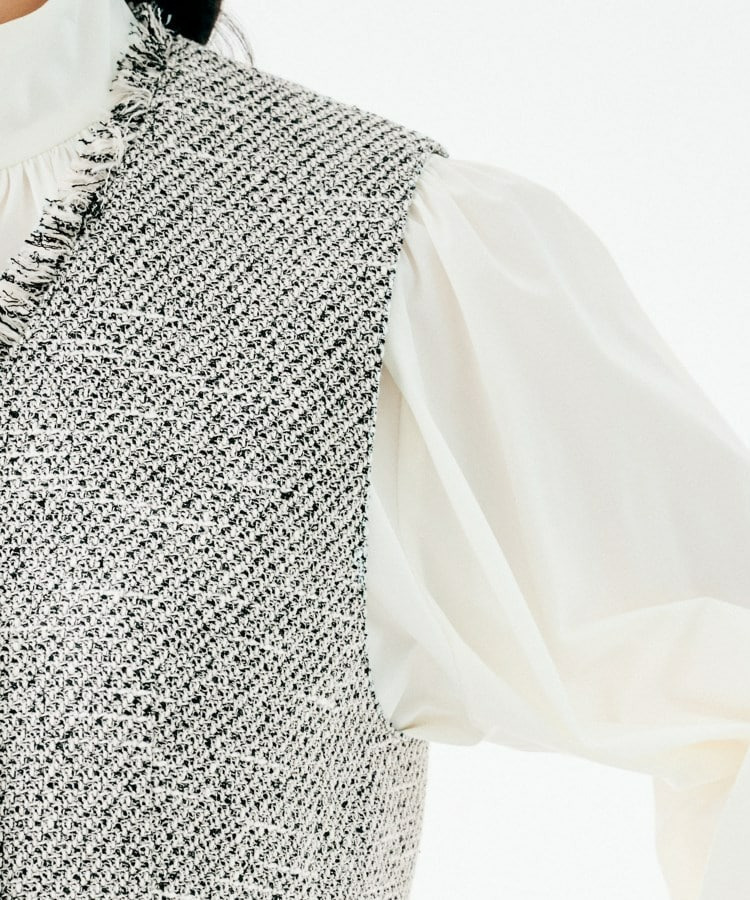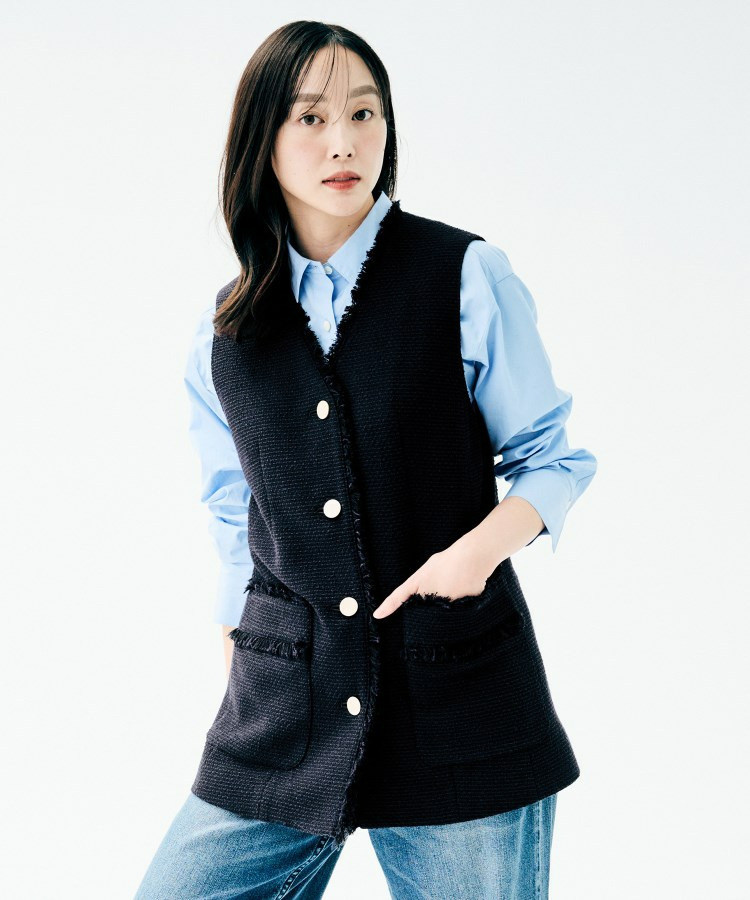 軽やかなスラブツイード素材を用いたミディ丈のジレは首元をシャープに見せるカラーレスデザイン。