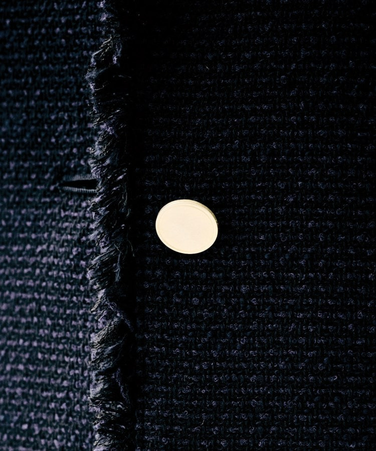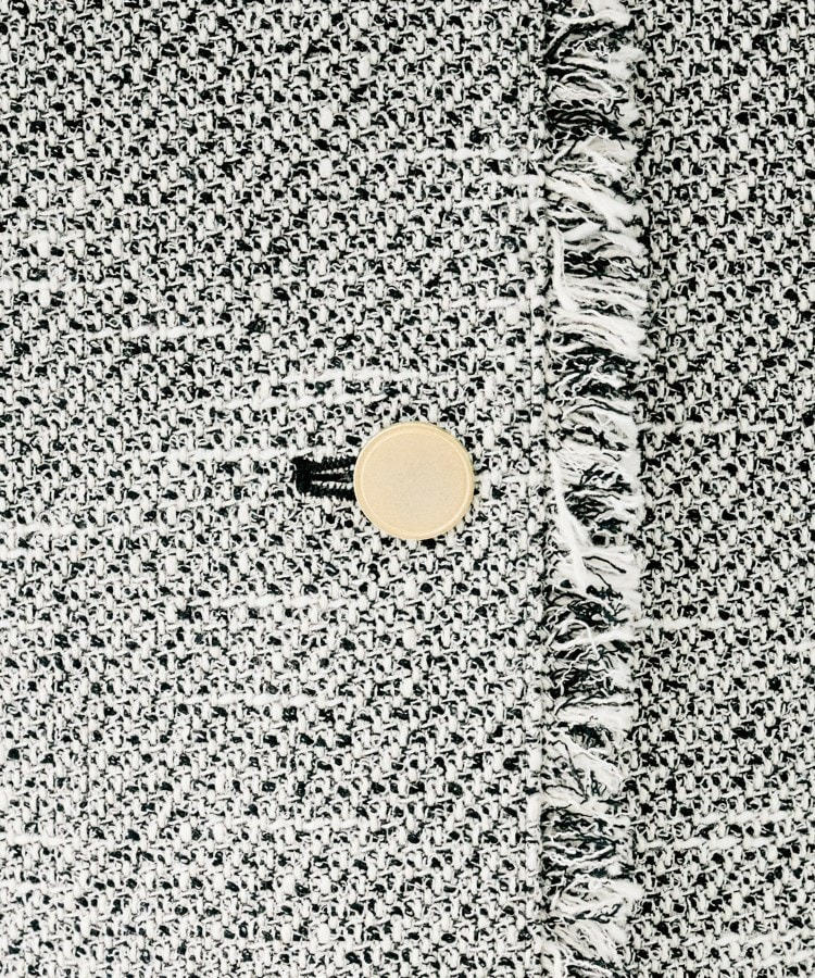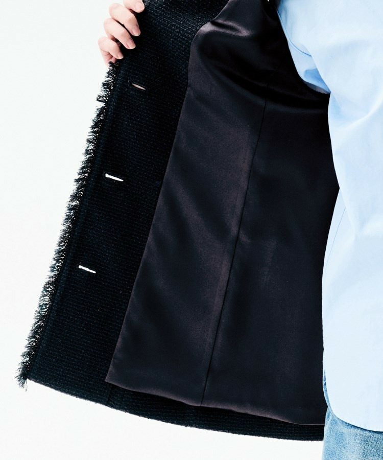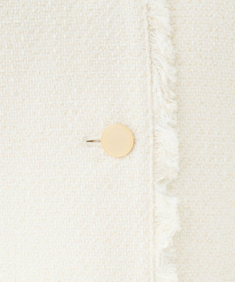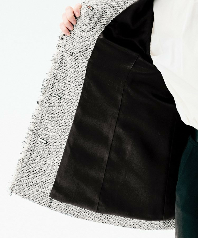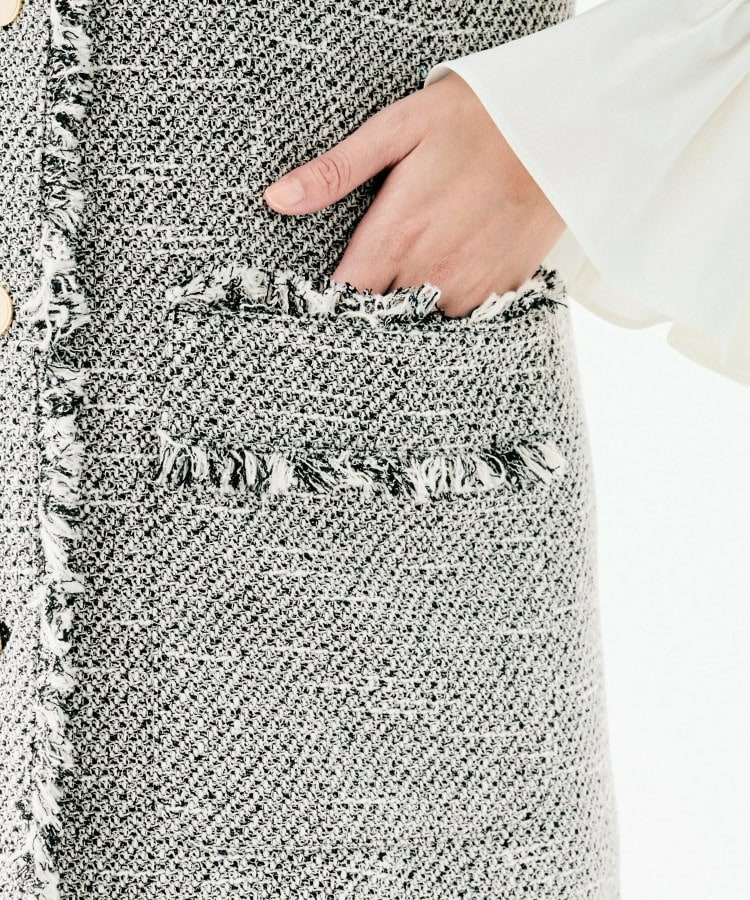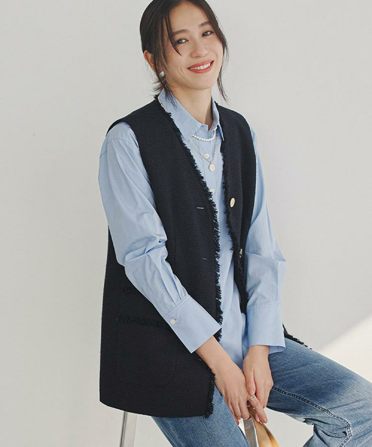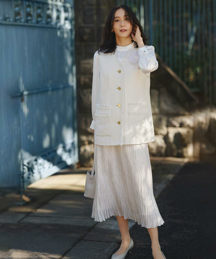 軽やかなスラブツイード素材を用いたミディ丈のジレは首元をシャープに見せるカラーレスデザイン。