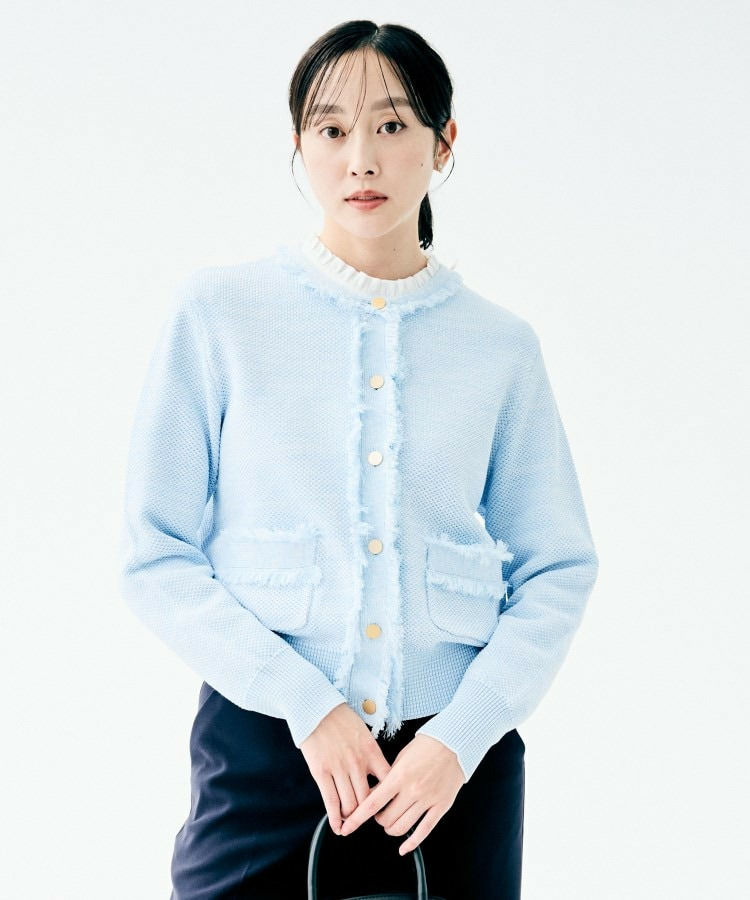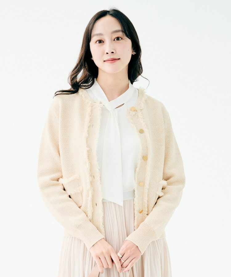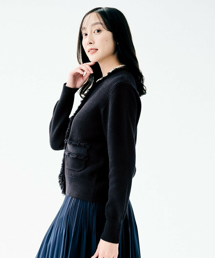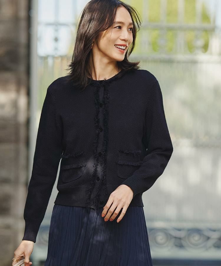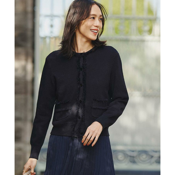 ニットならではの軽さを出すリブ使いでツイードジャケットほどかしこまらず、上品で華やかなメタル釦はカーディガンよりはきちんとした印象に。