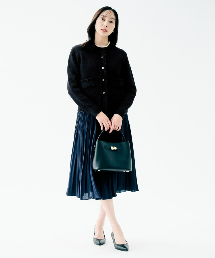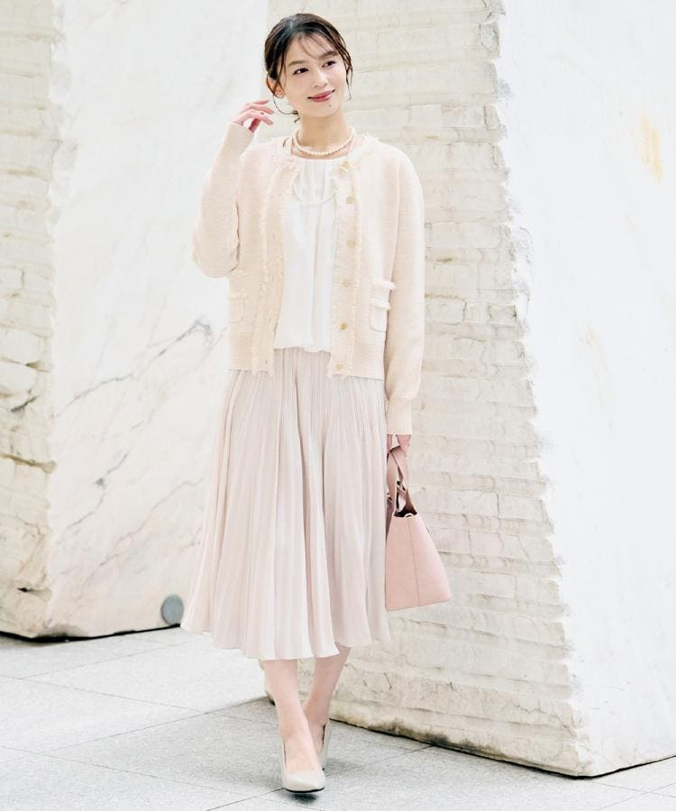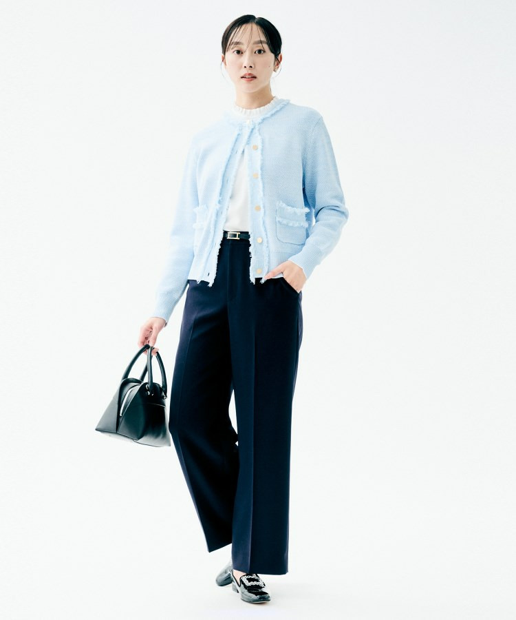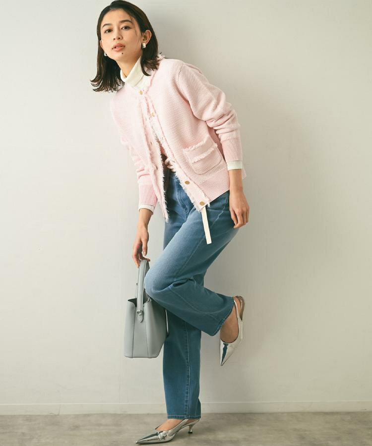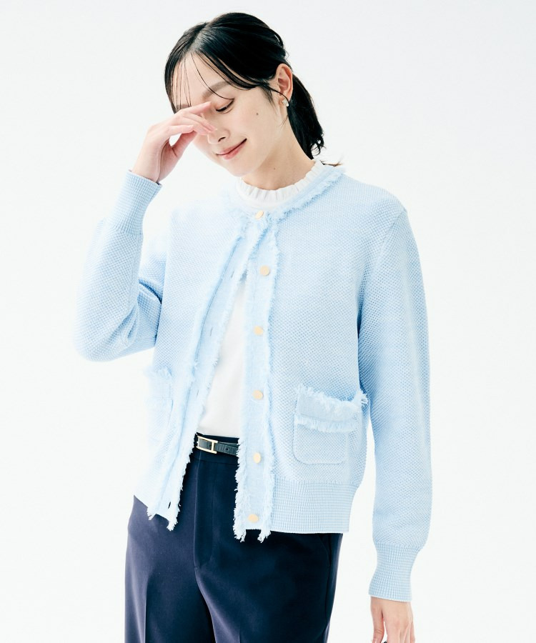 ニットならではの軽さを出すリブ使いでツイードジャケットほどかしこまらず、上品で華やかなメタル釦はカーディガンよりはきちんとした印象に。