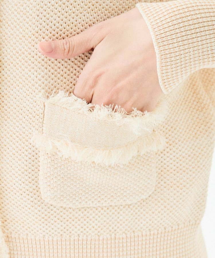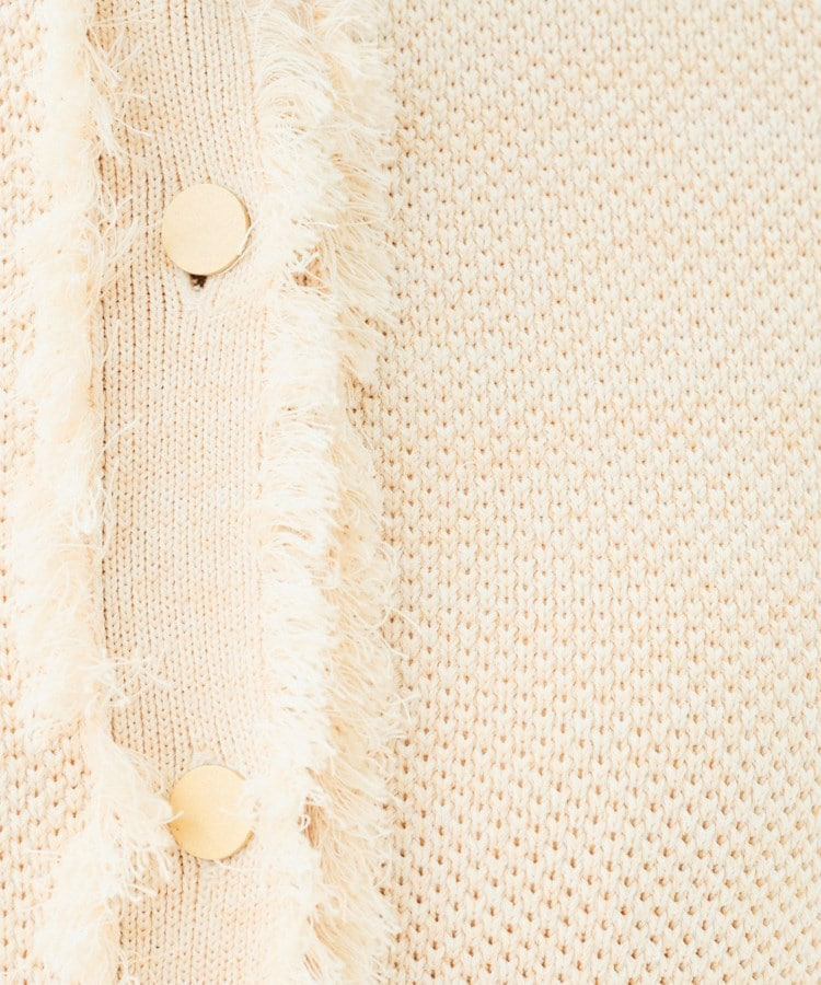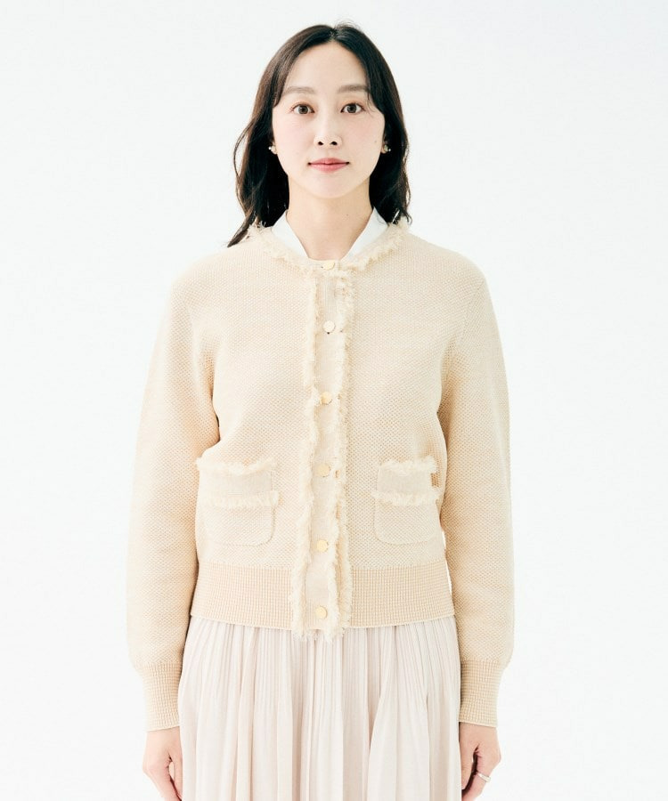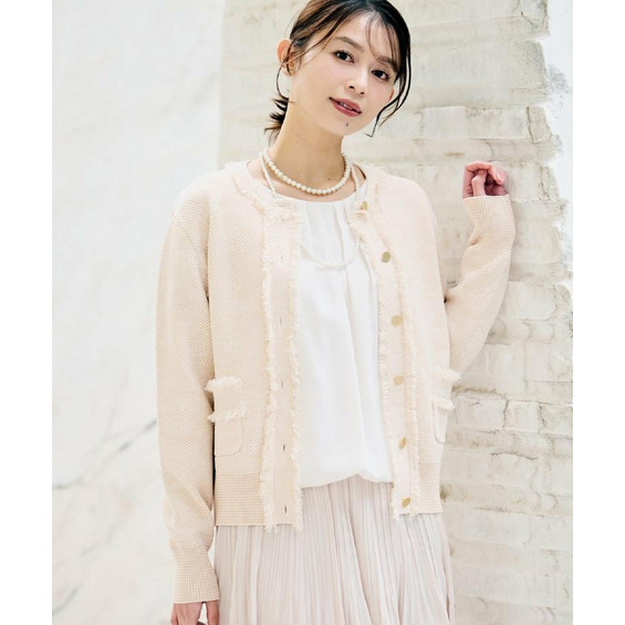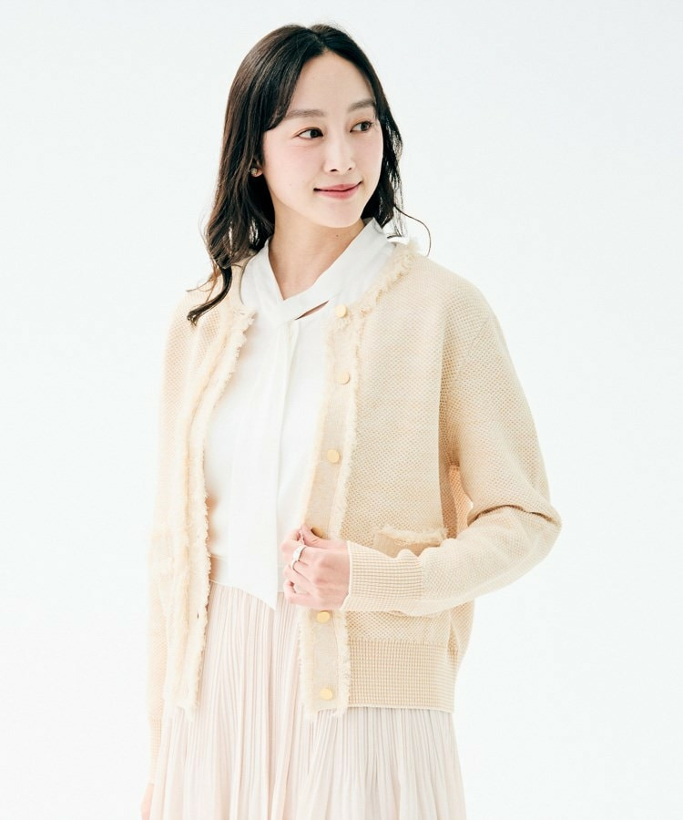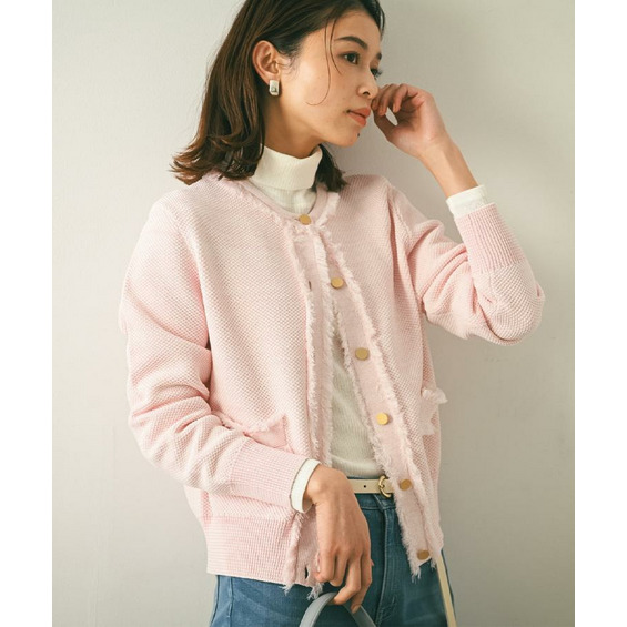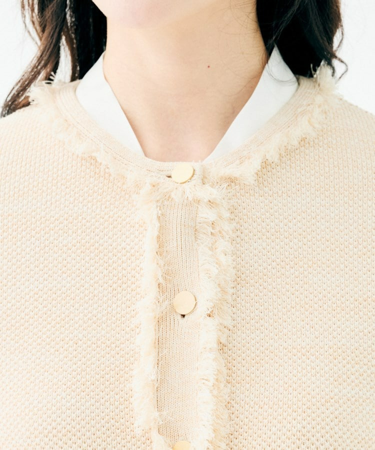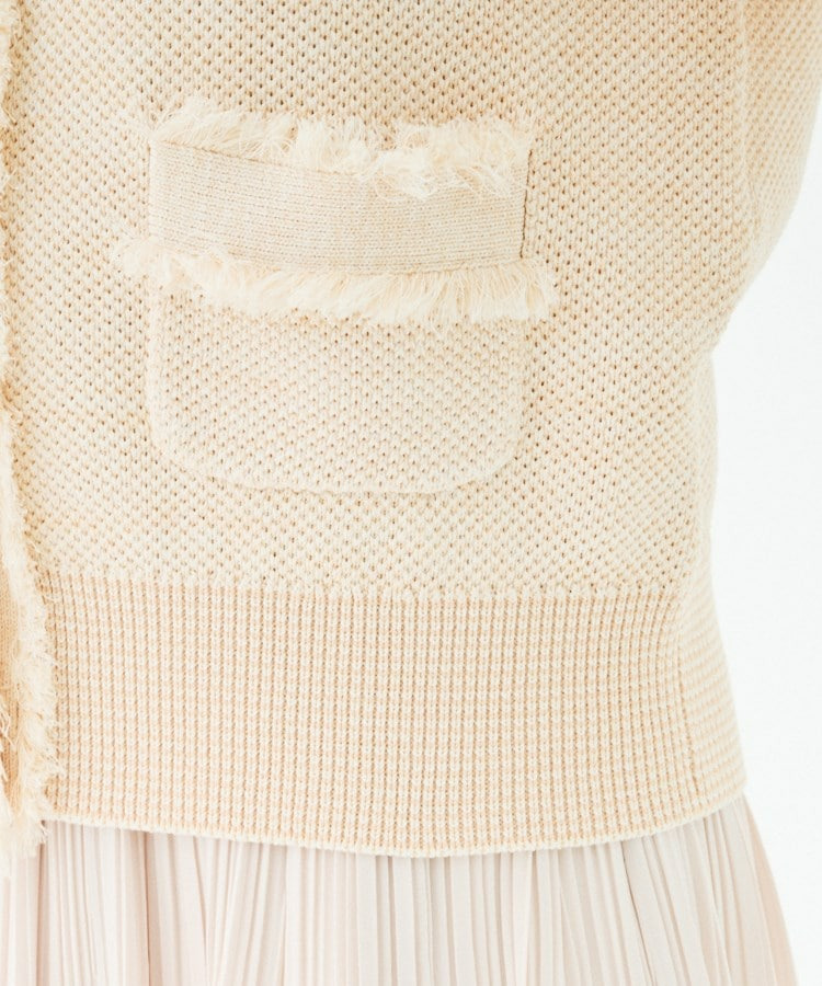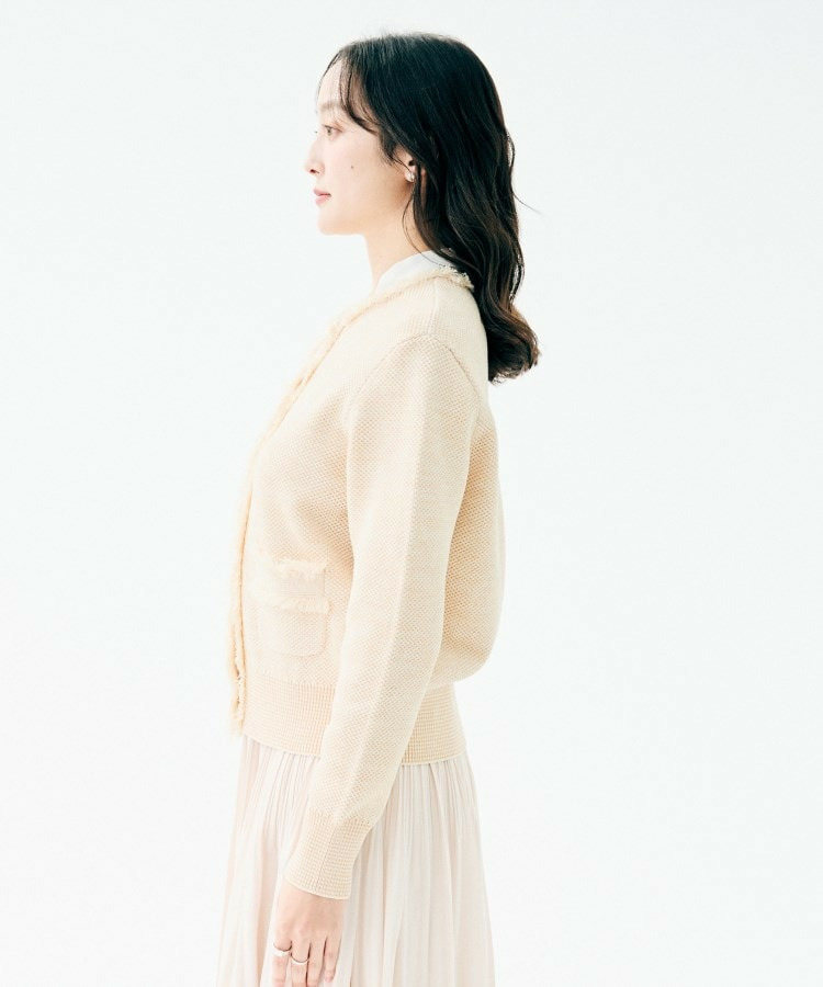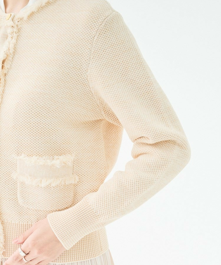 表面感ある編み地に施したフリンジが目を引くニットジャケット。