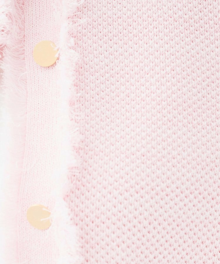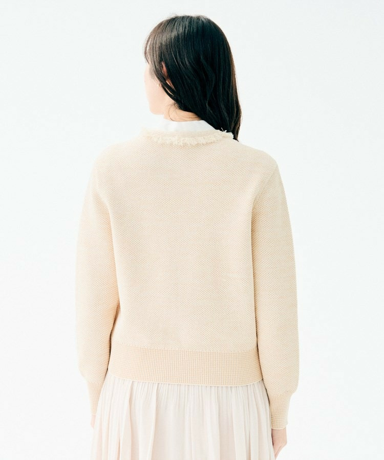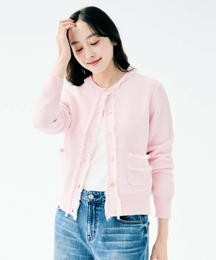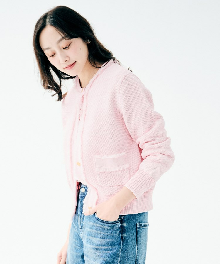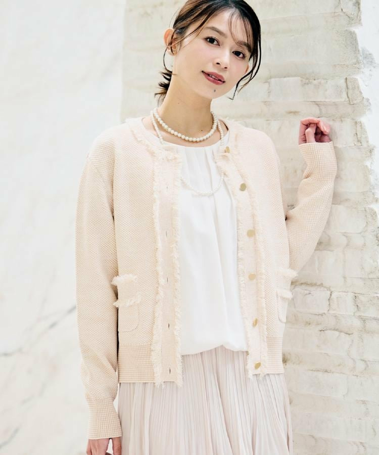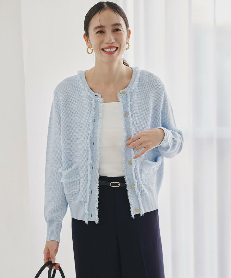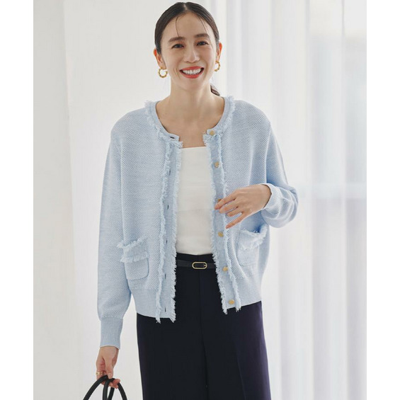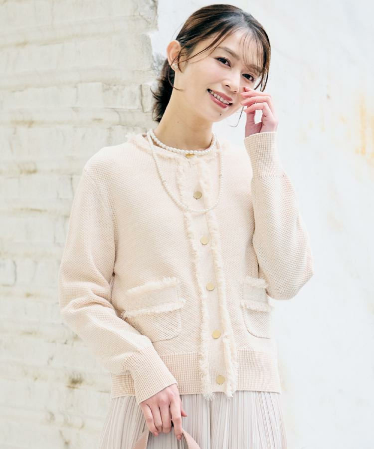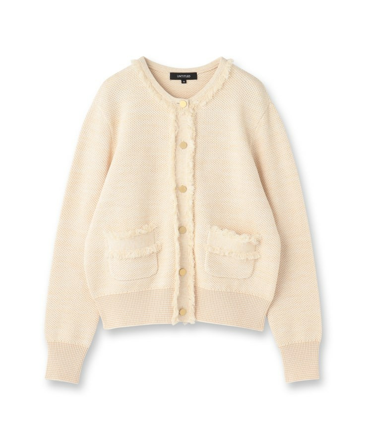 表面感ある編み地に施したフリンジが目を引くニットジャケット。