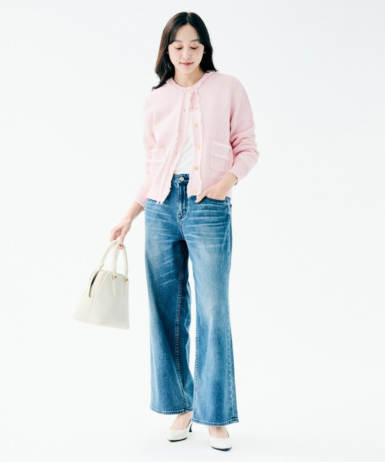 釦を留めて一枚着でも華やかで綺麗目にスカート合わせやカジュアルなデニム合わせもおすすめです。