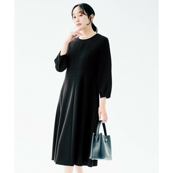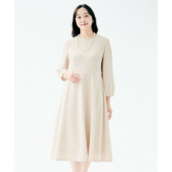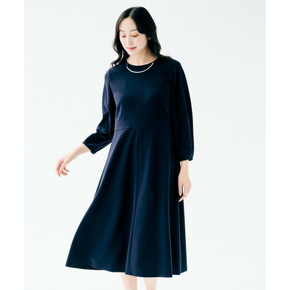 丸首のワンピースは、上身頃はすっきりとしたシルエットで、スカート部分は裾に向かって分量感を出した裾が揺れるデザインになっています。