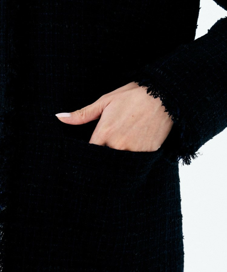 セレモニーに欠かせないファンシーツイードのノーカラージャケット。
