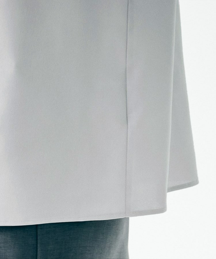 上品な光沢と落ち感のある素材のブラウスには、ハイネックにフリルディテールとギャザーを施しました。