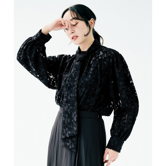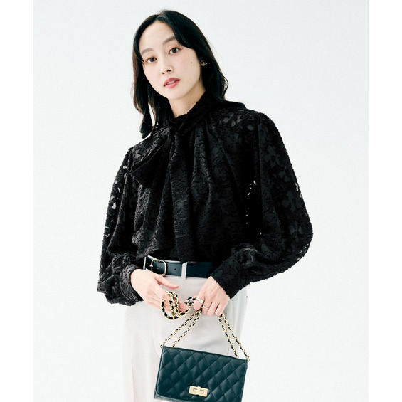 カットジャカード素材に取り外しのボウタイが付いたブラウス。