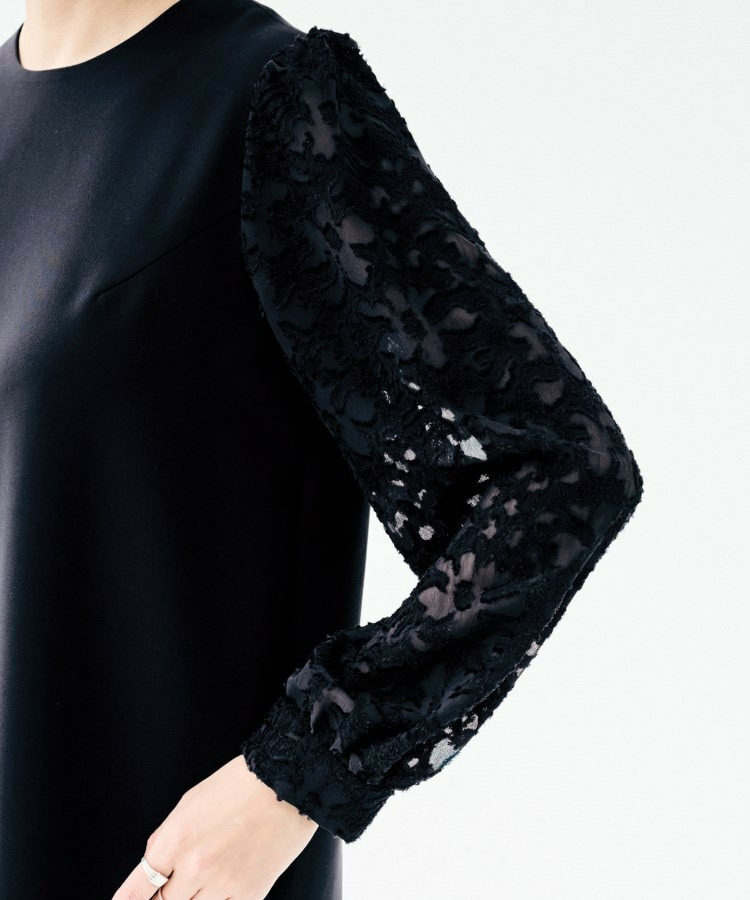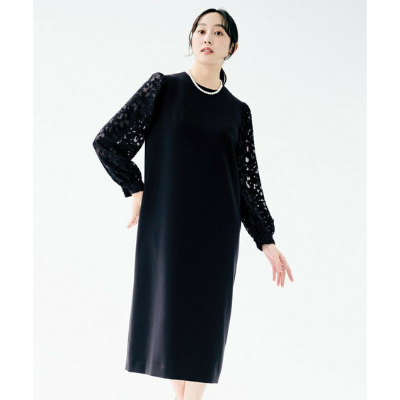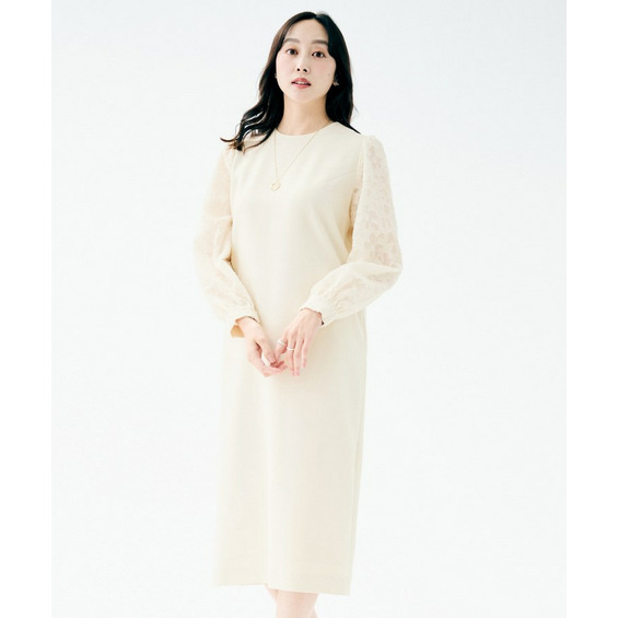 袖にカットジャカード素材を切り替えた異素材ドッキングワンピース。