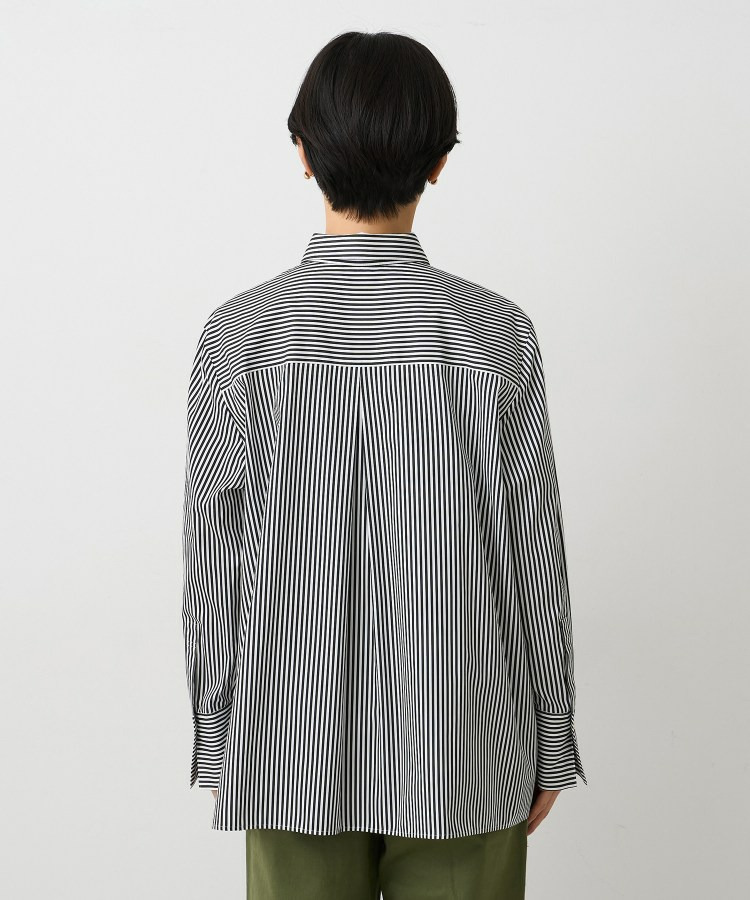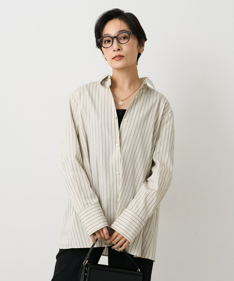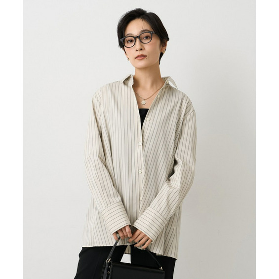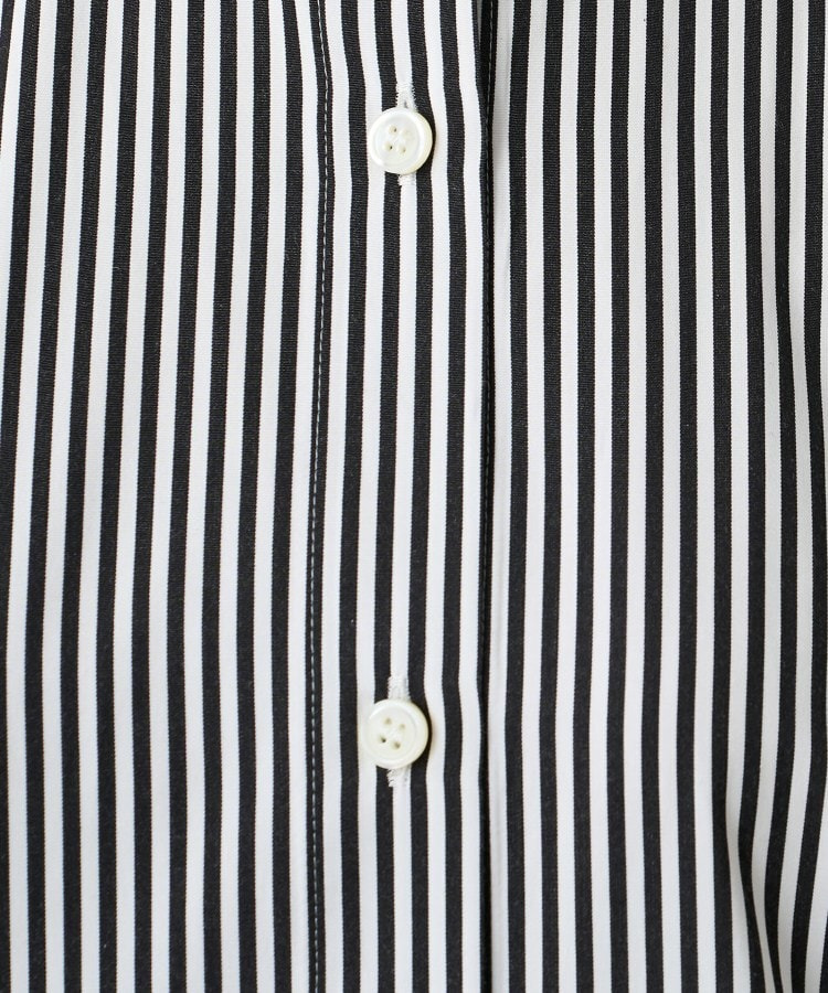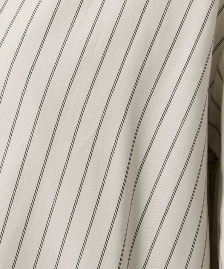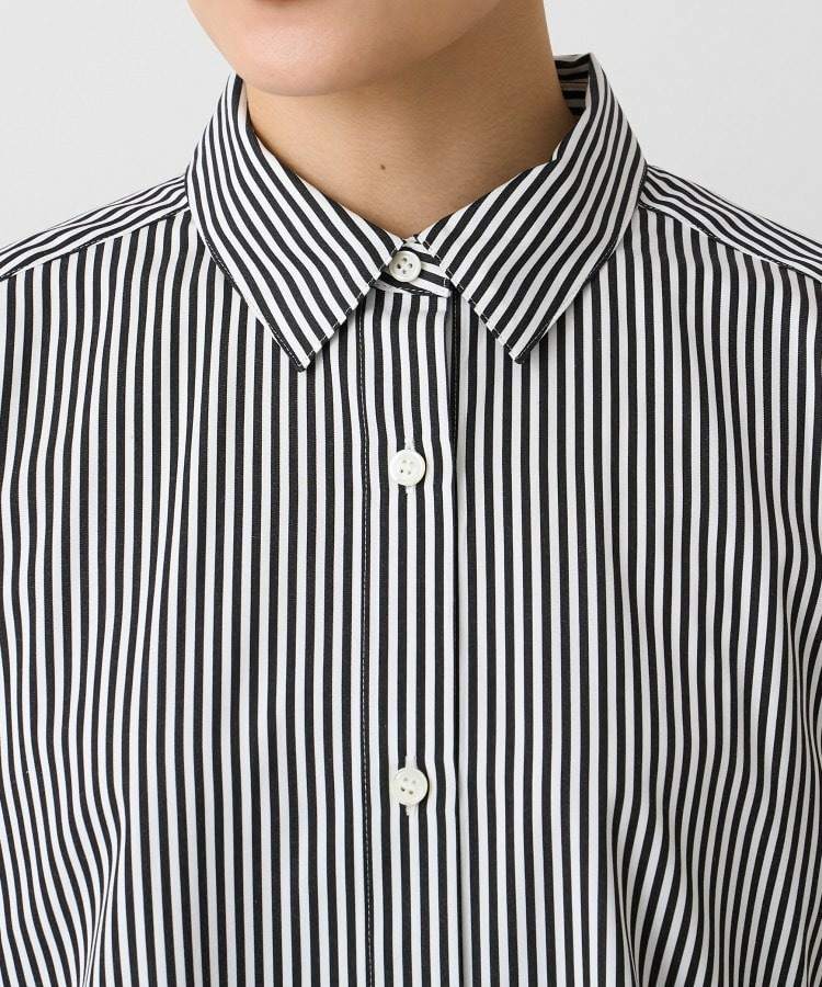 縦ラインを引き立てるストライプ柄と控えめで上品な小さな衿が特徴。