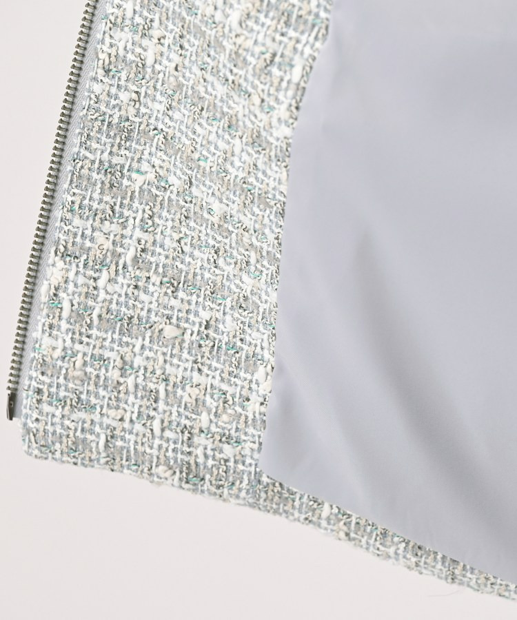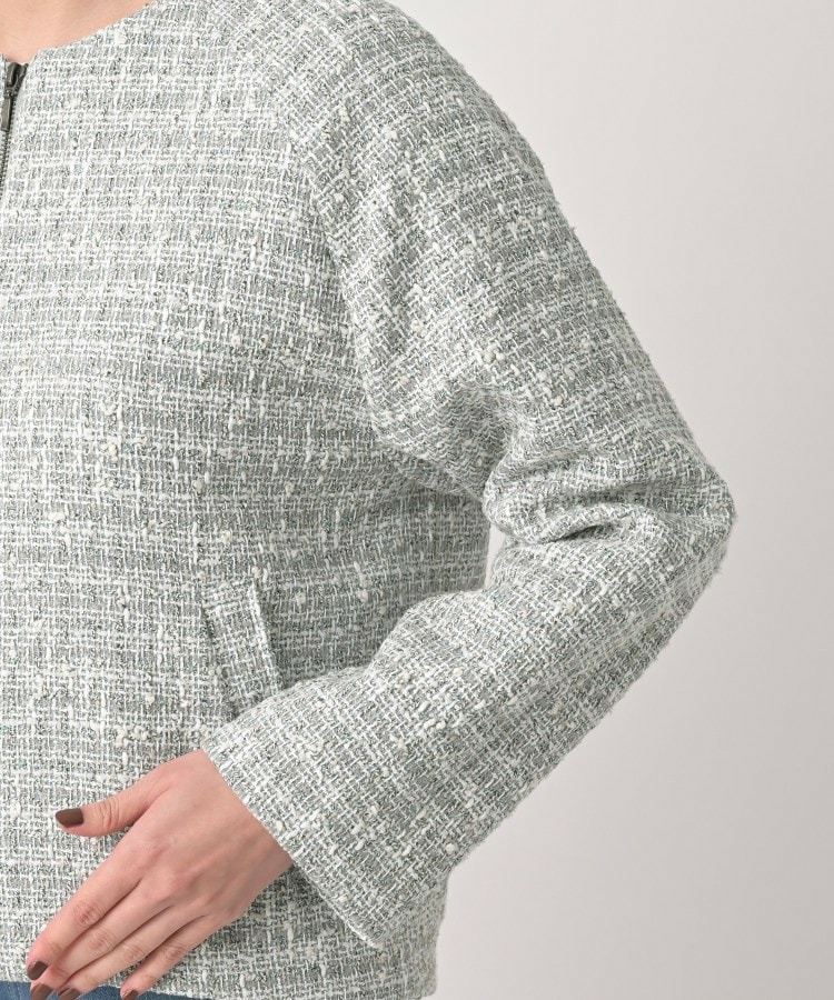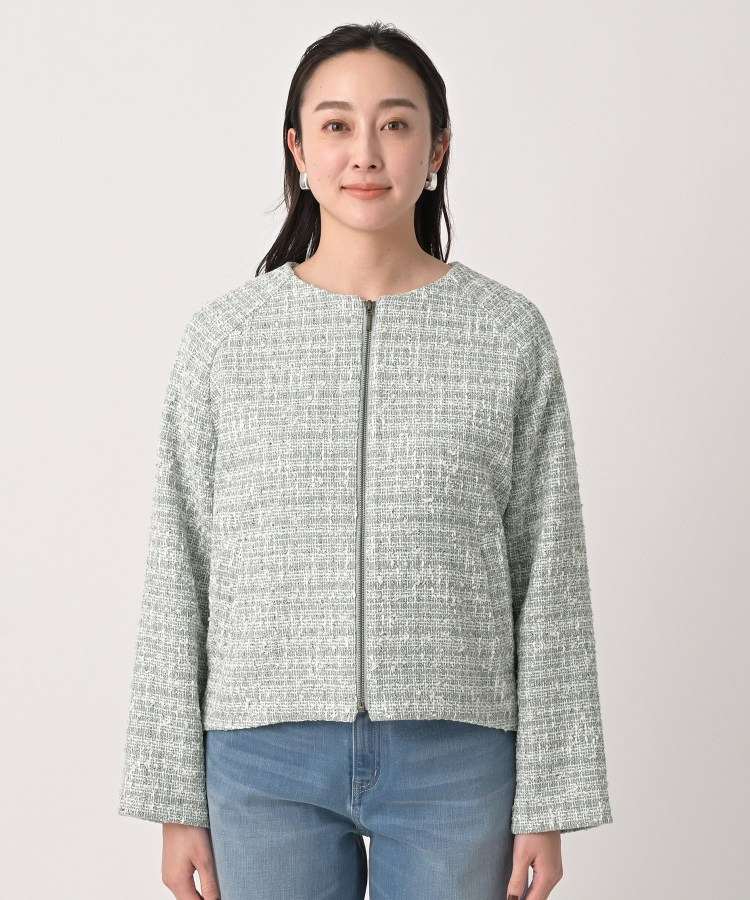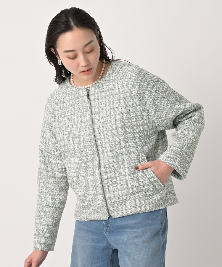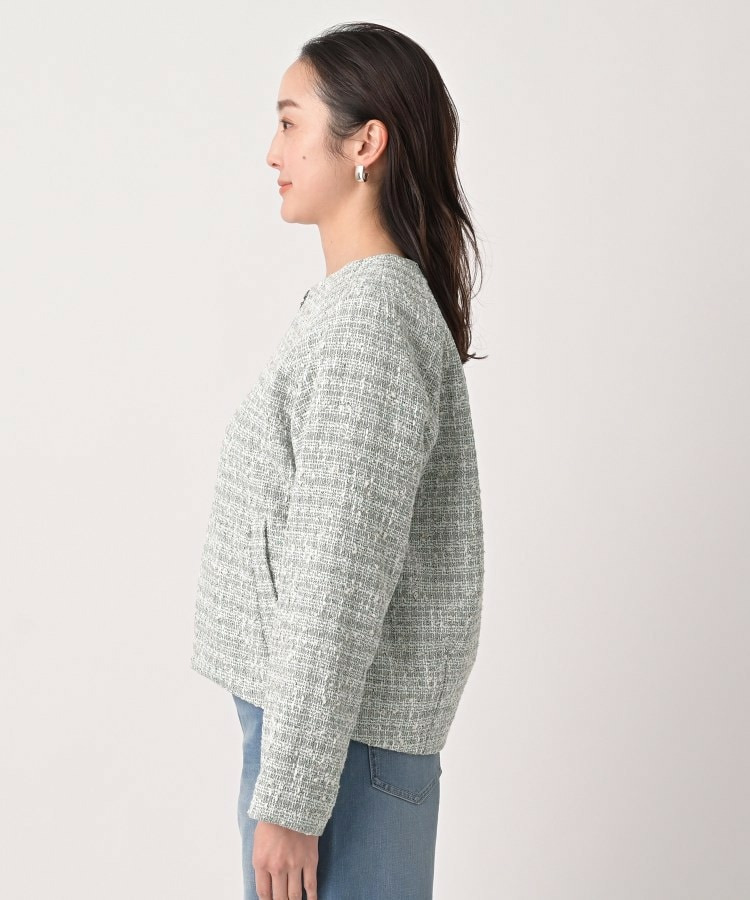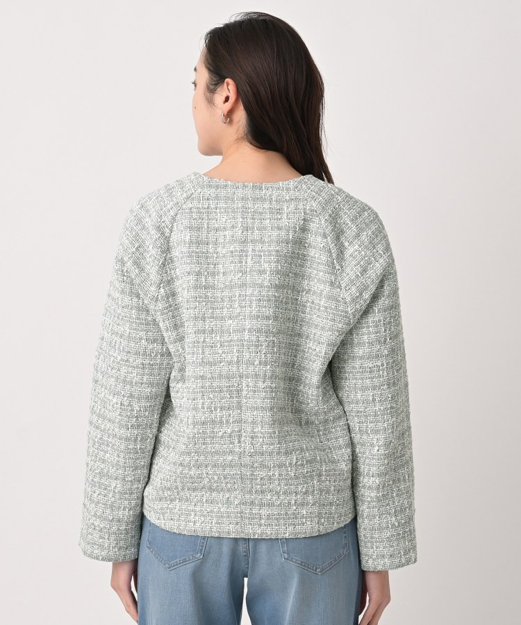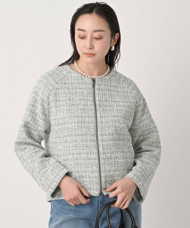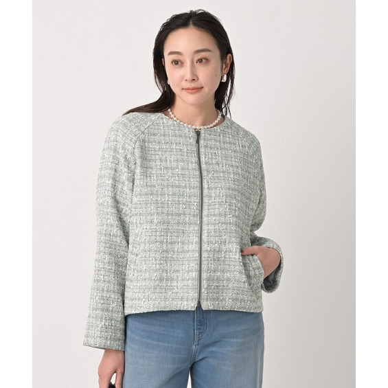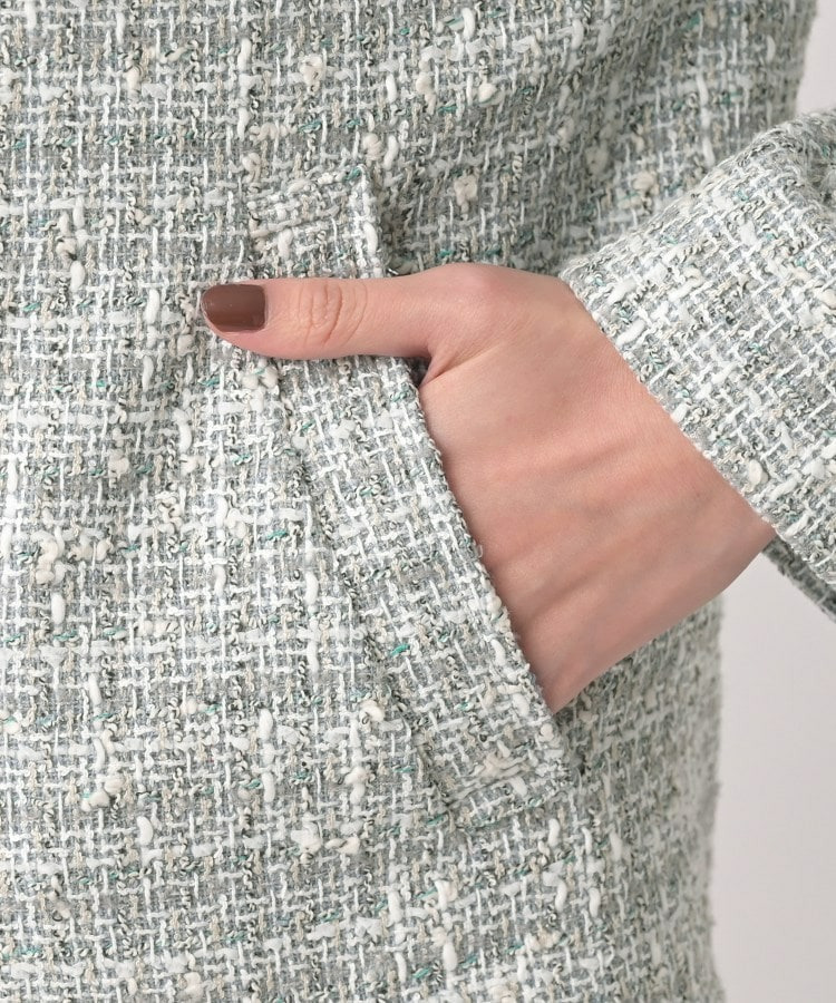 クラシックなツイード素材と、女性らしい柔らかなコクーンシルエットが融合した上品な1着。