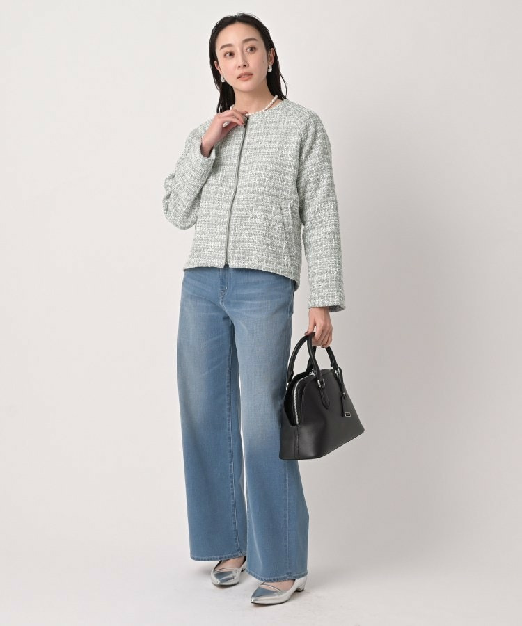 デニムのワイドパンツなどカジュアルなアイテムとのコントラストのついたスタイリングがおすすめ。