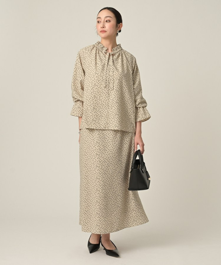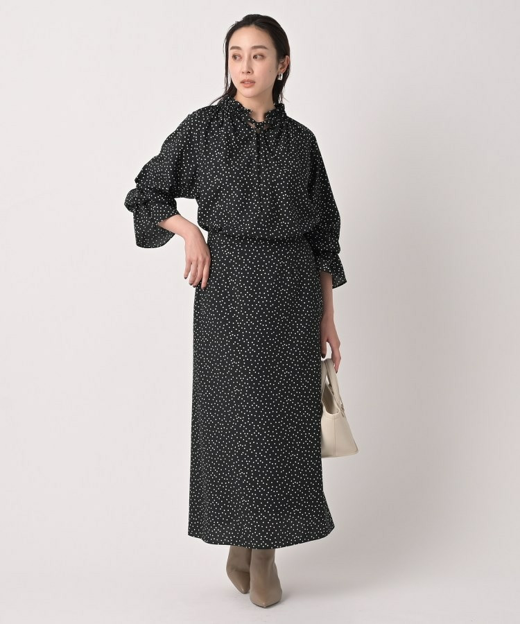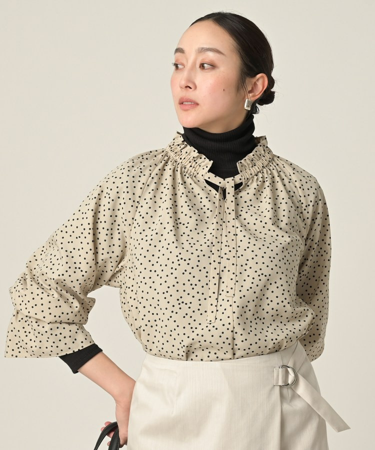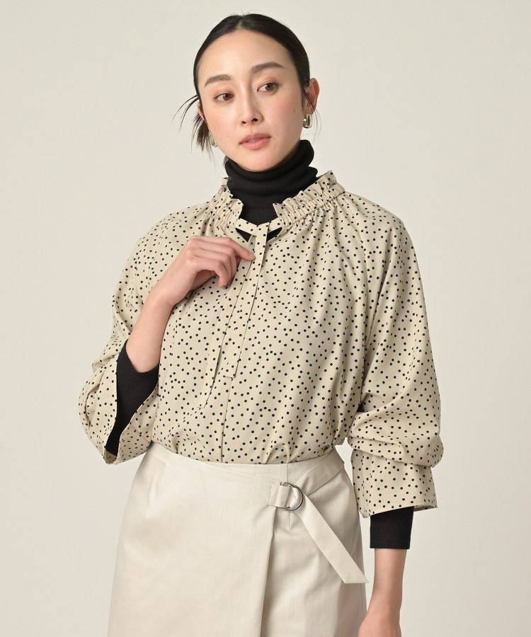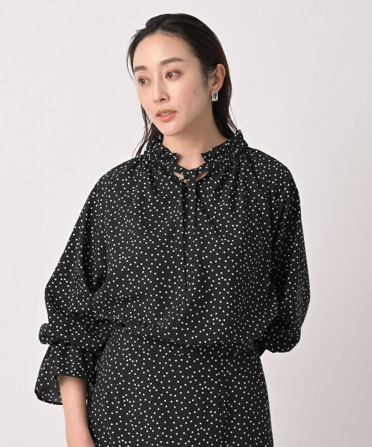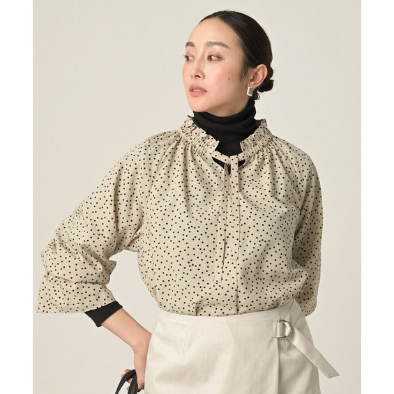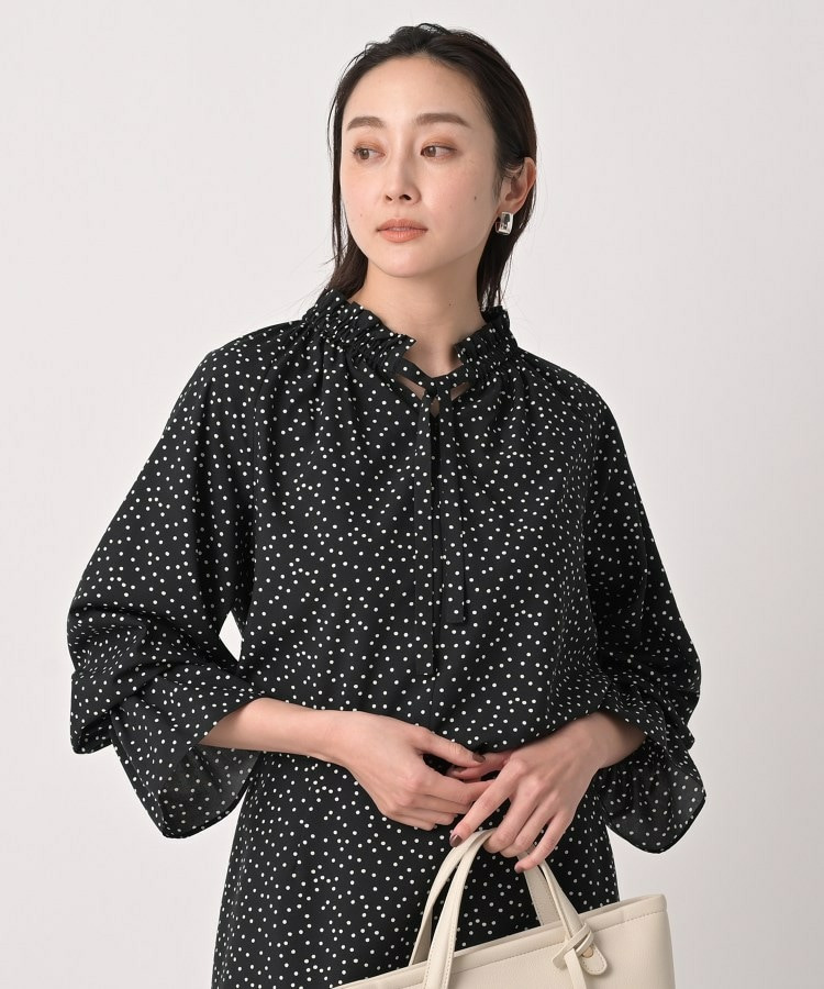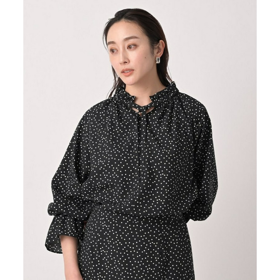ドロスト仕様のフリル衿とキャンディスリーブの柔らかなシルエットが、上品さと女性らしさを際立たせます。