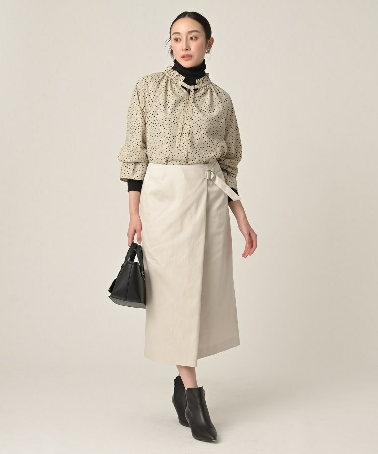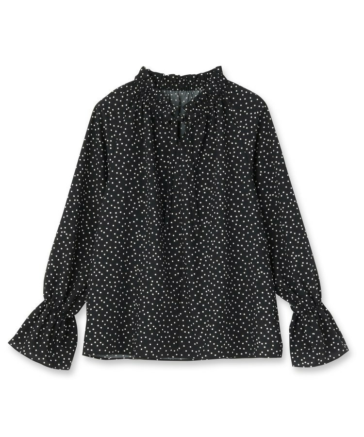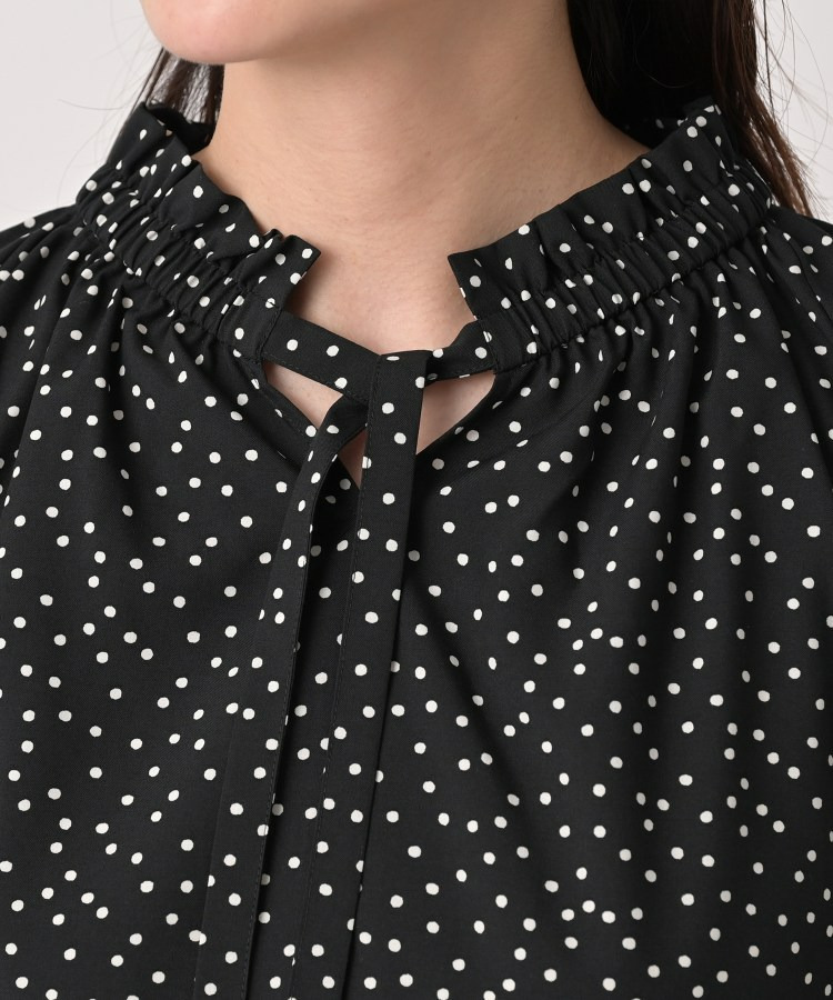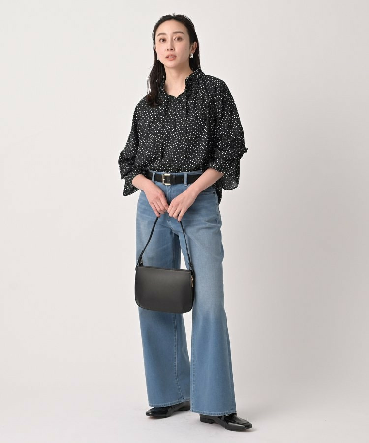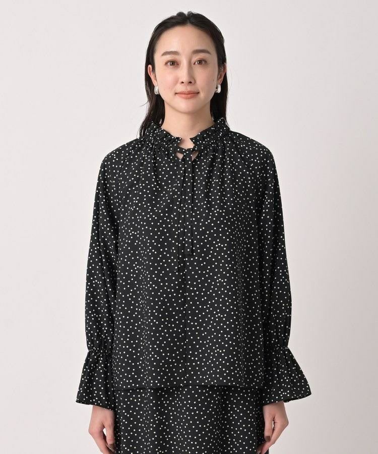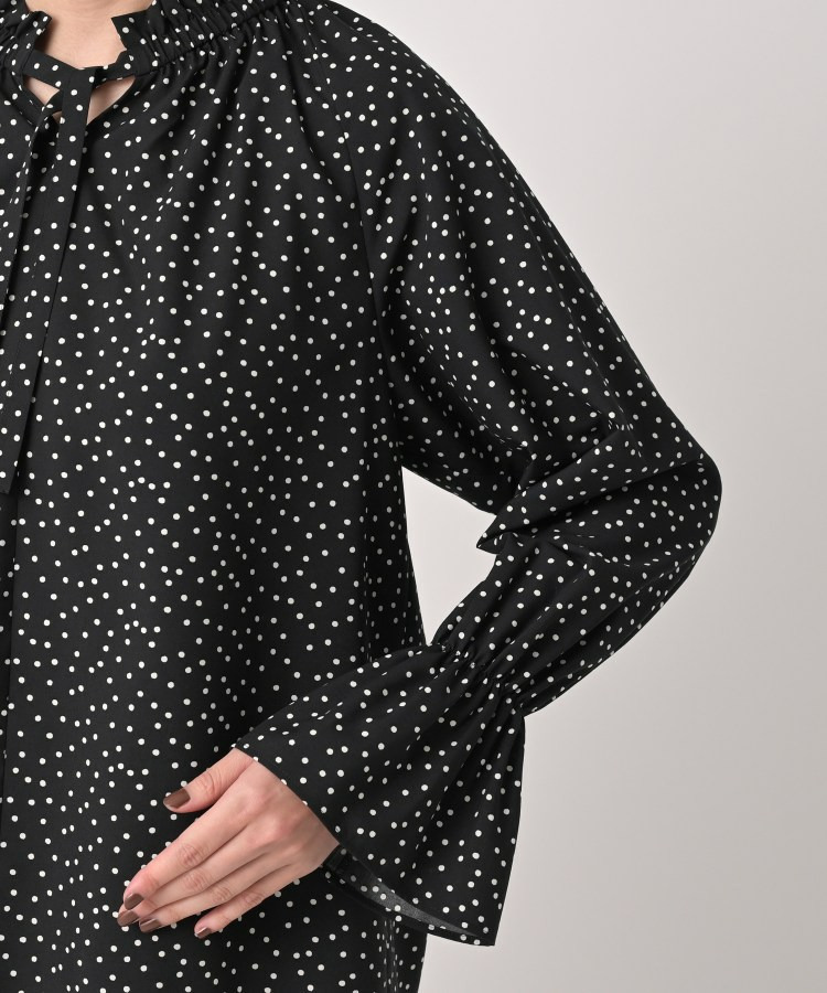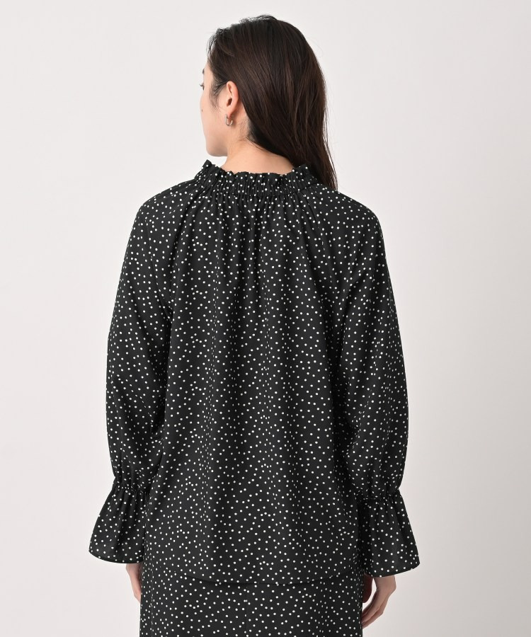 ドロスト仕様のフリル衿とキャンディスリーブの柔らかなシルエットが、上品さと女性らしさを際立たせます。