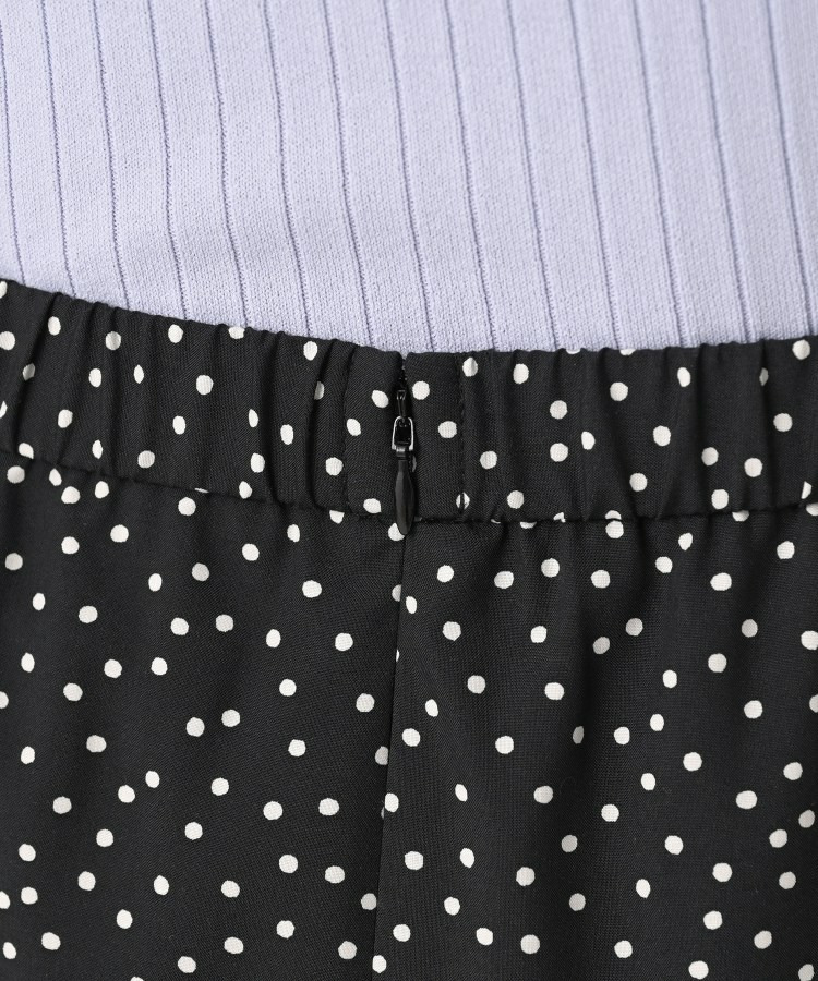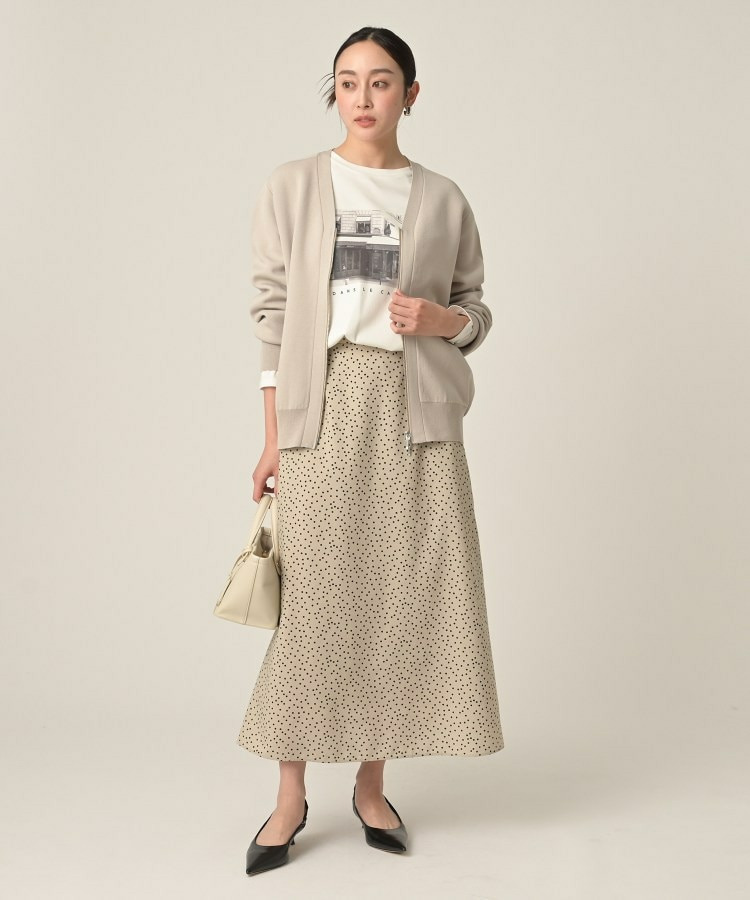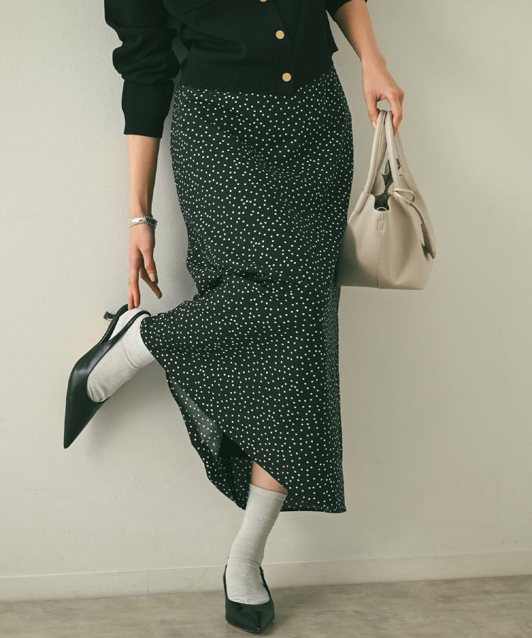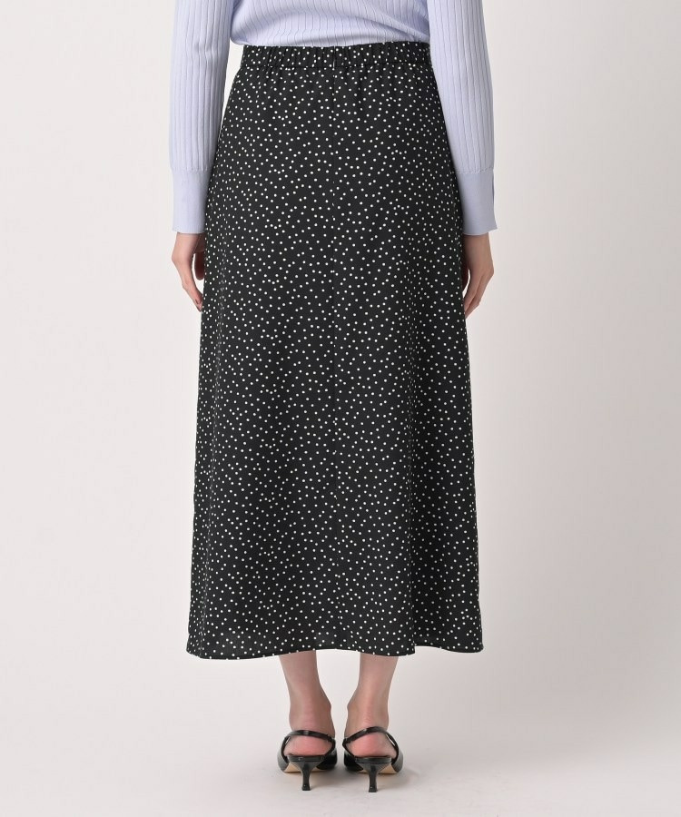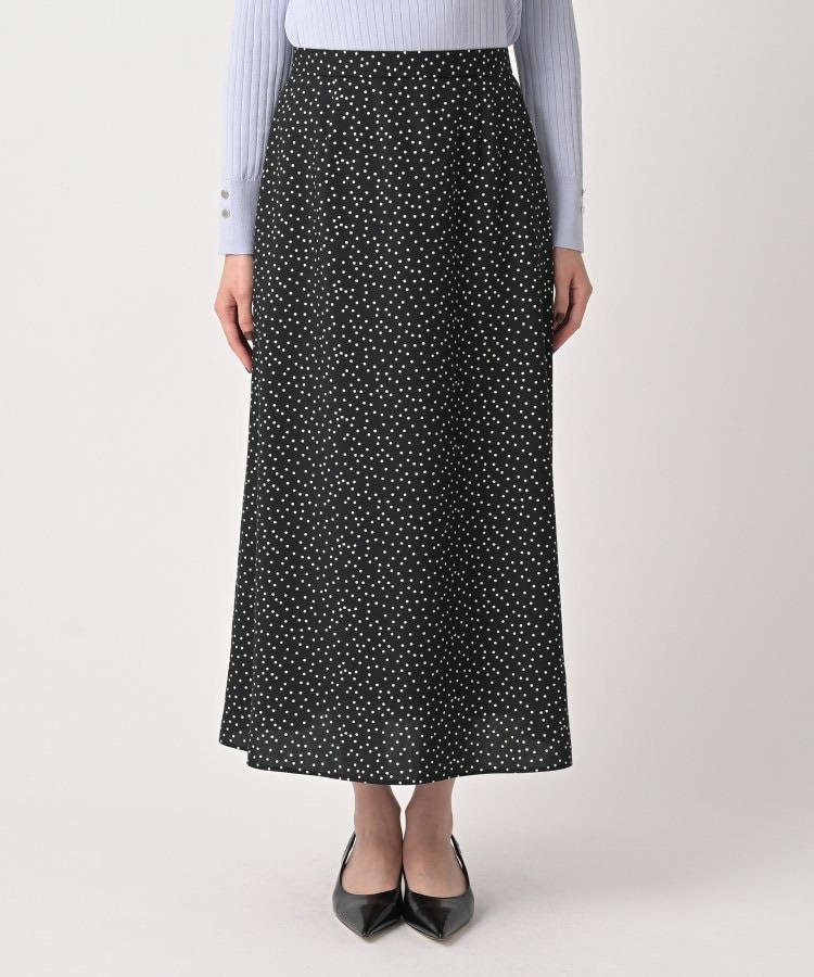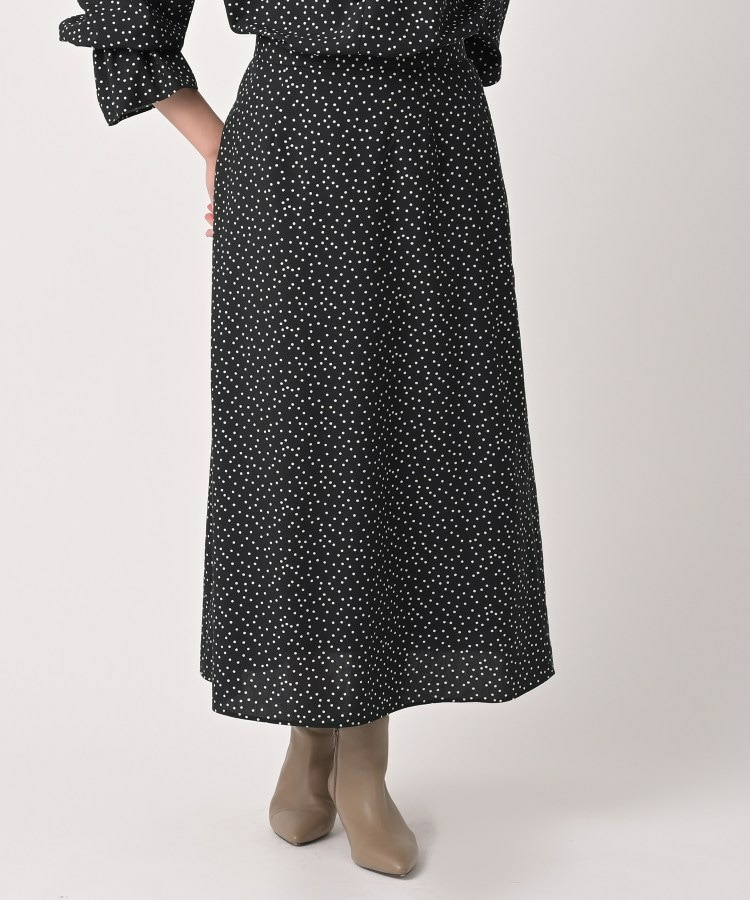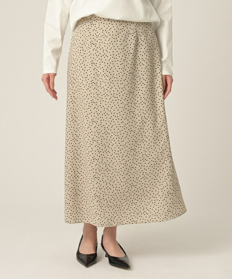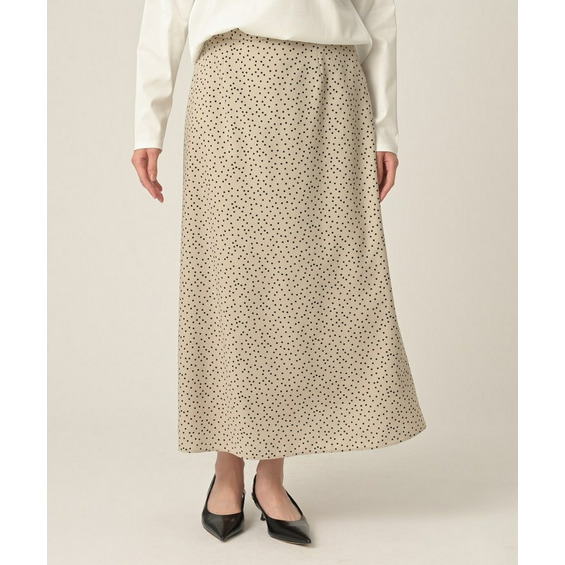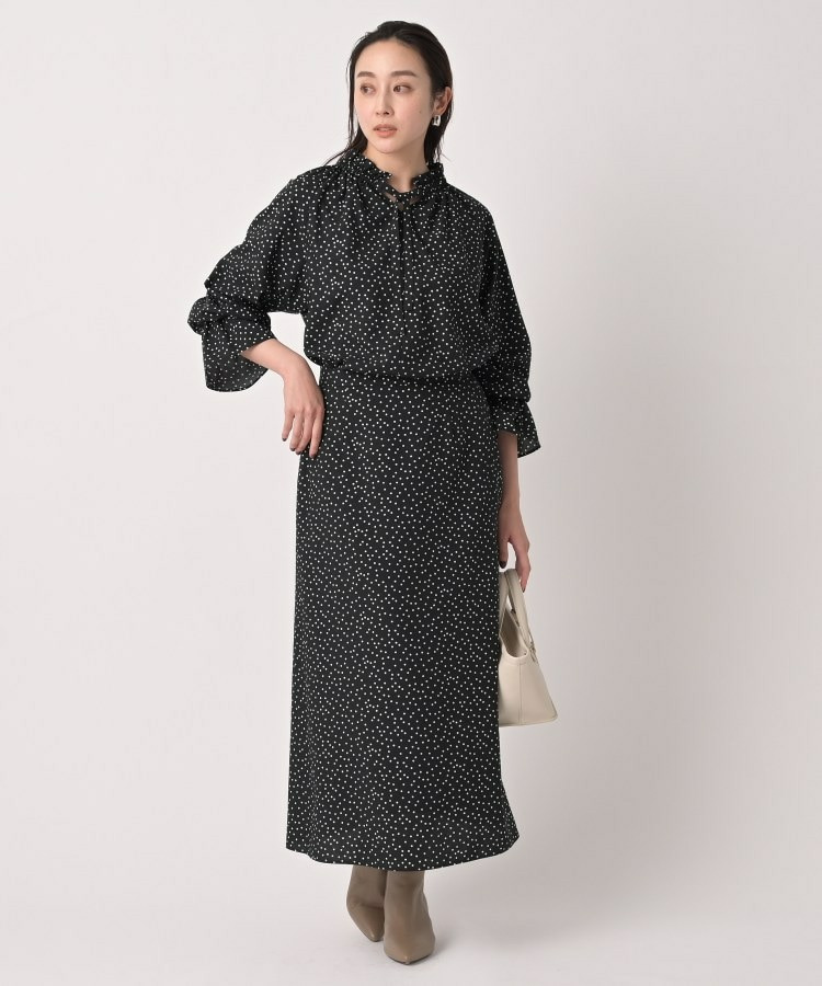 ランダムドット柄が軽やかなアクセントを添え、緩やかなフレアラインが自然に体型をカバーしながら優雅な印象を演出します。