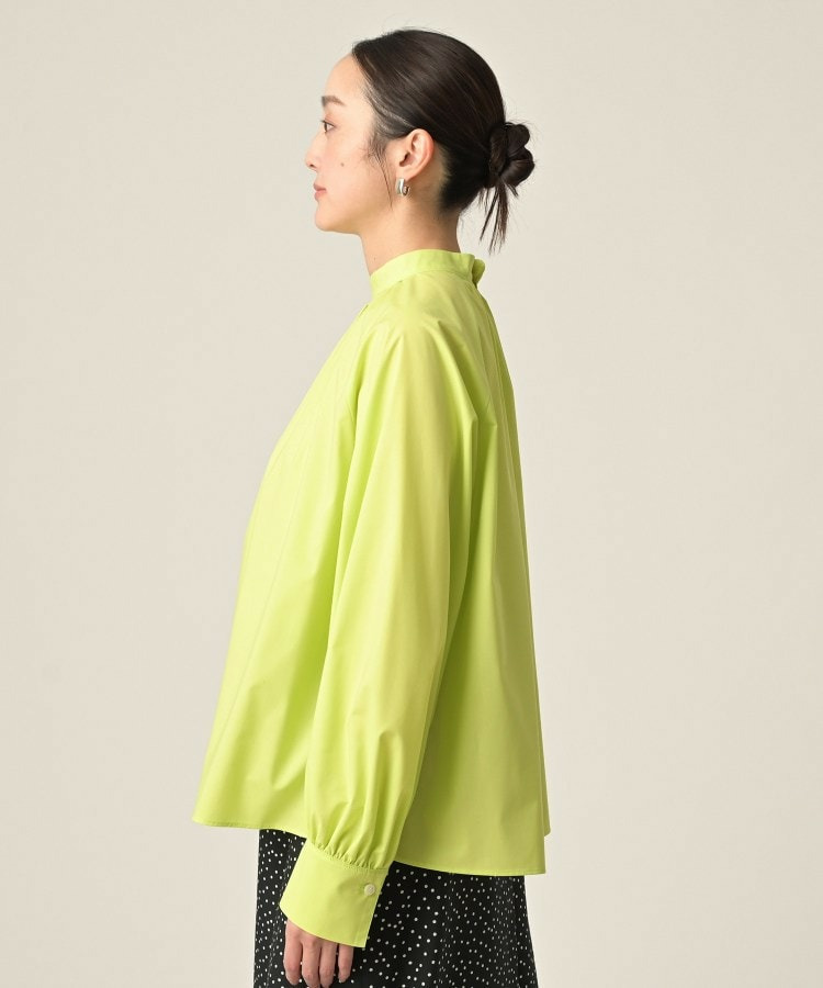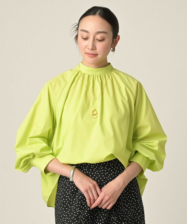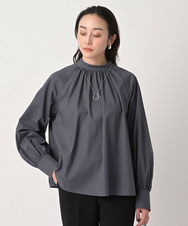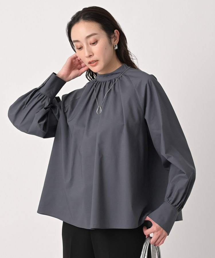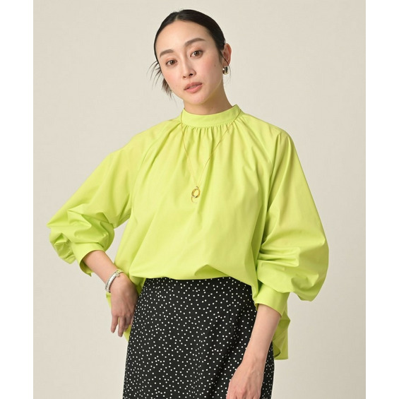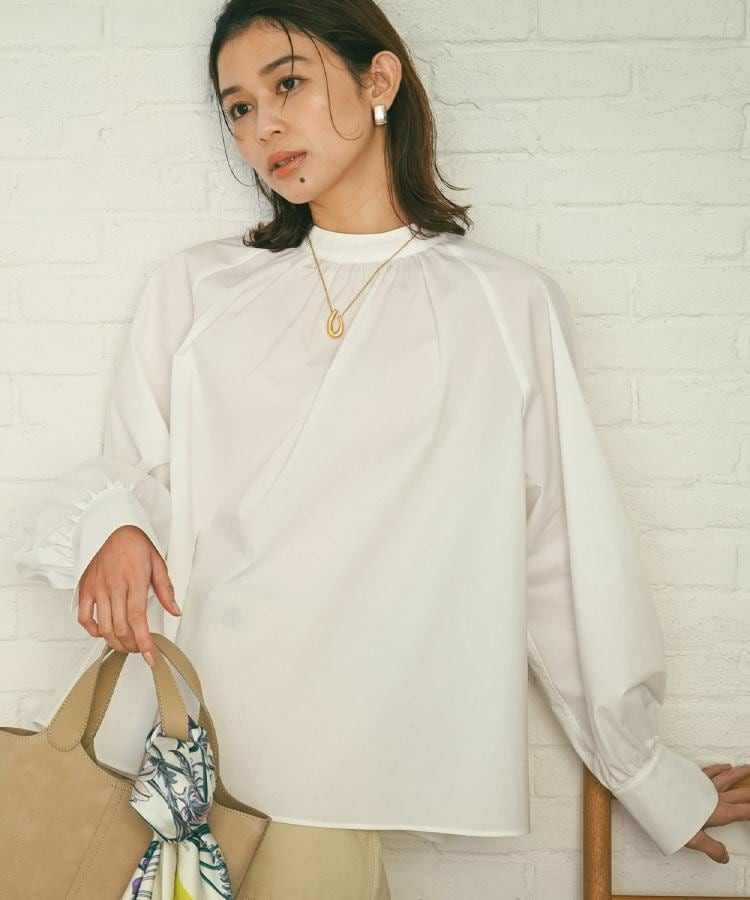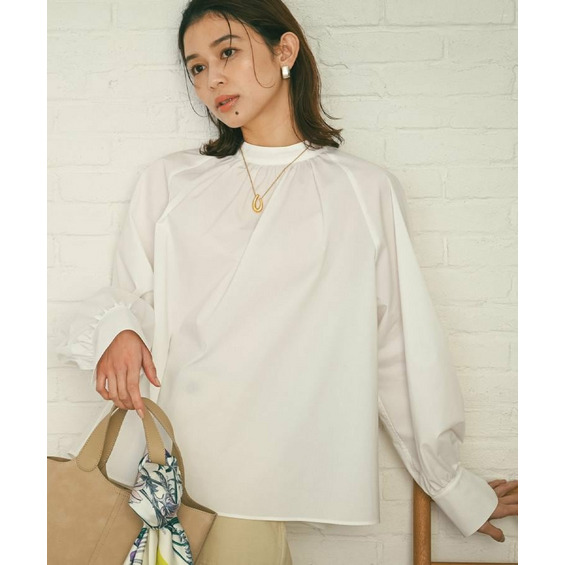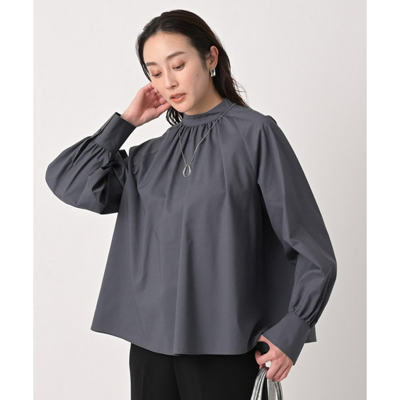 首まわりに上品なアクセントを添えてくれるスタンドネックがポイントのブラウス。