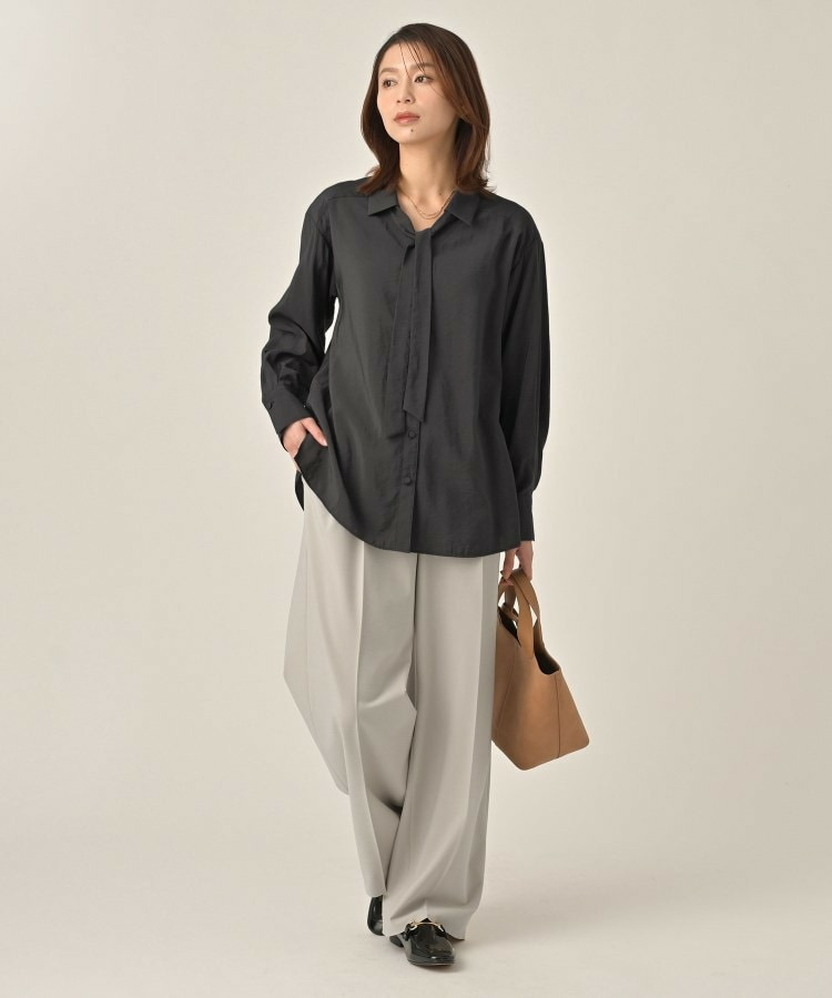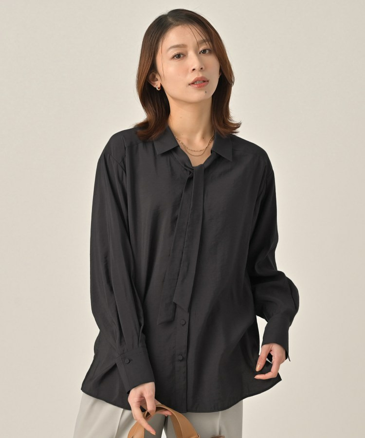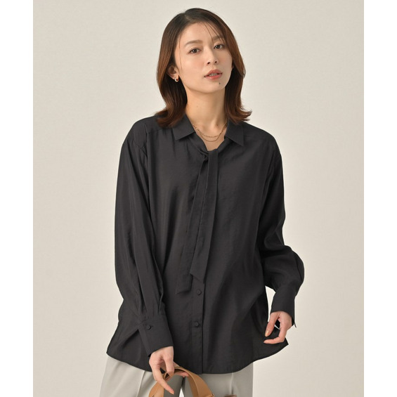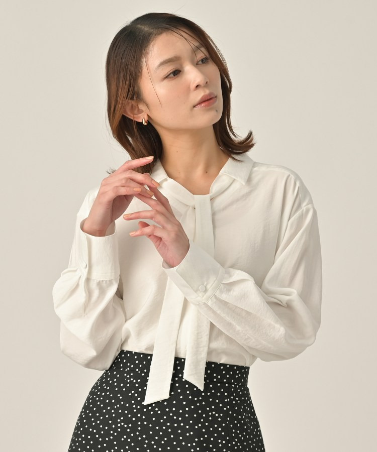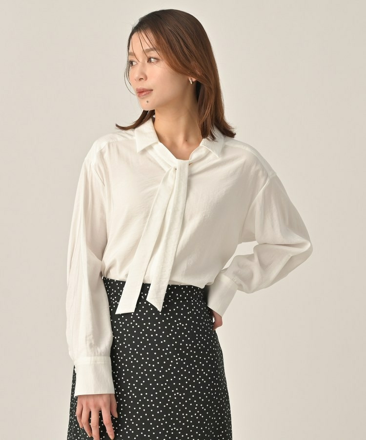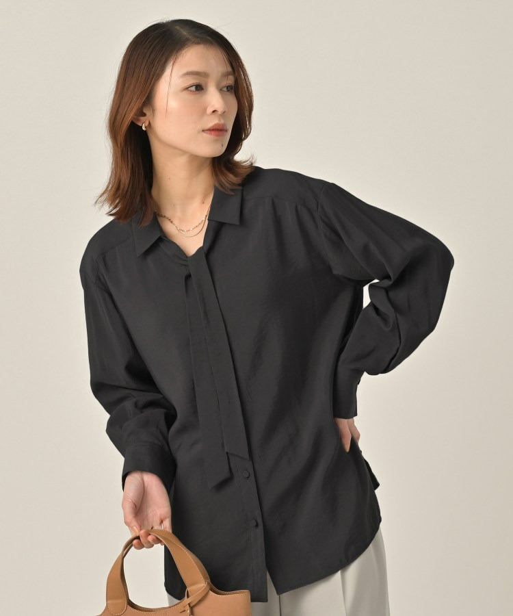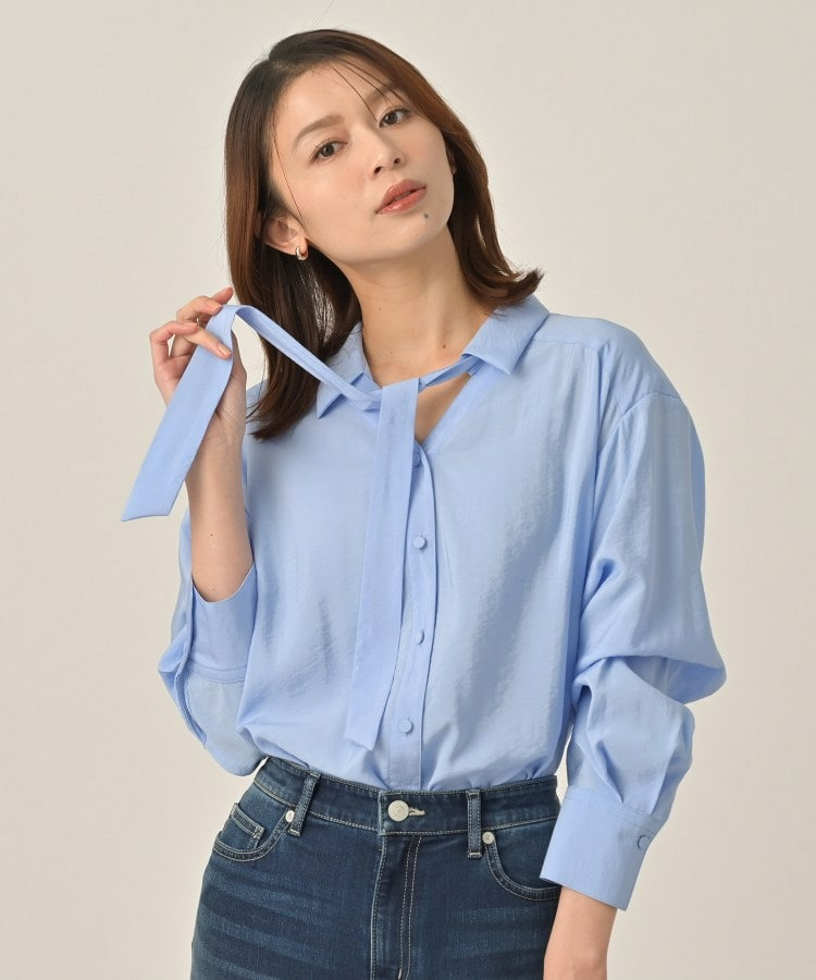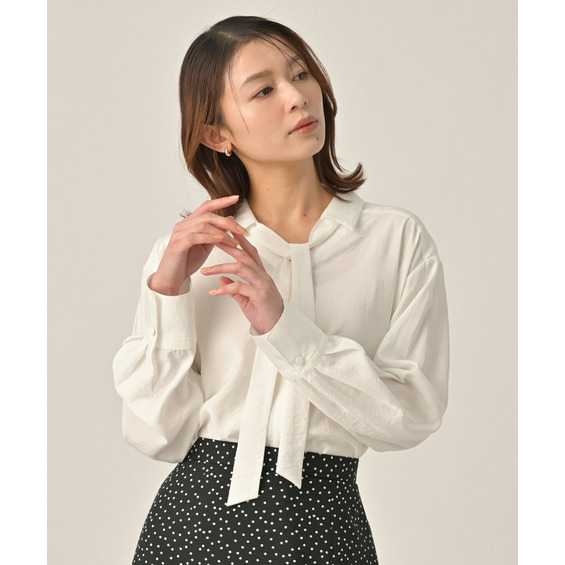 このボウタイを結べば上品でフェミニンな印象に、取り外せばシンプルでスタイリッシュなヘンリーネックスタイルへと早変わり。