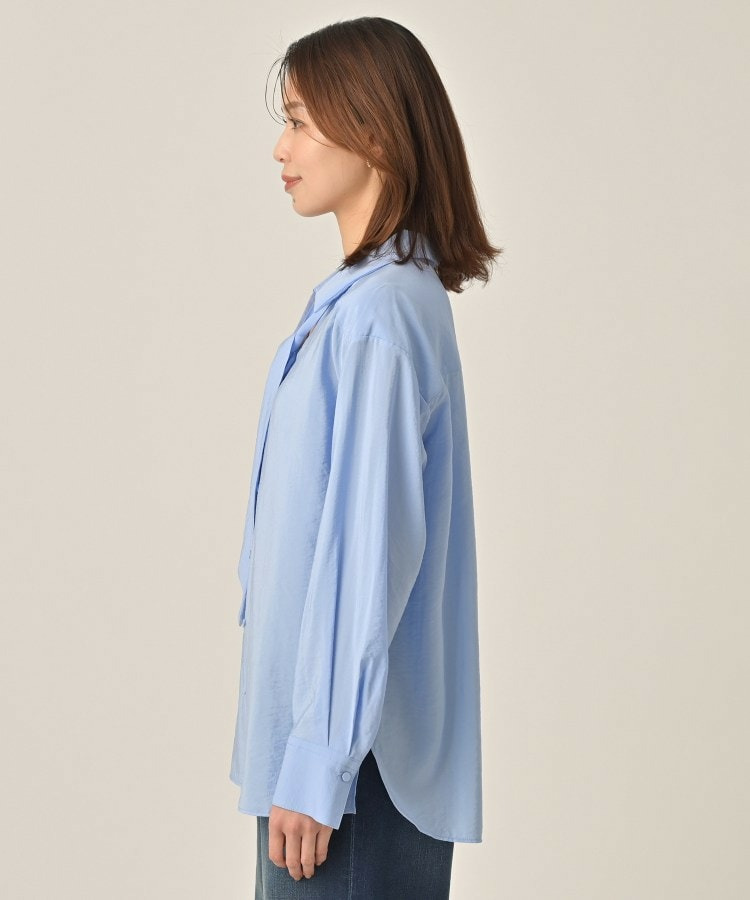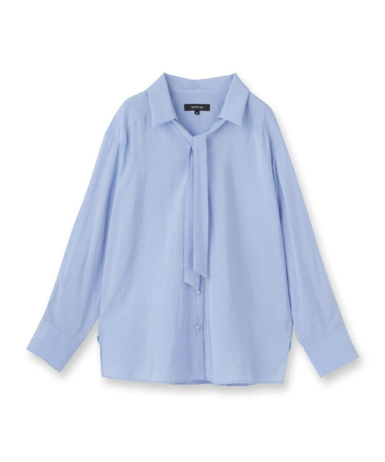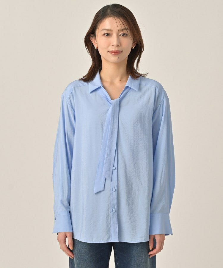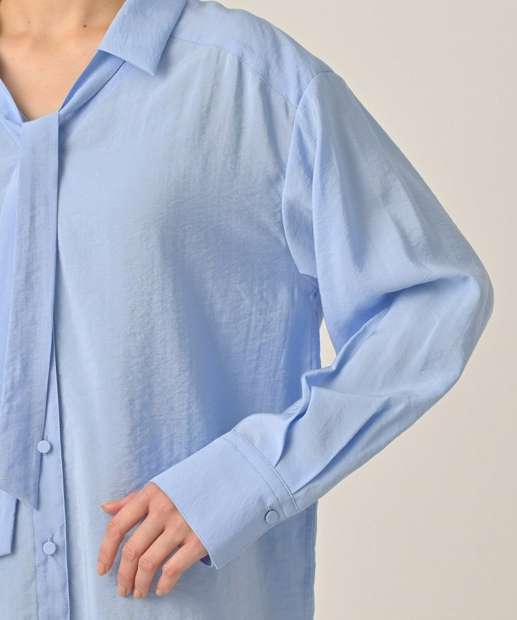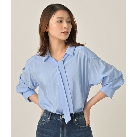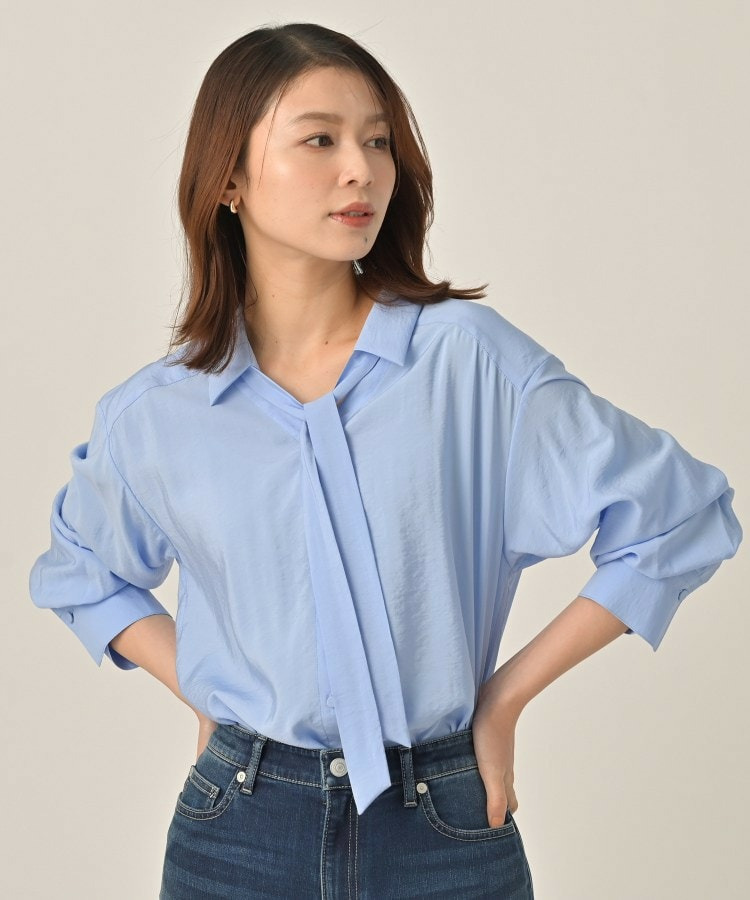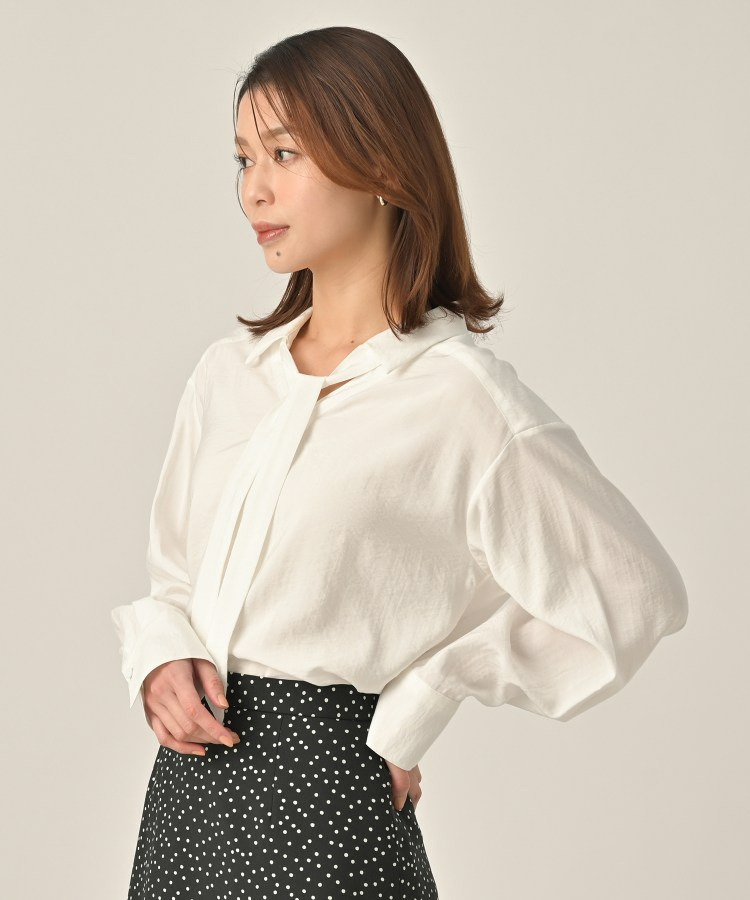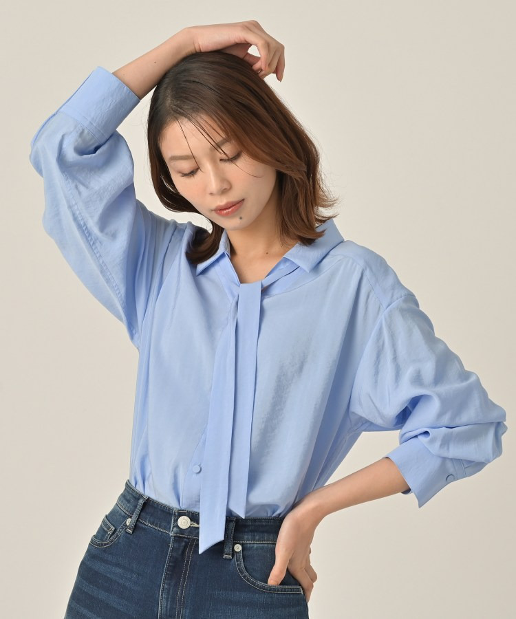 このボウタイを結べば上品でフェミニンな印象に、取り外せばシンプルでスタイリッシュなヘンリーネックスタイルへと早変わり。
