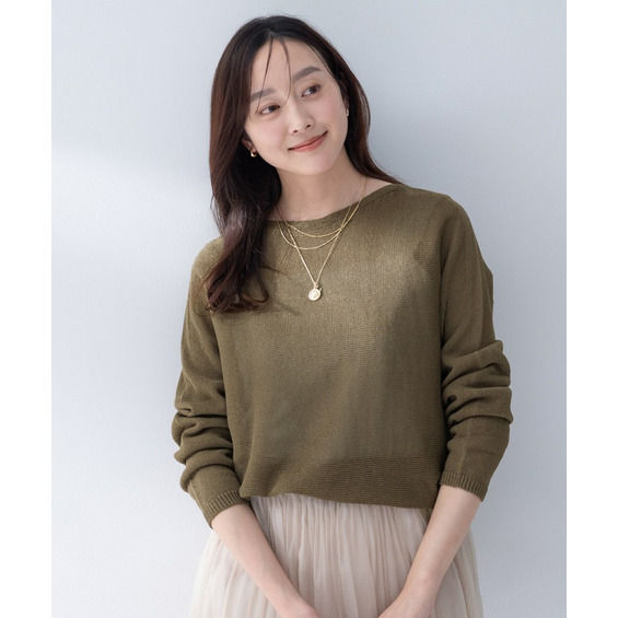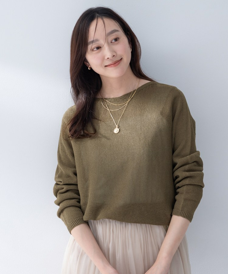 ざっくりした編地で、女性らしいボートネックが首元をすっきり見せてくれます。