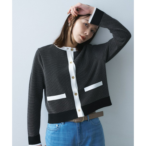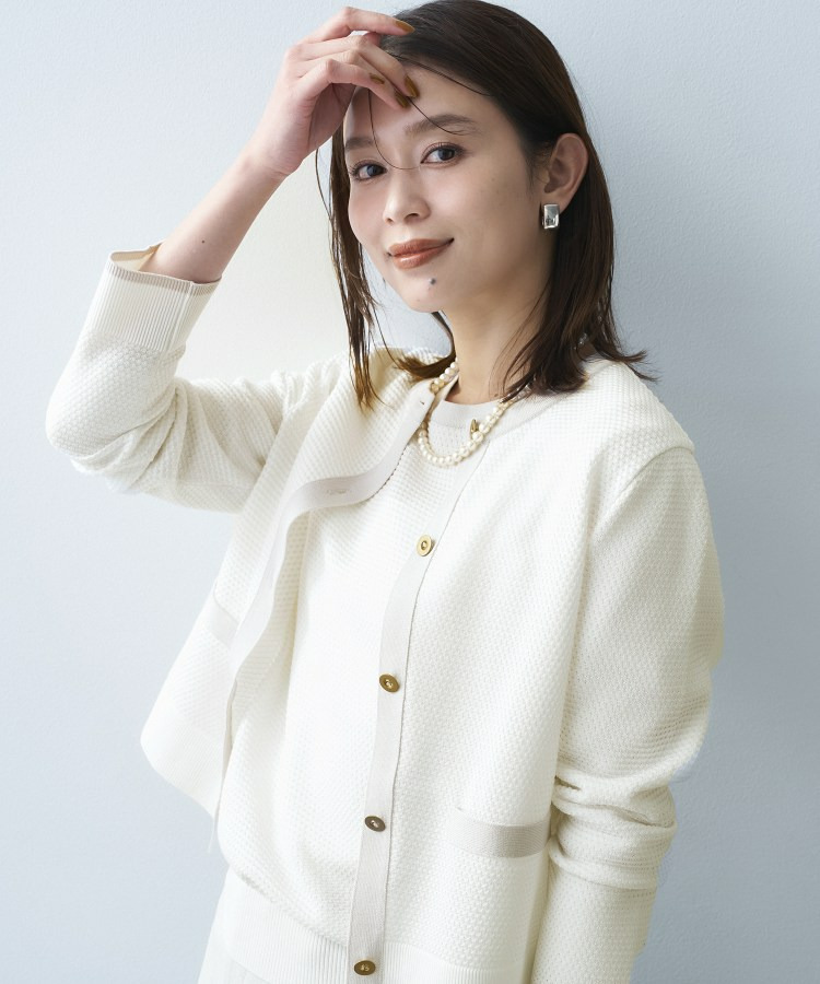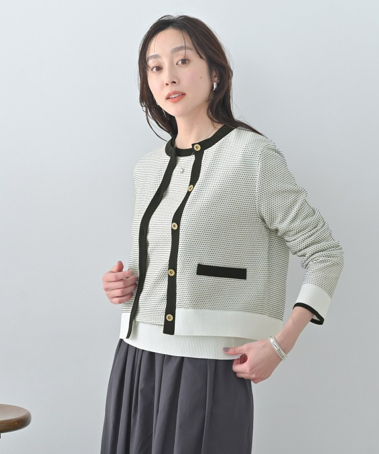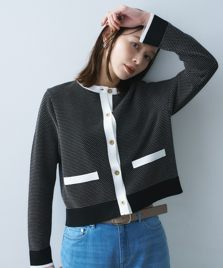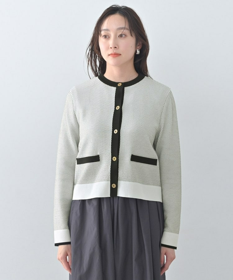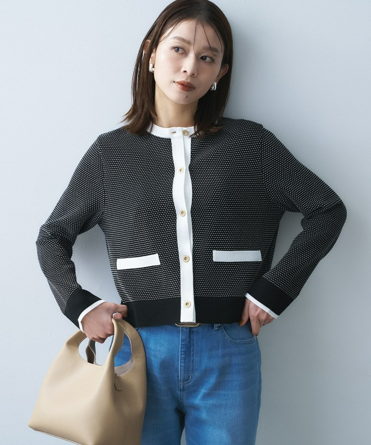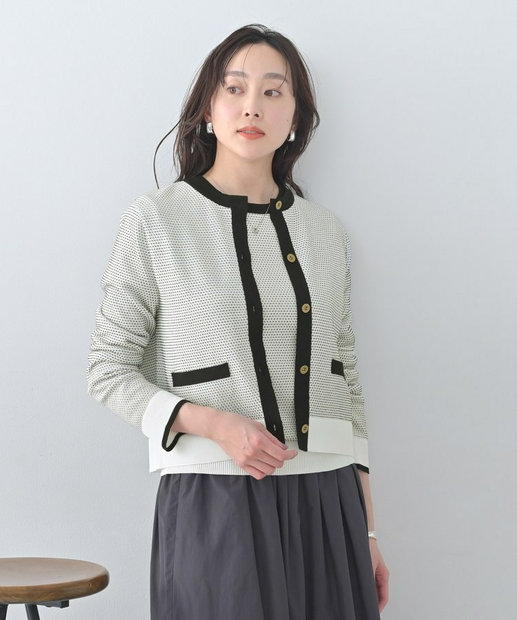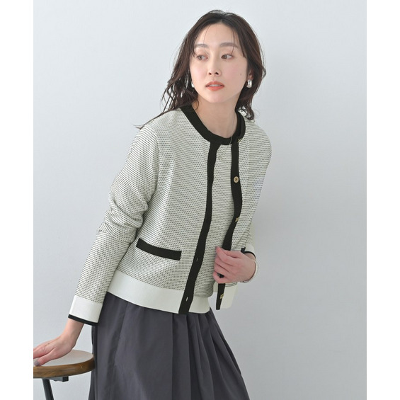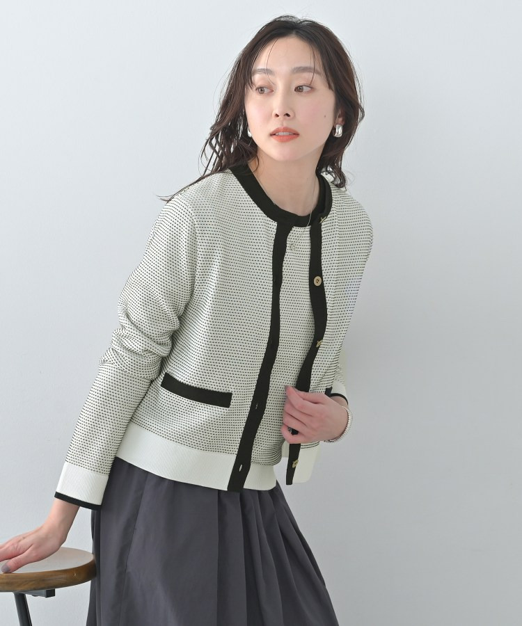 凹凸感のある地柄でツイード風の表情を表現したハイゲージニットカーディガン。