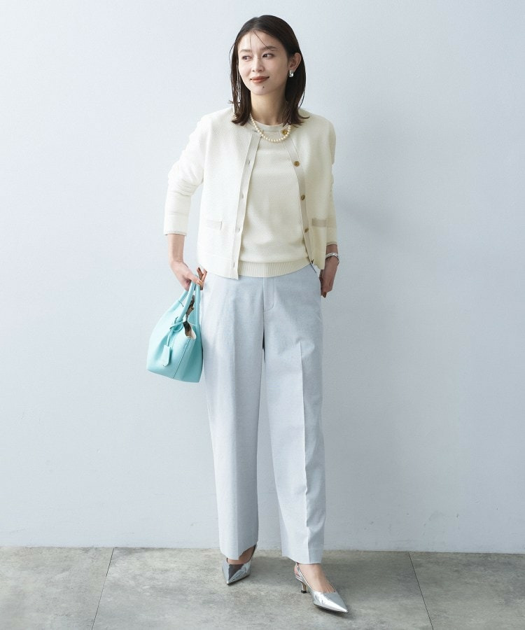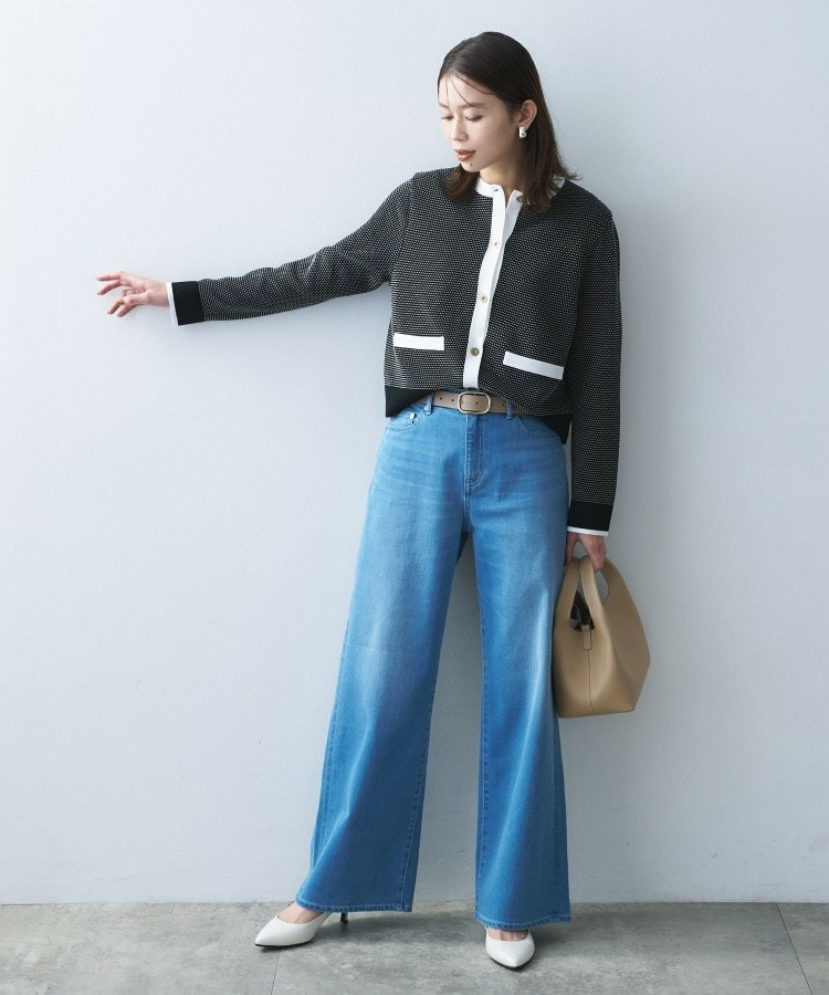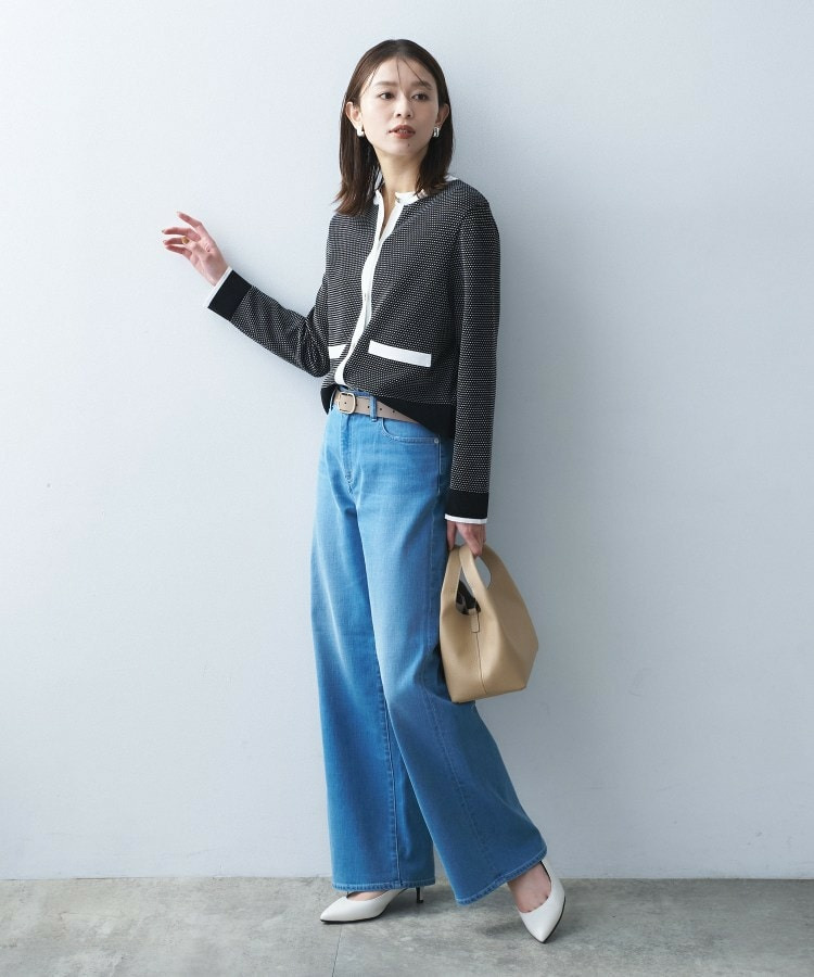 ワイドパンツに肩がけしてこなれ感をプラスする着こなしも素敵です。