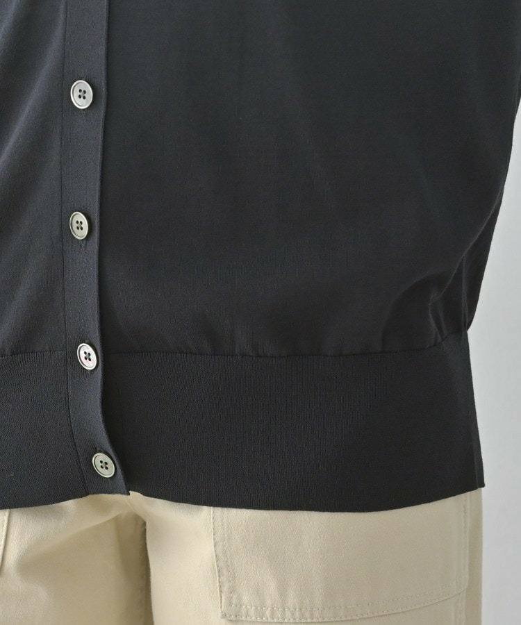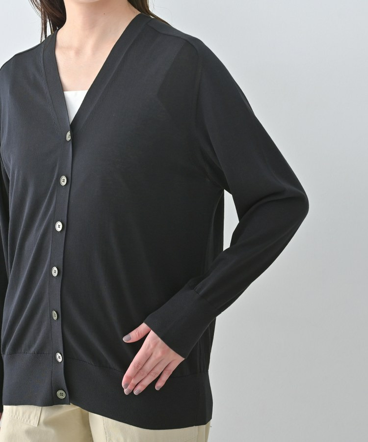 シャープな印象のVネックカーディガンはフロントボタンの仕様で着こなしの幅が広がるのが魅力。