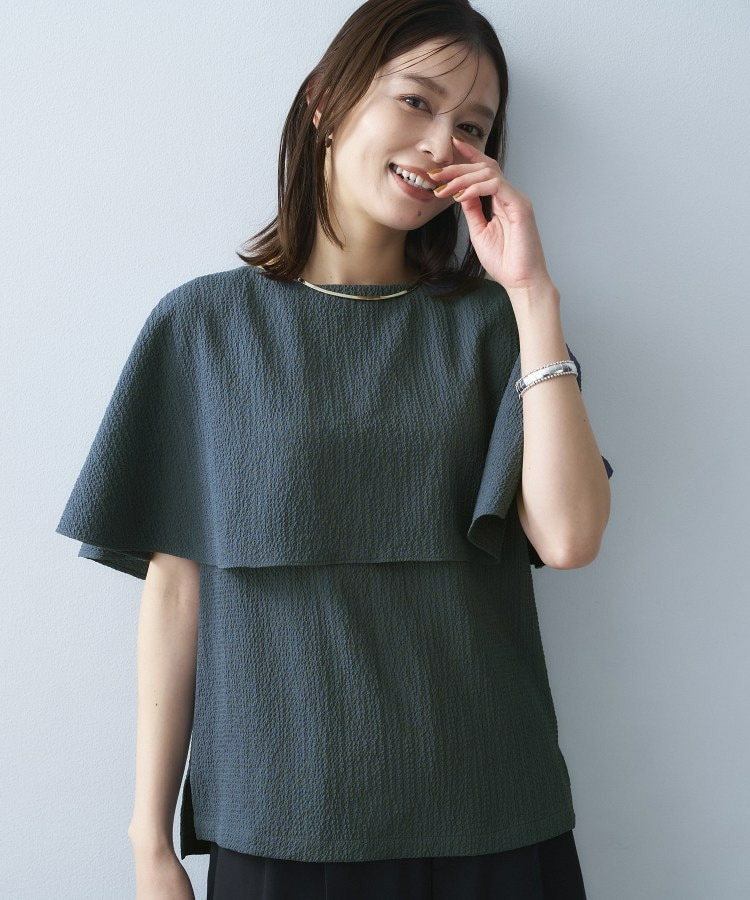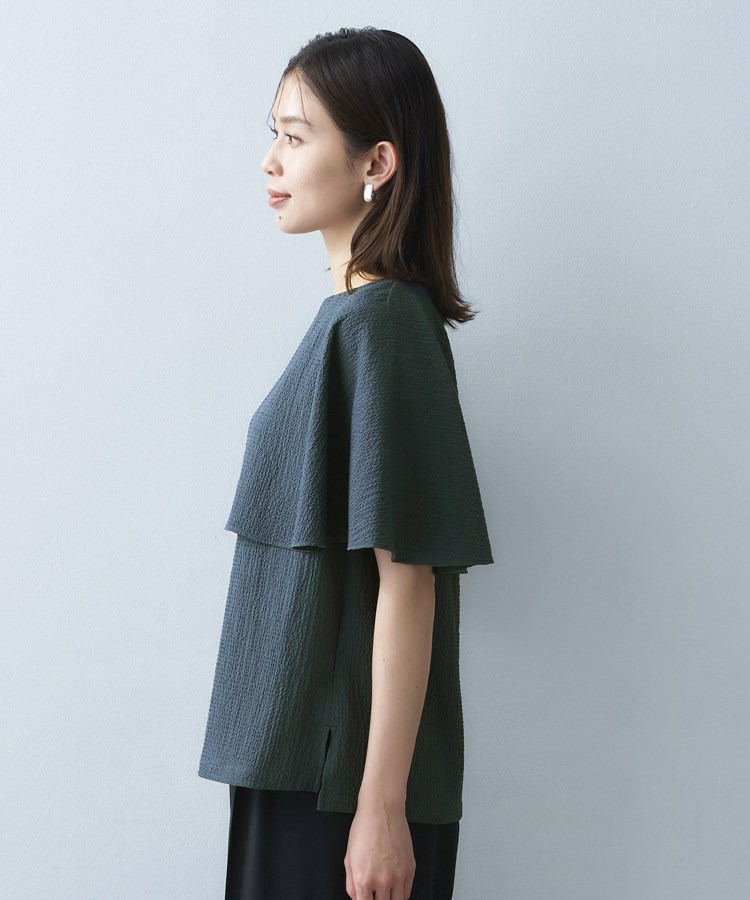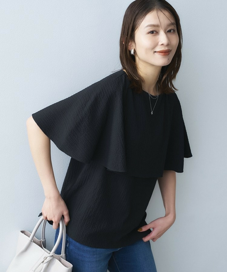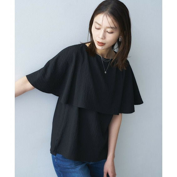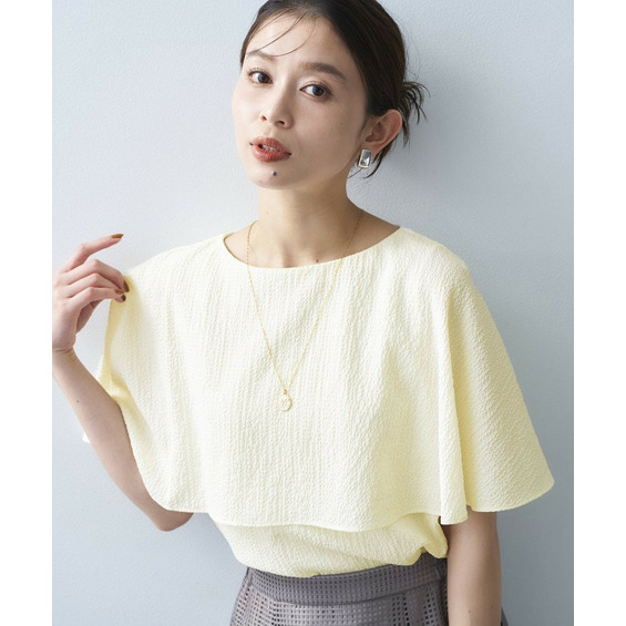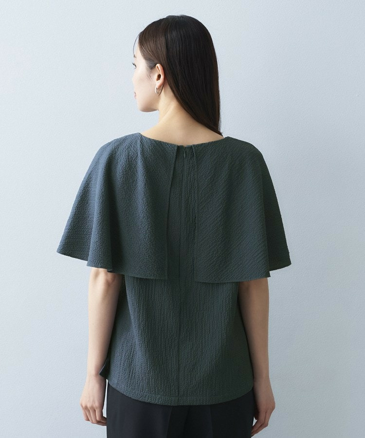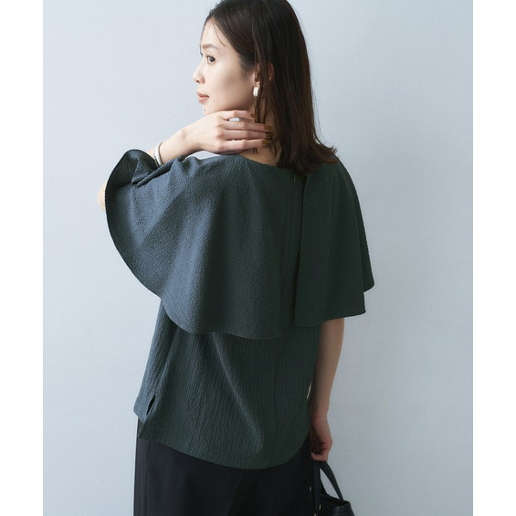 肩回りを優雅に引き立てるケープ風デザインが特徴のブラウス。