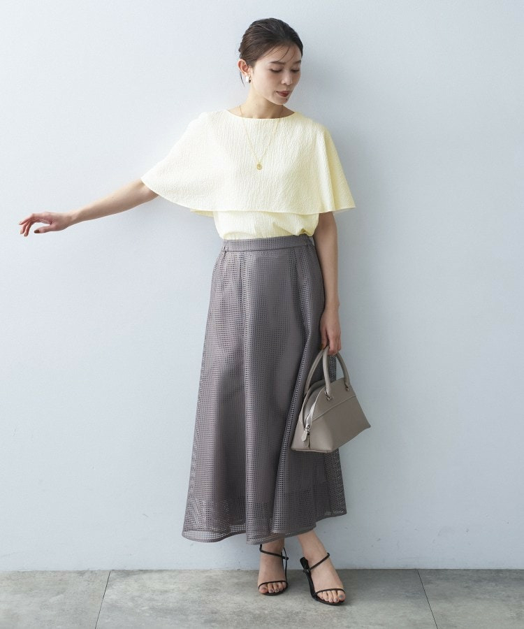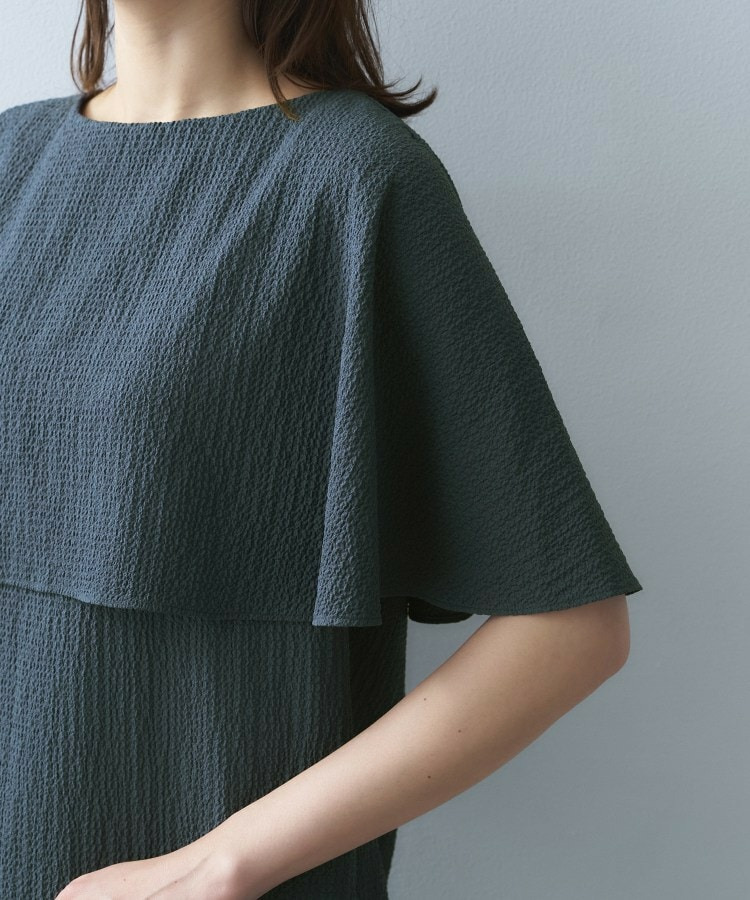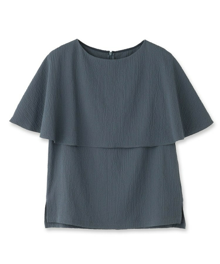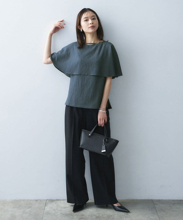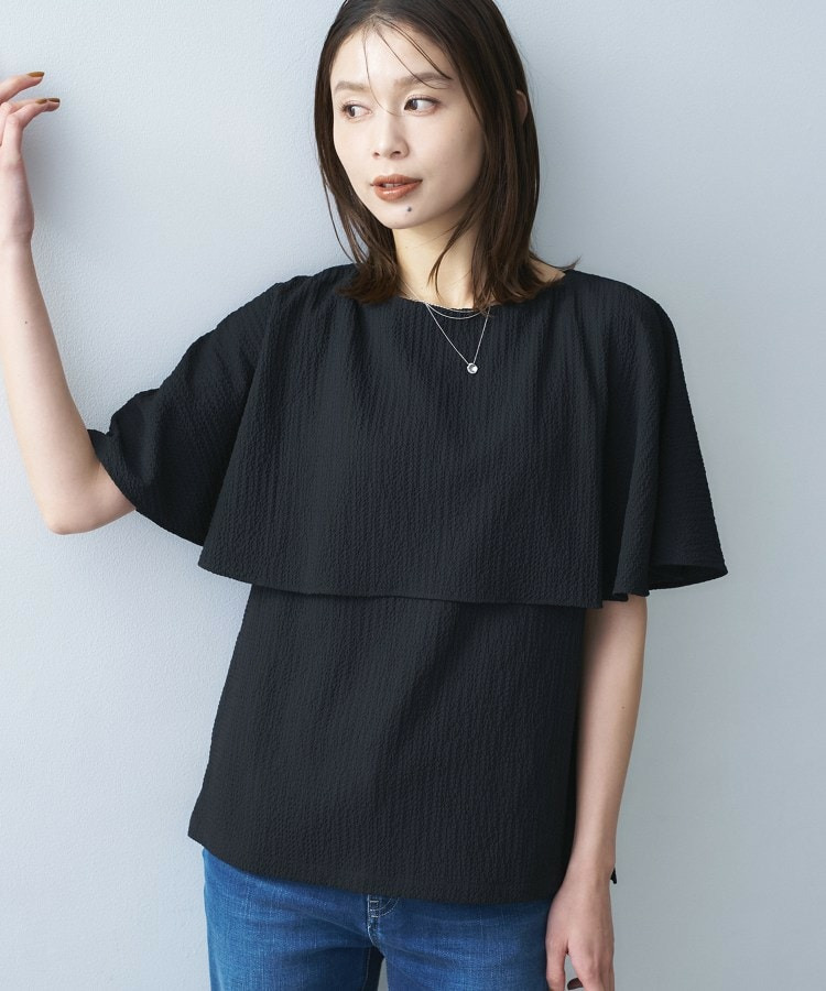 肩回りを優雅に引き立てるケープ風デザインが特徴のブラウス。