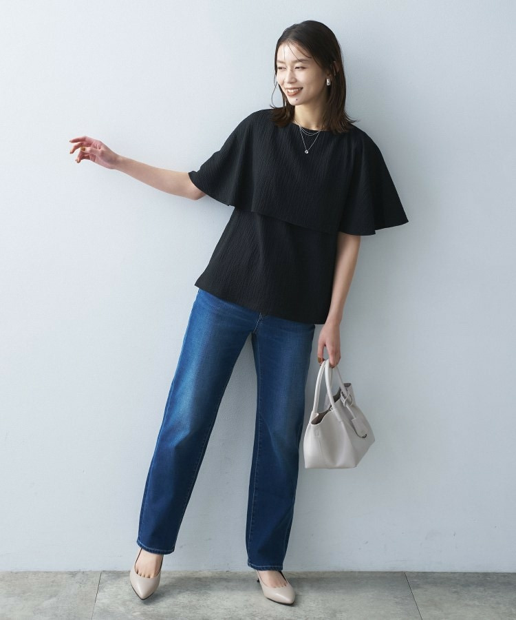 ほどよい抜け感のあるケープデザインは、デニムと合わせたカジュアルコーデにぴったり。