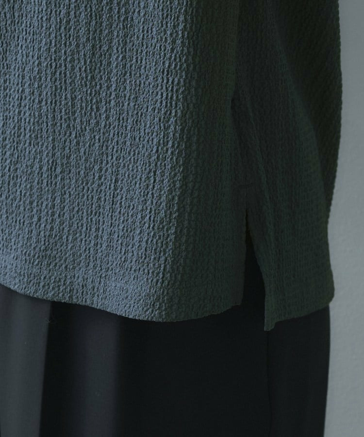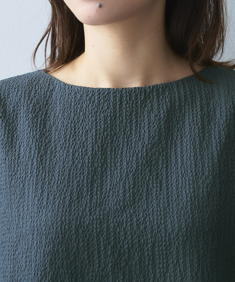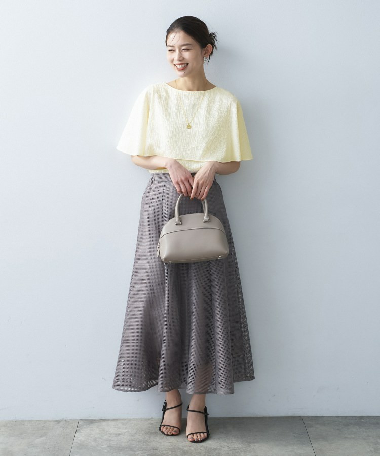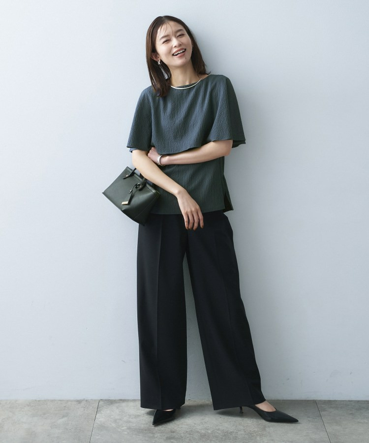 腕を細見せするフレンチスリーブ風の袖と、前後差のある裾デザインが全体をバランスよく仕上げています。