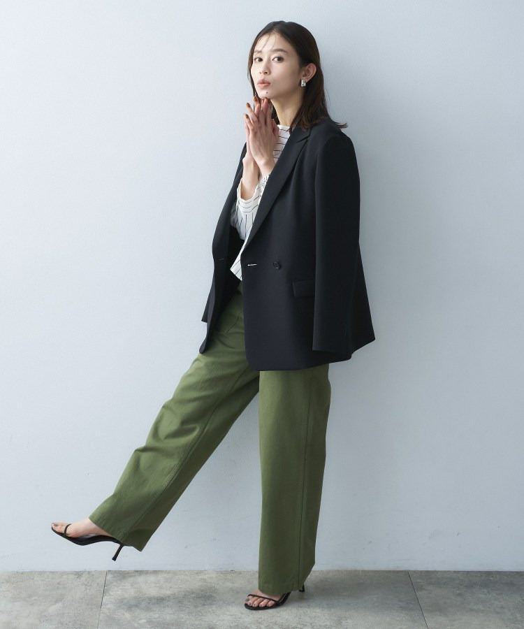 シャープなラインがスタイルを美しく引き立て、ストレートシルエットが知的で洗練された印象を演出します。