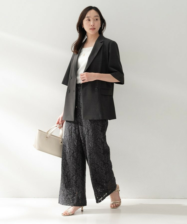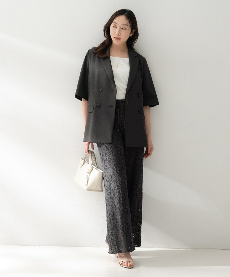 コードレース特有の張り感が美しい立体的なフォルムを生み出し、ただのイージーパンツとは一線を画する上品な仕上がりになっています。