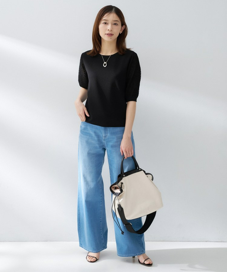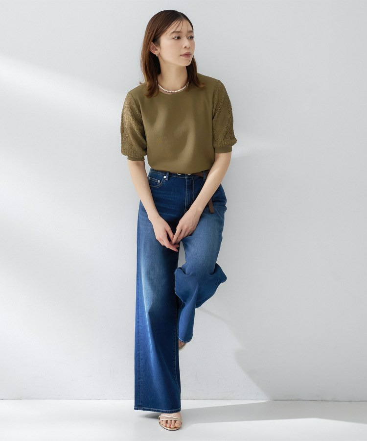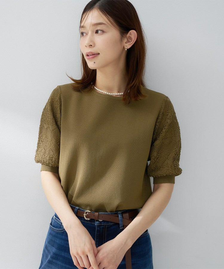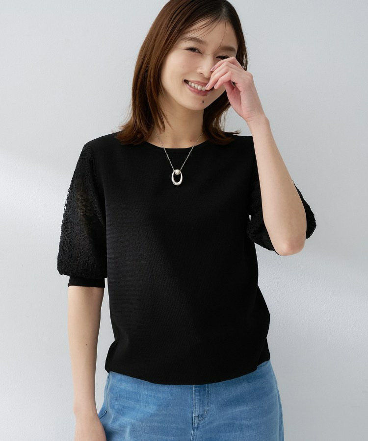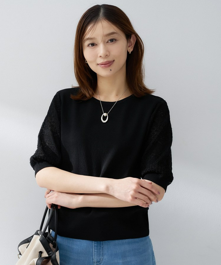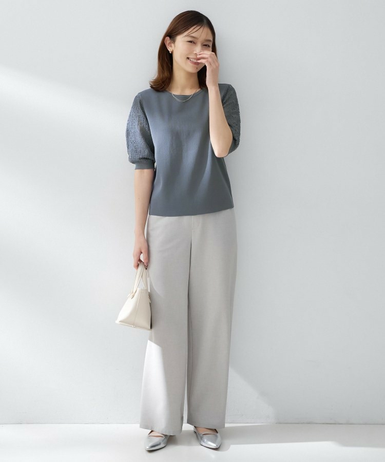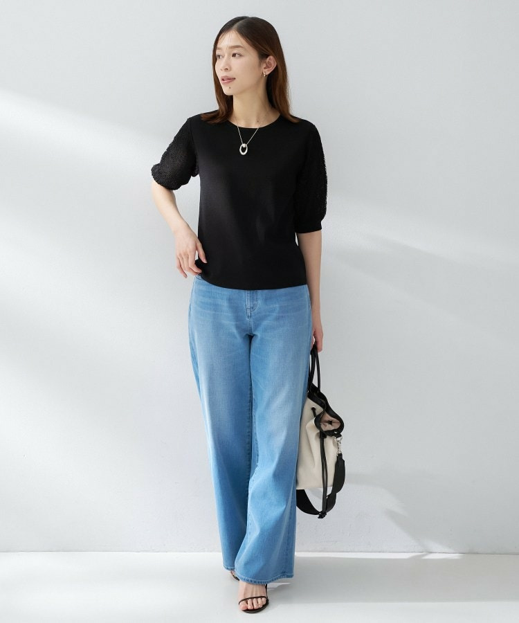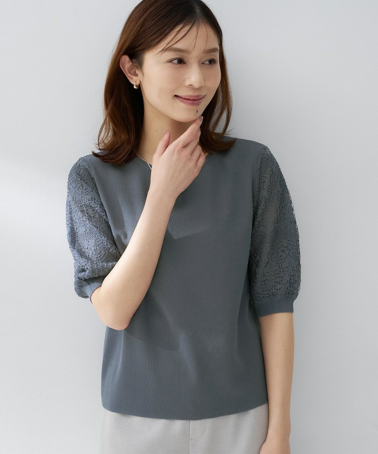 袖の繊細な透かし柄が印象的なニットトップス。