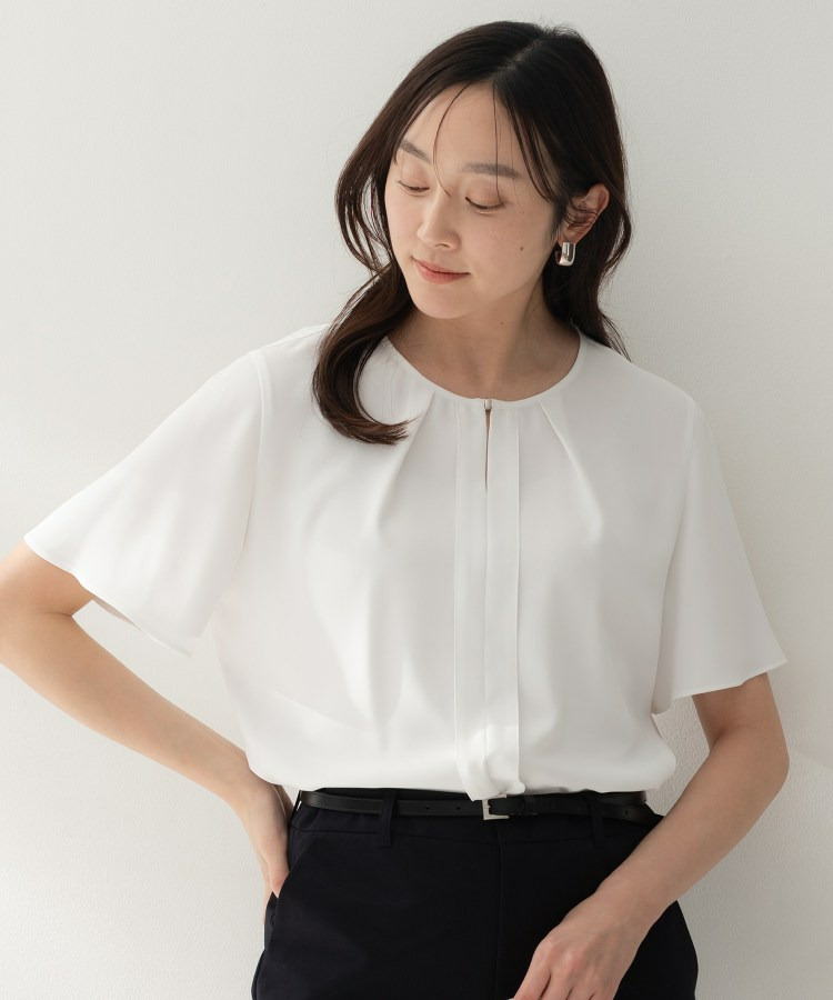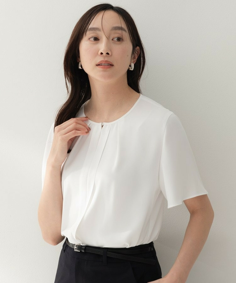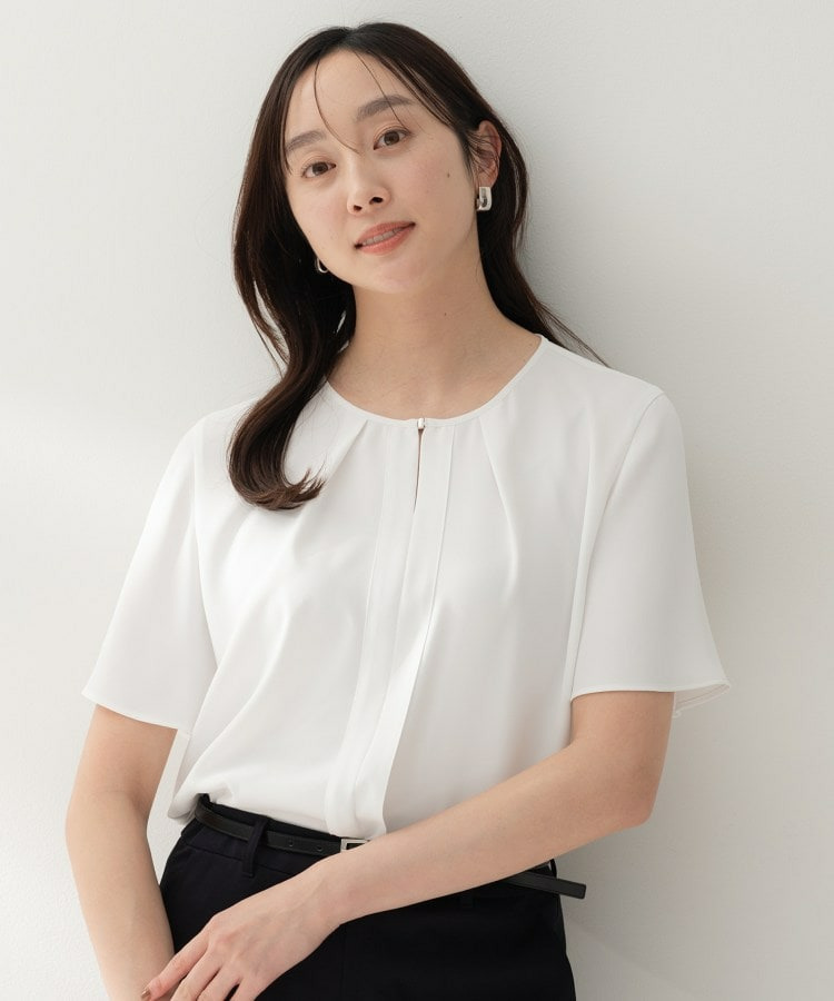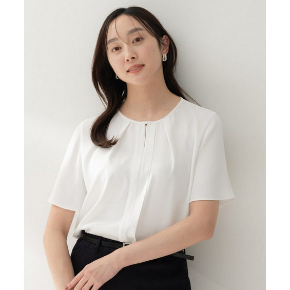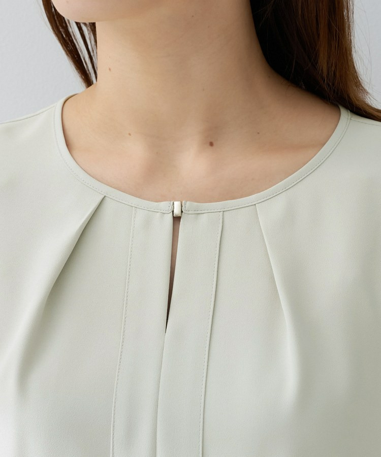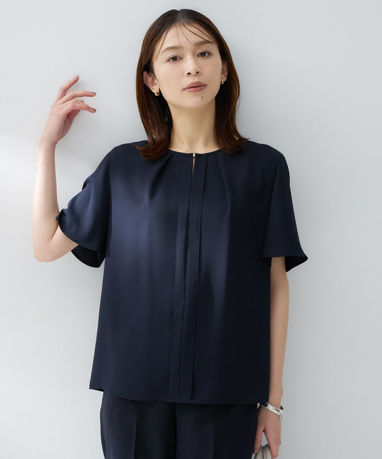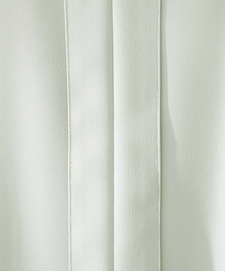 縦ラインディテールが印象的な、クリーンでミニマルなデザインのブラウス。