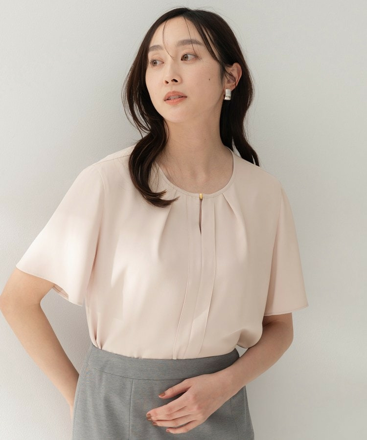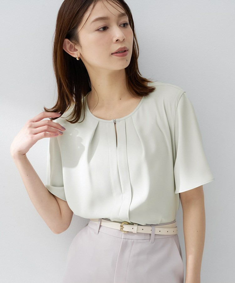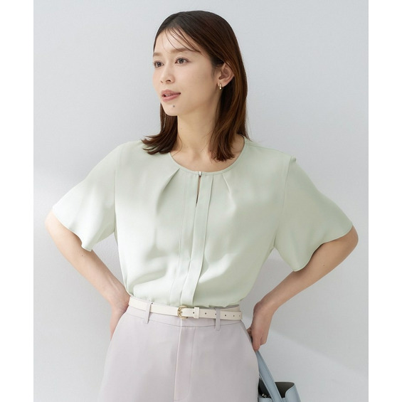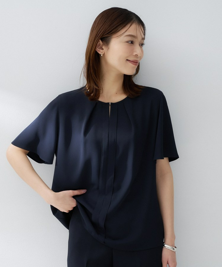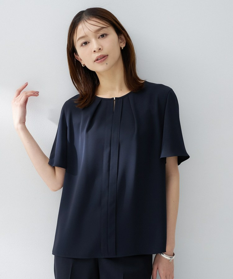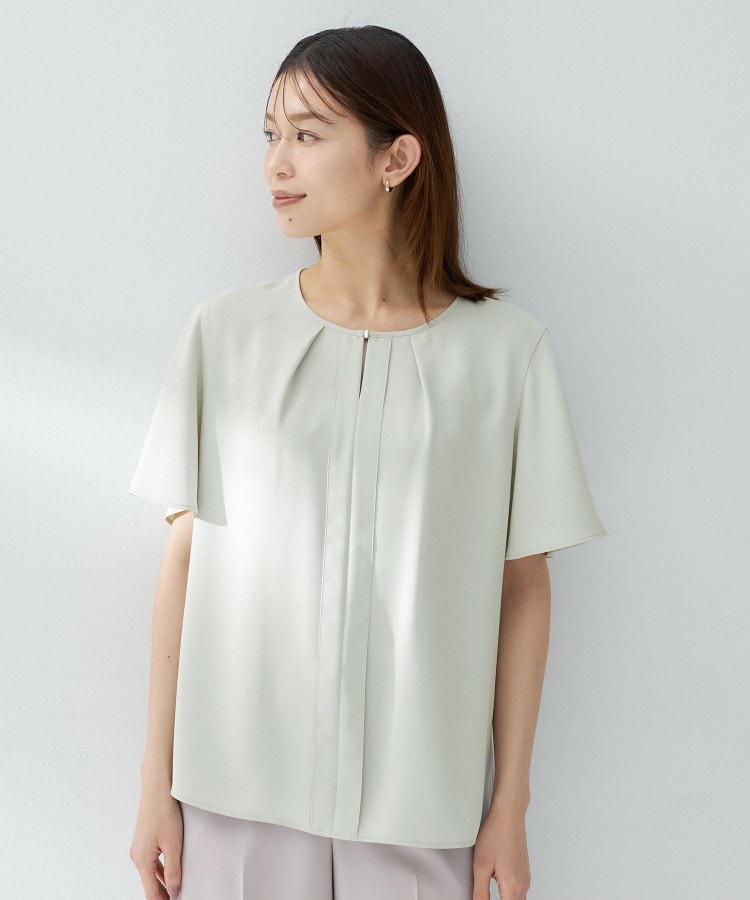 縦ラインディテールが印象的な、クリーンでミニマルなデザインのブラウス。